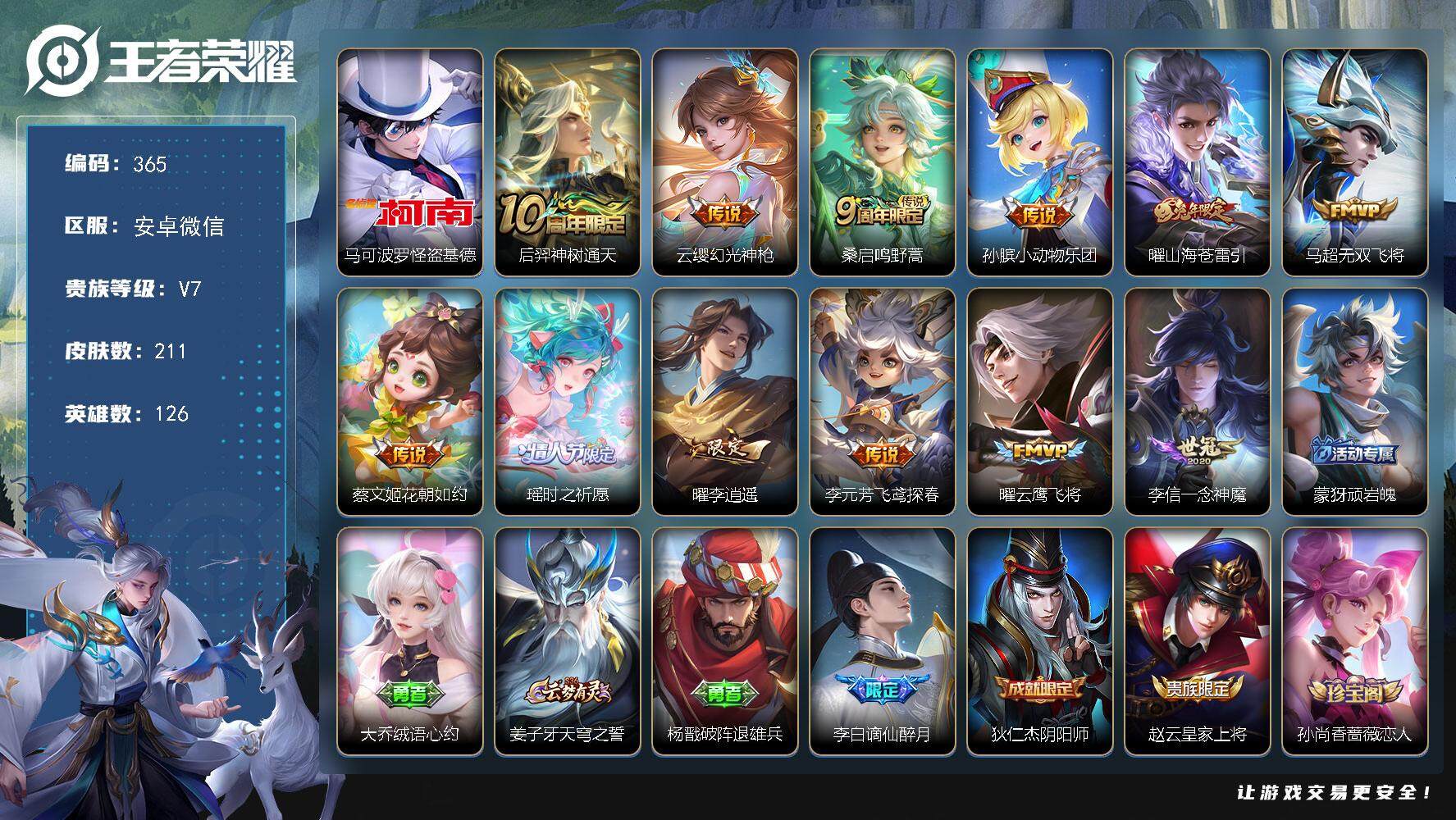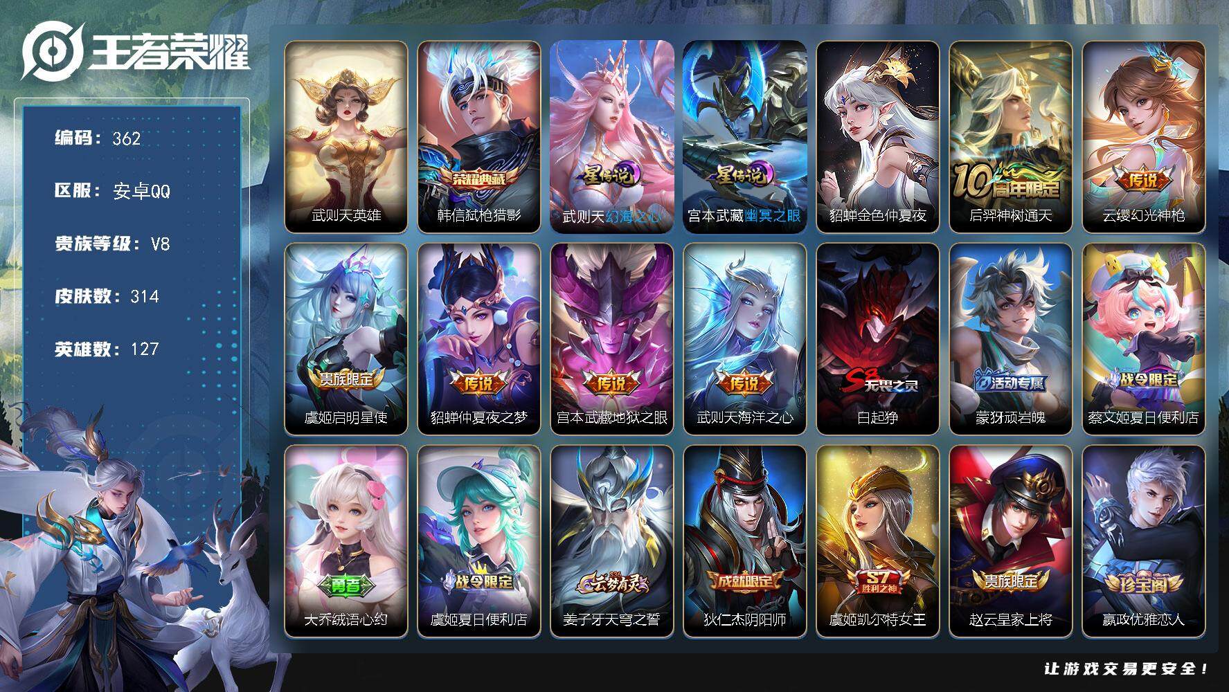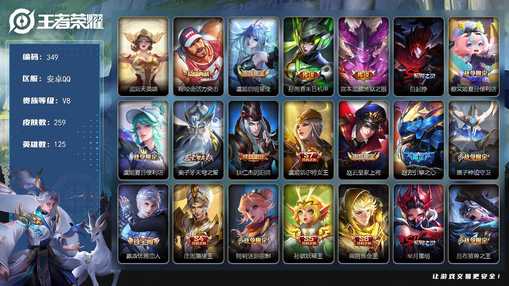 PX_2298192-Q-V8-至尊星耀V段位-125英雄-259皮肤-1典藏皮肤-1典藏英雄-3传说-58史诗 【英雄全皮】:影全皮 【荣耀典藏】:武则天英雄,程咬金活力突击 【传说皮肤】:虞姬启明星使,孙尚香末日机甲,宫本武藏地狱之眼 【限定皮肤】:白起狰,蔡文姬夏日便利店,虞姬夏日便利店,姜子牙天穹之誓,狄仁杰阴阳师,虞姬凯尔特女王,赵云皇家上将,赵云引擎之心,墨子神迹守卫,嬴政优雅恋人,庄周蜃楼王,阿轲迷踪丽影,孙膑妖精王,扁鹊炼金王,芈月重明,吕布猎兽之王,吕布御风骁将,周瑜赤莲之焰,夏侯惇朔风刀,甄姬游园惊梦,曹操烛龙,典韦穷奇,典韦蓝屏警告,狄仁杰魔术师,狄仁杰万华元夜,达摩星际陆战队,达摩沙漠行僧,项羽海滩派对,老夫子醍醐杖,关羽冰锋战神,程咬金演武夺筹,刘邦夺宝奇兵,兰陵王驯魔猎人,兰陵王金庭之子,孙悟空美猴王,孙悟空至尊宝,牛魔御旌,后羿辉光之辰,李元芳银河之约,李元芳云中旅人,虞姬启明星使,钟馗神迹守卫,钟馗驱傩正仪,杨玉环遇见飞天,女娲朔望之晖,哪吒逐梦之翼,雅典娜单词大作战,蔡文姬繁星吟游,太乙真人饕餮,鬼谷子原初探秘者,鬼谷子五谷丰年,苏烈千军破阵,弈星混沌棋,沈梦溪星空之诺,沈梦溪大漠名商,明世隐疑决卦,裴擒虎李小龙,裴擒虎擒涛扼浪,狂铁御狮,米莱狄御霄,云中君纤云弄巧,伽罗天狼溯光者,盾山御銮,上官婉儿梁祝,蒙犽狂想玩偶喵,鲁班大师探海日志,桑启海盐诗旅,阿古朵江河有灵,张良古海寻踪,鬼谷子天穹祈灯,沈梦溪龙舞盛年,李元芳蔬乡物语 【年限皮肤】:孙悟空美猴王,后羿辉光之辰,吕布御风骁将 【赛季限定】:庄周蜃楼王,孙膑妖精王,扁鹊炼金王,白起狰,芈月重明,夏侯惇朔风刀,曹操烛龙,典韦穷奇,狄仁杰万华元夜,达摩沙漠行僧,老夫子醍醐杖,程咬金演武夺筹,兰陵王金庭之子,张良古海寻踪,牛魔御旌,李元芳云中旅人,虞姬凯尔特女王,钟馗驱傩正仪,太乙真人饕餮,鬼谷子原初探秘者,苏烈千军破阵,弈星混沌棋,沈梦溪大漠名商,明世隐疑决卦,裴擒虎擒涛扼浪,狂铁御狮,米莱狄御霄,盾山御銮,鲁班大师探海日志,桑启海盐诗旅,鬼谷子天穹祈灯,姜子牙天穹之誓 【战令限定】:墨子神迹守卫,蔡文姬夏日便利店,虞姬夏日便利店,阿轲迷踪丽影,吕布猎兽之王,周瑜赤莲之焰,典韦蓝屏警告,达摩星际陆战队,刘邦夺宝奇兵,兰陵王驯魔猎人,李元芳银河之约,钟馗神迹守卫,女娲朔望之晖,雅典娜单词大作战,沈