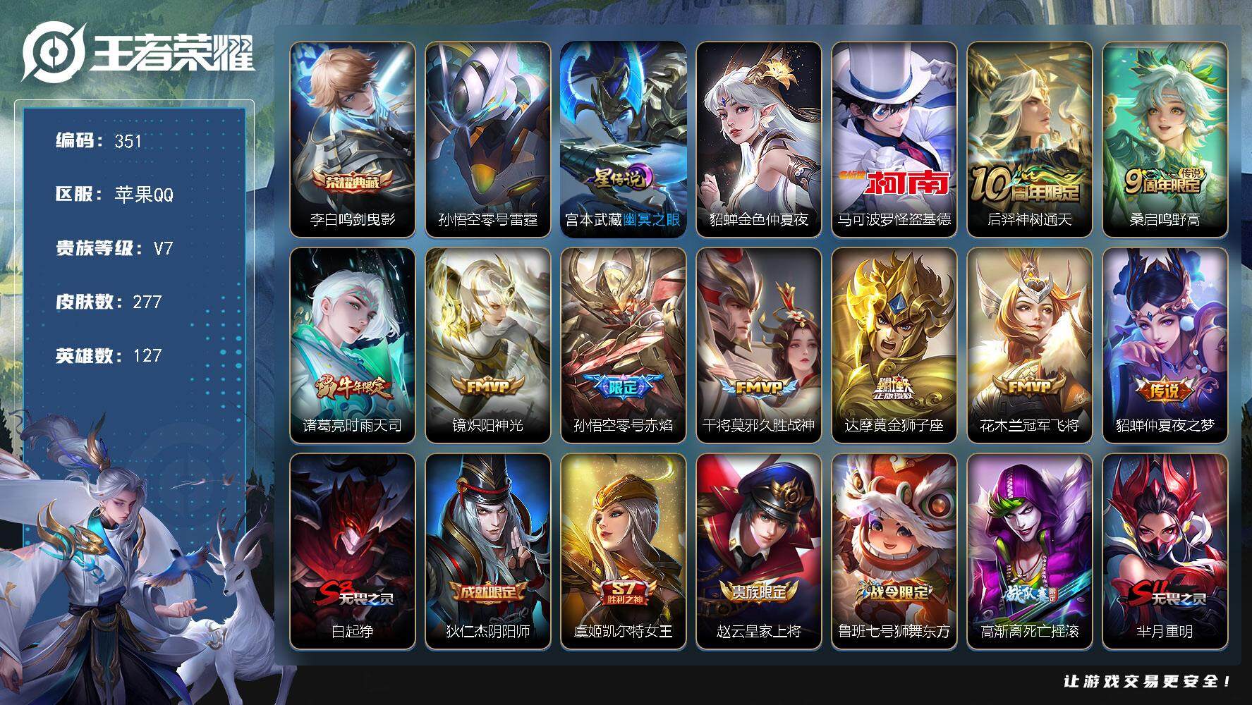 PX_2298193-Q-V7-最强王者段位-发育路20段,对抗路18段127英雄-277皮肤-1典藏皮肤-1珍品传说3星元零号雷霆,幽冥之眼,金色仲夏夜,-9传说-66史诗 【英雄全皮】:孙权全皮,蒙恬全皮 【荣耀典藏】:李白鸣剑曳影 【珍品传说】:马可波罗怪盗基德 【传说皮肤】:后羿神树通天,桑启鸣野蒿,诸葛亮时雨天司,镜炽阳神光,孙悟空零号赤焰,干将莫邪久胜战神,达摩黄金狮子座,花木兰冠军飞将,貂蝉仲夏夜之梦 【限定皮肤】:白起狰,狄仁杰阴阳师,虞姬凯尔特女王,赵云皇家上将,鲁班七号狮舞东方,高渐离死亡摇滚,芈月重明,周瑜赤莲之焰,元歌云间偶戏,夏侯惇朔风刀,甄姬游园惊梦,曹操烛龙,典韦穷奇,狄仁杰魔术师,狄仁杰万华元夜,达摩沙漠行僧,项羽海滩派对,老夫子醍醐杖,老夫子航海奇遇记,程咬金演武夺筹,韩信飞衡,兰陵王驯魔猎人,兰陵王金庭之子,亚瑟潮玩骑士王,孙悟空至尊宝,孙悟空零号赤焰,牛魔御旌,李元芳云中旅人,钟馗神迹守卫,钟馗驱傩正仪,杨玉环遇见飞天,雅典娜单词大作战,蔡文姬繁星吟游,太乙真人饕餮,鬼谷子原初探秘者,诸葛亮时雨天司,百里玄策原初追逐者,弈星混沌棋,沈梦溪大漠名商,明世隐疑决卦,裴擒虎李小龙,裴擒虎擒涛扼浪,狂铁御狮,米莱狄御霄,云中君纤云弄巧,盾山御銮,上官婉儿梁祝,嫦娥拒霜思,蒙犽狂想玩偶喵,鲁班大师探海日志,桑启海盐诗旅,艾琳女武神,阿古朵江河有灵,张良古海寻踪,蒙犽百解令,蒙恬荣光圣徽,高渐离燃音魔法,妲己灵卜魔法,鬼谷子天穹祈灯,伽罗琥珀纪元,姬小满妄想食味,沈梦溪龙舞盛年,李元芳蔬乡物语,关羽决胜骁骑 【年限皮肤】:诸葛亮时雨天司,韩信飞衡 【赛季限定】:白起狰,芈月重明,夏侯惇朔风刀,曹操烛龙,典韦穷奇,狄仁杰万华元夜,达摩沙漠行僧,老夫子醍醐杖,程咬金演武夺筹,兰陵王金庭之子,张良古海寻踪,牛魔御旌,李元芳云中旅人,虞姬凯尔特女王,钟馗驱傩正仪,太乙真人饕餮,鬼谷子原初探秘者,百里玄策原初追逐者,弈星混沌棋,沈梦溪大漠名商,明世隐疑决卦,裴擒虎擒涛扼浪,狂铁御狮,米莱狄御霄,盾山御銮,鲁班大师探海日志,桑启海盐诗旅,鬼谷子天穹祈灯,蒙恬荣光圣徽 【战令限定】:鲁班七号狮舞东方,周瑜赤莲之焰,元歌云间偶戏,老夫子航海奇遇记,兰陵王驯魔猎人,亚瑟潮玩骑士王,钟馗神迹守卫,雅典娜单词大作战,蒙犽狂想玩偶喵,高渐离燃音魔法,妲己灵卜魔法,李元芳蔬乡物语