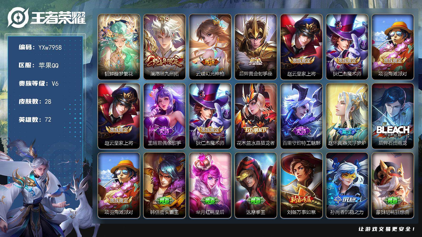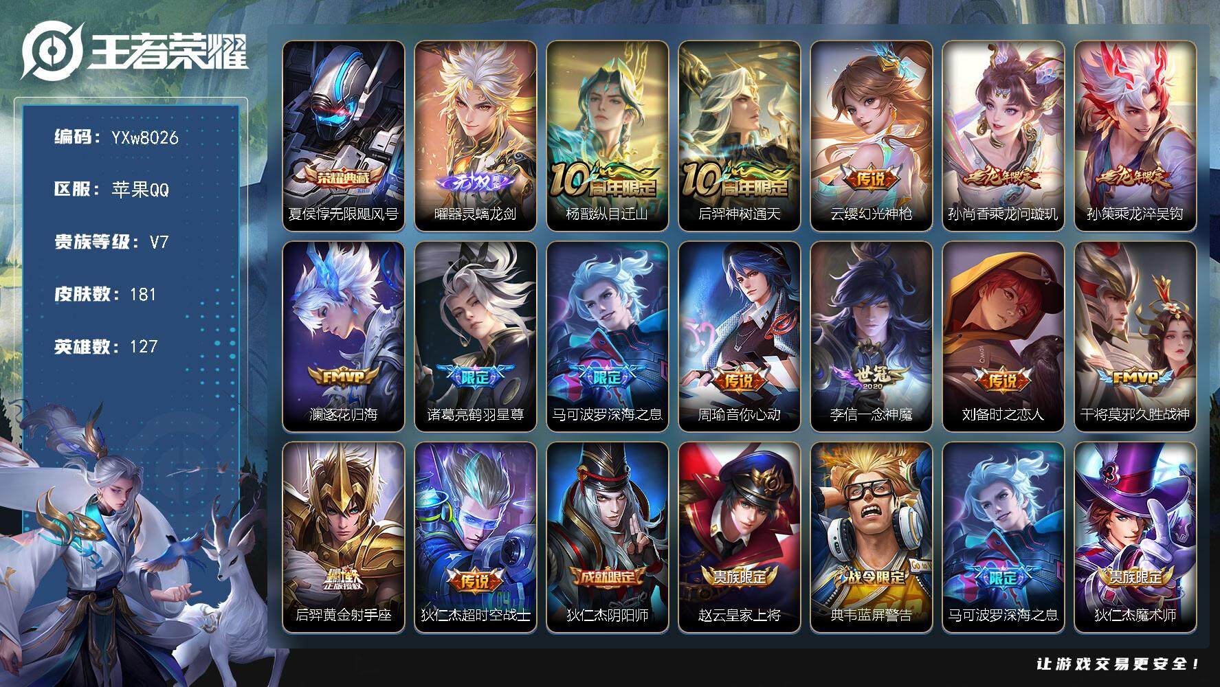 PX_2305655-??主推·无限飓风号·器灵螭龙剑·乘龙淬吴钩·纵目迁山·乘龙问璇玑·逐花归海·鹤羽星尊·深海之息·一念神魔·乘龙聚宝船·可二次】YXw8026-苹果Q-127英雄-181皮肤-6王者印记-70铭文-贵族积分4w【贵族7】【1典藏·1无双·14传说·1天幕·15按键】【因赛季更新游戏段付以上号为准!】 【英雄全皮】:孙权全皮 【荣耀典藏】:夏侯惇无限飓风号 【无双皮肤】:曜器灵螭龙剑 【天幕】:共赏芳华天幕 【传说皮肤】:杨戬纵目迁山,后羿神树通天,云缨幻光神枪,孙尚香乘龙问璇玑,孙策乘龙淬吴钩,澜逐花归海,诸葛亮鹤羽星尊,马可波罗深海之息,周瑜音你心动,李信一念神魔,刘备时之恋人,干将莫邪久胜战神,后羿黄金射手座,狄仁杰超时空战士 【限定皮肤】:狄仁杰阴阳师,赵云皇家上将,典韦蓝屏警告,马可波罗深海之息,狄仁杰魔术师,项羽海滩派对,孙悟空孙行者,杨戬潮玩骑兵,诸葛亮鹤羽星尊,黄忠烈魂,百里玄策原初追逐者,云中君纤云弄巧,伽罗天狼溯光者,张良古海寻踪,蒙犽百解令,高渐离燃音魔法,妲己灵卜魔法,鬼谷子天穹祈灯,伽罗琥珀纪元,姬小满妄想食味,安琪拉乘龙聚宝船,孙尚香乘龙问璇玑,孙策乘龙淬吴钩,百里玄策超元猎域,沈梦溪龙舞盛年,鲁班七号蔬乡物语,李元芳蔬乡物语,刘邦剑破天穹,程咬金群星魔术团,周瑜熔金海岸 【年限皮肤】:黄忠烈魂,安琪拉乘龙聚宝船,孙尚香乘龙问璇玑,孙策乘龙淬吴钩 【赛季限定】:张良古海寻踪,百里玄策原初追逐者,鬼谷子天穹祈灯,刘邦剑破天穹 【战令限定】:典韦蓝屏警告,杨戬潮玩骑兵,高渐离燃音魔法,妲己灵卜魔法,鲁班七号蔬乡物语,李元芳蔬乡物语 【史诗皮肤】:鲁班七号电玩小子,项羽苍穹之光,露娜紫霞仙子,赵云皇家上将,貂蝉圣诞恋歌,甄姬冰雪圆舞曲,王昭君偶像歌手,狄仁杰魔术师,廉颇地狱岩魂,宫本武藏鬼剑武藏,孙尚香水果甜心,嬴政摇滚巨星,李白千年之狐,张飞乱世虎臣,花木兰水晶猎龙者,夏侯惇乘风破浪,兰陵王暗隐猎兽者,亚瑟心灵战警,百里守约特工魅影,李元芳逐浪之夏,白起星夜王子,孙策猫狗日记,大乔猫狗日记,典韦蓝屏警告,伽罗箭羽风息,狄仁杰鹰眼统帅,不知火舞魅语,橘右京修罗,黄忠烈魂,孙尚香时之恋人,百里玄策原初追逐者,云中君纤云弄巧,伽罗天狼溯光者,沈梦溪月团寄思,孙悟空孙行者,蒙犽百解令,周瑜雪夜绮愿,妲己灵卜魔法,高渐离燃音魔法,伽罗琥珀纪元,姬小满妄想食味,百里玄策超元猎域,安琪拉乘龙聚宝船,鲁班七号蔬乡物语,孙膑茶境仙,阿轲化蝶舞,刘禅鸭鸭历险记,狂铁龙之律动,百里守约雪豹霜爪,黄忠百相守梦,公孙离涂山容容,莱西奥光弋星穹,兰陵王傩神司,女娲万灵启世,少司缘巫礼祀神 【其他皮肤】:项羽海滩派对,韩信教廷特使,韩信街头霸王,露娜哥特玫瑰,赵云白执事,赵云忍炎影,芈月红桃皇后,白起白色死神,牛魔西部大镖客,宫本武藏未来纪元,安琪拉玩偶对对碰,妲己少女阿狸,典韦黄金武士,亚瑟死亡骑士,达摩拳王,花木兰兔女郎,甄姬花好人间,后羿阿尔法小队,狄仁杰阴阳师,刘备纽约教父,关羽龙腾万里,钟无艳海滩丽影,老夫子功夫老勺,鬼谷子幻乐之宴,小乔丁香结,吕布野性能量,姜子牙炽热元素使,狂铁特工战影,露娜瓷语鉴心,盘古重装意志,马可波罗潮玩牛仔,刘禅唤灵魔甲,蒙恬蔚蓝守将,刘备潮玩造梦师,猪八戒潮玩探月行,杨戬潮玩骑兵,李元芳妄想特派,哪吒热血海滩,张良古海寻踪,亚连破局者,后羿完美运算,程咬金暖冬絮语,鬼谷子天穹祈灯,妲己灵卜魔法,海诺时空谍影,朵莉亚金色潮汐,亚瑟鸿运当头,沈梦溪龙舞盛年,钟无艳春野之旅,李元芳蔬乡物语,扁鹊无尽旅途,刘邦剑破天穹,盘古经纬探寻者,程咬金群星魔术团,貂蝉长夏之忆,周瑜熔金海岸,东皇太一噬灭天穹,干将莫邪雾都夜雨,吕布逐霄战戟,苍苍林狼骑,太乙真人谧流熔炉,典韦铁骨偃魂,马超访茗客,西施雪境奇遇,达摩爆裂喵拳,明世隐景韶洛都,戈娅玫蓝誓约,刘备浪漫序章,钟馗虚灵犬护,沈梦溪鸭鸭历险记,苏烈春野闲踪,小乔秘证寻踪,张良灵野札记,阿古朵布丁狗之约,甄姬逆浪荇歌,莱西奥踏浪烽翎,鬼谷子克喵,亚瑟荣光之誓,明世隐往忆晖光,孙权径山谋武,艾琳鹤鸣心笺,曹操逐霄之志,鲁班七号木偶奇遇记,高渐离金属狂潮,孙膑未来旅行,刘禅英喵野望,兰陵王隐刃,李白范海辛,虞姬加勒比小姐,马可波罗激情绿茵,苍维京掠夺者,杨戬埃及法老,黄忠芝加哥教父,铠龙域领主,百里守约绝影神枪,梦奇美梦成真,公孙离花间舞,裴擒虎街头旋风,孙策海之征途,伽罗花见巫女,上官婉儿修竹墨客,嫦娥露花倒影,猪八戒年年有余,盘古创世神祝,曜归虚梦演,马超幸存者,镜冰刃幻境,澜孤猎,司空震启蛰,金蝉前尘,暃碧珀绯影 【内测皮肤】:狂铁特工战影