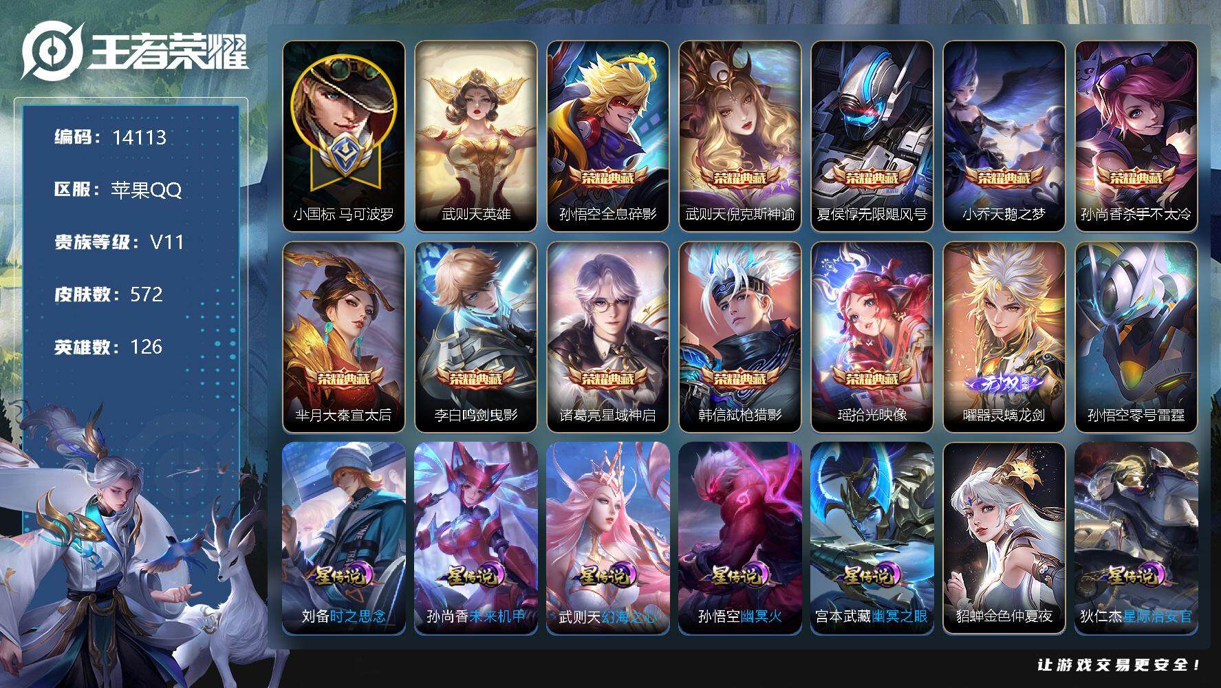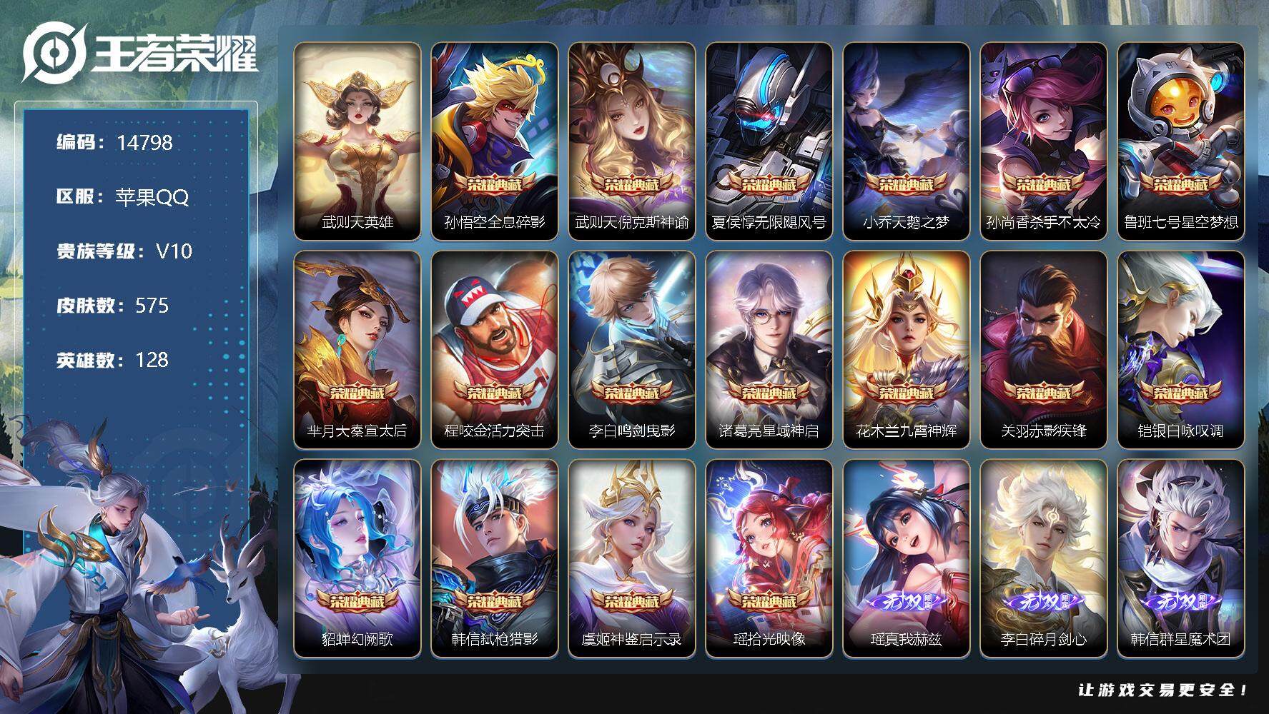 PX_2273091-可换绑【无双V10精品号,十万流光积分有传承位,满无双,满珍品,生肖限定39个】,147戳戳,7星传说,3天幕,1小兵,56按键,19王者印记,满级铭文,可二次BX1734,苹果Q-V11-710皮肤-14典藏-1珍品无双-12无双-9珍品传说-119传说-253史诗【英雄全皮】:廉颇全皮,赵云全皮,墨子全皮,妲己全皮,孙尚香全皮,刘禅全皮,高渐离全皮,阿轲全皮,孙膑全皮,扁鹊全皮,芈月全皮,吕布全皮,元歌全皮,夏侯惇全皮,甄姬全皮,曹操全皮,典韦全皮,宫本武藏全皮,马可波罗全皮,达摩全皮,武则天全皮,司马懿全皮,关羽全皮,露娜全皮,姜子牙全皮,刘邦全皮,韩信全皮,孙权全皮,艾琳全皮,张良全皮,不知火舞全皮,朵莉亚全皮,娜可露露全皮,橘右京全皮,孙悟空全皮,牛魔全皮,后羿全皮,刘备全皮,张飞全皮,李元芳全皮,钟馗全皮,杨玉环全皮,苍全皮,哪吒全皮,雅典娜全皮,蔡文姬全皮,太乙真人全皮,东皇太一全皮,鬼谷子全皮,黄忠全皮,铠全皮,苏烈全皮,百里守约全皮,弈星全皮,公孙离全皮,沈梦溪全皮,裴擒虎全皮,狂铁全皮,米莱狄全皮,李信全皮,伽罗全皮,盾山全皮,孙策全皮,猪八戒全皮,上官婉儿全皮,亚连全皮,嫦娥全皮,大司命全皮,马超全皮,海月全皮,西施全皮,鲁班大师全皮,蒙恬全皮,盘古全皮,镜全皮,桑启全皮,夏洛特全皮,司空震全皮,金蝉全皮,暃全皮,莱西奥全皮,戈娅全皮,空空儿全皮,影全皮,海诺全皮,姬小满全皮,少司缘全皮【荣耀典藏】:武则天英雄,孙悟空全息碎影,武则天倪克斯神谕,夏侯惇无限飓风号,小乔天鹅之梦,孙尚香杀手不太冷,芈月大秦宣太后,程咬金活力突击,关羽赤影疾锋,铠银白咏叹调,韩信弑枪猎影,虞姬神鉴启示录,瑶拾光映像,伽罗最初的交响【珍品无双】:貂蝉馥梦繁花【无双皮肤】:武则天神器明辉仪,妲己青丘九尾,瑶真我赫兹,李白碎月剑心,小乔时之魔女,韩信群星魔术团,不知火舞花合斗,公孙离离恨烟,甄姬雪境奇遇,曜器灵螭龙剑,诸葛亮天机白泽,铠神罪【珍品传说】:马可波罗怪盗基德,鲁班七号江户川柯南,孙策时之奇旅,嫦娥器灵落星盏,张飞兔狲蓬尾,瑶大耳狗之梦,安琪拉酷洛米之心,暃朽木白哉,宫本武藏黑崎一护【星元皮肤】:伽罗太华红枫,兰陵王荆棘舞步,刘备时之思念,孙尚香未来机甲,武则天幻海之心,宫本武藏幽冥之眼,貂蝉金色仲夏夜【天幕】:怪盗基德天幕,铃舟系梦天幕,春日相逢天幕【小兵皮肤】:小兵狐妖小红娘【传说皮肤】:杨戬纵目迁山,后羿神树通天,曹操万灵伏威,干将莫邪千山共赴,元歌诡秘之主,大司命死亡执政官,司马懿九山相柳,公孙离云诺千山,西施续相思,杨玉环星之鸣奏,后羿千劫归真,司空震愿照山河定,女娲愿照千秋盛,妲己愿照众生和,澜愿照九州拓,蔡文姬愿照福禄聚,虞姬愿照岁时盈,云缨幻光神枪,裴擒虎祥瑞亨通,嬴政玄雷天君,王昭君映山客,桑启鸣野蒿,庄周牧神诗旅,夏侯惇霜北刀,铠冥王哈迪斯,朵莉亚心动手记,云中君群星魔术团,墨子黄金天蝎座,海月金乌负日,亚连落雪白狼,吕布曦玄引,貂蝉曦玄引,典韦战鼓燎原,孙尚香乘龙问璇玑,孙策乘龙淬吴钩,赵云乘龙铭钟鼎,马超琥珀纪元,铠琥珀纪元,澜逐花归海,艾琳觅芳踪,露娜霜月吟,孙膑小动物乐团,甄姬至美化雀舞,鲁班七号时之奇旅,兰陵王影龙天霄,吕布遇见神鼓,宫本武藏惊梅引,上官婉儿妄想奇谈,马可波罗妄想实况,东皇太一灼幽烈阳,诸葛亮鹤羽星尊,张飞百相守梦,公孙离记忆之芯,夏洛特浮生妄,干将莫邪画中仙,花木兰燃星之曲,伽罗炽翼辉光,孙悟空齐天大圣,小乔山海琳琅生,李信山海炽霜斩,吕布怒海麟威,李白诗剑行,狄仁杰神器狴犴令,不知火舞绯月行,王昭君星穹之声,百里守约碎云,橘右京枫霜尽,娜可露露前尘镜,孙尚香音你闪耀,马可波罗深海之息,后羿无尽星芒,马超无双飞将,大乔挚爱花嫁,孙策挚爱之约,露娜启示之音,蔡文姬花朝如约,孙策末日机甲,裴擒虎寅虎赤拳,鲁班七号寅虎瑞焰,孙尚香异界灵契,貂蝉遇见胡旋,赵云淬星耀世,王昭君乞巧织情,西施游龙清影,曜李逍遥,,周瑜音你心动,小乔音你心动,李元芳飞鸢探春,兰陵王默契交锋,公孙离祈雪灵祝,诸葛亮时雨天司,铠绛天战甲,镜炽阳神光,虞姬启明星使,孙悟空零号赤焰,关羽武圣,曜云鹰飞将,李信一念神魔,刘备时之恋人,伽罗太华,貂蝉猫影幻舞,张良黄金白羊座,干将莫邪久胜战神,虞姬云霓雀翎,达摩黄金狮子座,百里玄策白虎志,花木兰冠军飞将,梦奇胖达荣荣,后羿黄金射手座,杨戬永曜之星,诸葛亮武陵仙君,貂蝉仲夏夜之梦,李白凤求凰,孙尚香末日机甲,宫本武藏地狱之眼,孙悟空地狱火,吕布天魔缭乱,武则天海洋之心,狄仁杰超时空战士 【限定皮肤】:白起狰,公孙离离恨烟,夏侯惇霜北刀,铠冥王哈迪斯,暃埋骨钱,蒙犽顽岩魄,蔡文姬夏日便利店,大乔绒语心约,虞姬夏日便利店,姜子牙天穹之誓,李白谪仙醉月,狄仁杰阴阳师,虞姬凯尔特女王,廉颇寅虎御盾,小乔山海琳琅生,赵云皇家上将,赵云引擎之心,赵云龙胆,赵云百木心枪,墨子神迹守卫,墨子降魔,妲己热情桑巴,妲己时之彼端,妲己时之奇旅,嬴政白昼王子,孙尚香蔷薇恋人,孙尚香异界灵契,鲁班七号狮舞东方,鲁班七号乒乒小将,鲁班七号寅虎瑞焰,鲁班七号时之奇旅,庄周云端筑梦师,庄周玄嵩,庄周高山流水,高渐离死亡摇滚,高渐离玩趣恶龙,阿轲迷踪丽影,钟无艳超时空战士,孙膑妖精王,孙膑天狼运算者,孙膑寅虎展翼,扁鹊炼金王,扁鹊奇幻香踪,白起夜都怪侠,芈月重明,芈月