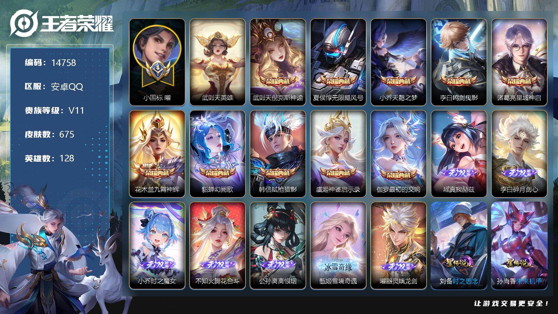 PX_2257896-可换绑【无双V10精品号,贵族积分47万,曜小国标1.68W,4金标,中路48段,打野46段,生肖限定33个,11典藏含武则天英雄,7无双,7珍品】,背包一颗荣耀水晶,156戳戳,7星传说,2天幕,53按键,4646星币,28王者印记,五级铭文200,可二次BX1352,安卓Q-V11-675皮肤-11典藏-7无双-7珍品传说-116传说-236史诗【英雄全皮】:廉颇全皮,嬴政全皮,刘禅全皮,高渐离全皮,白起全皮,夏侯惇全皮,典韦全皮,李白全皮,马可波罗全皮,达摩全皮,安琪拉全皮,露娜全皮,姜子牙全皮,刘邦全皮,孙权全皮,花木兰全皮,艾琳全皮,张良全皮,不知火舞全皮,橘右京全皮,牛魔全皮,后羿全皮,虞姬全皮,钟馗全皮,杨玉环全皮,苍全皮,女娲全皮,哪吒全皮,雅典娜全皮,蔡文姬全皮,太乙真人全皮,东皇太一全皮,鬼谷子全皮,黄忠全皮,弈星全皮,公孙离全皮,沈梦溪全皮,明世隐全皮,狂铁全皮,米莱狄全皮,李信全皮,盾山全皮,猪八戒全皮,亚连全皮,嫦娥全皮,马超全皮,海月全皮,曜全皮,西施全皮,鲁班大师全皮,蒙恬全皮,澜全皮,盘古全皮,镜全皮,阿古朵全皮,桑启全皮,夏洛特全皮,司空震全皮,金蝉全皮,暃全皮,赵怀真全皮,莱西奥全皮,戈娅全皮,空空儿全皮,影全皮,海诺全皮,少司缘全皮【荣耀典藏】:武则天英雄,武则天倪克斯神谕,夏侯惇无限飓风号,小乔天鹅之梦,李白鸣剑曳影,诸葛亮星域神启,花木兰九霄神辉,貂蝉幻阙歌,韩信弑枪猎影,虞姬神鉴启示录,伽罗最初的交响【无双皮肤】:瑶真我赫兹,李白碎月剑心,小乔时之魔女,不知火舞花合斗,公孙离离恨烟,甄姬雪境奇遇,曜器灵螭龙剑【珍品传说】:马可波罗怪盗基德,鲁班七号江户川柯南,孙策时之奇旅,嫦娥器灵落星盏,张飞兔狲蓬尾,安琪拉酷洛米之心,暃朽木白哉【星元皮肤】:鲁班七号寅虎焰心,狄仁杰星际治安官,刘备时之思念,孙尚香未来机甲,武则天幻海之心,宫本武藏幽冥之眼,貂蝉金色仲夏夜【天幕】:金虎啸春天幕,无尽之约天幕【传说皮肤】:后羿神树通天,公孙离云诺千山,西施续相思,杨玉环星之鸣奏,后羿千劫归真,司空震愿照山河定,女娲愿照千秋盛,妲己愿照众生和,澜愿照九州拓,蔡文姬愿照福禄聚,虞姬愿照岁时盈,云缨幻光神枪,裴擒虎祥瑞亨通,嬴政玄雷天君,王昭君映山客,桑启鸣野蒿,庄周牧神诗旅,夏侯惇霜北刀,铠冥王哈迪斯,朵莉亚心动手记,云中君群星魔术团,海月金乌负日,亚连落雪白狼,吕布曦玄引,貂蝉曦玄引,典韦战鼓燎原,孙尚香乘龙问璇玑,孙策乘龙淬吴钩,赵云乘龙铭钟鼎,马超琥珀纪元,铠琥珀纪元,澜逐花归海,艾琳觅芳踪,露娜霜月吟,孙膑小动物乐团,狄仁杰夜礼服假面,王昭君永恒水手月亮,甄姬至美化雀舞,大乔时之奇旅,鲁班七号时之奇旅,兰陵王影龙天霄,吕布遇见神鼓,宫本武藏惊梅引,云缨鹤归松栖,上官婉儿妄想奇谈,马可波罗妄想实况,东皇太一灼幽烈阳,诸葛亮鹤羽星尊,澜电玩雷克斯,亚瑟追逃游戏,安琪拉追逃游戏,张飞百相守梦,公孙离记忆之芯,夏洛特浮生妄,干将莫邪画中仙,花木兰燃星之曲,虞姬无限倾心,项羽无限倾心,伽罗炽翼辉光,孙悟空齐天大圣,小乔山海琳琅生,曜山海苍雷引,李信山海炽霜斩,吕布怒海麟威,李白诗剑行,不知火舞绯月行,王昭君星穹之声,百里守约碎云,橘右京枫霜尽,孙尚香音你闪耀,马可波罗深海之息,后羿无尽星芒,马超无双飞将,露娜启示之音,蔡文姬花朝如约,女娲补天,孙策末日机甲,瑶时之祈愿,裴擒虎寅虎赤拳,鲁班七号寅虎瑞焰,孙尚香异界灵契,貂蝉遇见胡旋,赵云淬星耀世,王昭君乞巧织情,西施游龙清影,曜李逍遥,,周瑜音你心动,小乔音你心动,李元芳飞鸢探春,公孙离祈雪灵祝,诸葛亮时雨天司,铠绛天战甲,镜炽阳神光,虞姬启明星使,孙悟空零号赤焰,关羽武圣,曜云鹰飞将,李信一念神魔,刘备时之恋人,貂蝉猫影幻舞,张良黄金白羊座,干将莫邪久胜战神,虞姬云霓雀翎,达摩黄金狮子座,花木兰冠军飞将,梦奇胖达荣荣,后羿黄金射手座,杨戬永曜之星,诸葛亮武陵仙君,貂蝉仲夏夜之梦,李白凤求凰,孙尚香末日机甲,宫本武藏地狱之眼,孙悟空地狱火,武则天海洋之心,狄仁杰超时空战士 【限定皮肤】:白起狰,公孙离离恨烟,夏侯惇霜北刀,铠冥王哈迪斯,暃埋骨钱,蔡文姬夏日便利店,大乔绒语心约,虞姬夏日便利店,姜子牙天穹之誓,杨戬破阵退雄兵,李白谪仙醉月,狄仁杰阴阳师,虞姬凯尔特女王,廉颇寅虎御盾,小乔山海琳琅生,赵云皇家上将,赵云引擎之心,赵云百木心枪,墨子神迹守卫,墨子降魔,妲己热情桑巴,妲己时之彼端,嬴政优雅恋人,嬴政白昼王子,孙尚香异界灵契,鲁班七号狮舞东方,鲁班七号乒乒小将,鲁班七号寅虎瑞焰,鲁班七号时之奇旅,庄周云端筑梦师,庄周高山流水,高渐离死亡摇滚,高渐离玩趣恶龙,阿轲迷踪丽影,钟无艳超时空战士,孙膑天狼运算者,孙膑寅虎展翼,扁鹊奇幻香踪,白起夜都怪侠,芈月重明,芈月白晶晶,芈月幻夜卜梦,吕布猎兽之王,吕布御风骁将,吕布遇见神鼓,周瑜赤莲之焰,元歌云间偶戏,元歌无心,夏侯惇朔风刀,夏侯惇匿光决锋者,甄姬女儿国国王,甄姬游园惊梦,甄姬落雪兰心,甄姬至美化雀舞,曹操烛龙,曹操天狼征服者,典韦穷奇,典韦蓝屏警告,典韦岱宗,马可波罗逐梦之星,马可波罗暗影游猎,马可波罗深海之息,马可波罗山海玄木吟,马可波罗妄想实况,狄仁杰魔术师,狄仁杰万华元夜,达摩星际陆战队,达摩沙漠行僧,项羽海滩派对,项羽无限倾心,老夫子醍醐杖,老夫子航海奇遇记,关羽冰锋战神,关羽武圣,