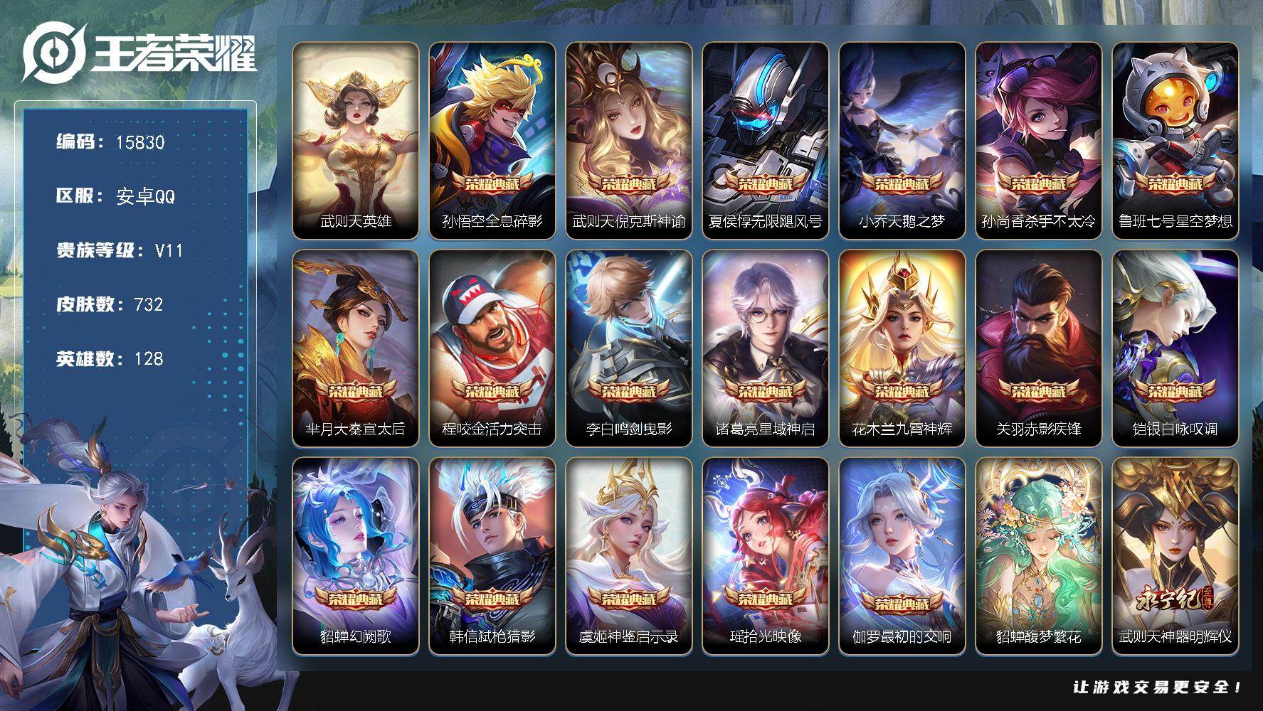 PX_2267876-可换绑【732皮精品无双V10,86w贵族积分,满生肖限定,满典藏,满珍品,满战令限定,隐藏灵宝,35个天幕,11个星传说,6金标6个万战,背包俩颗荣耀水晶,主页装扮-福运大使,270级万象图鉴,可转区】6567星币,1小兵,201戳戳,28王者印记,满级铭文,可二次kk4884,安卓Q-V11-732皮肤-19典藏-1珍品无双-11无双-9珍品传说-130传说-264史诗【荣耀典藏】:武则天英雄,孙悟空全息碎影,武则天倪克斯神谕,夏侯惇无限飓风号,小乔天鹅之梦,孙尚香杀手不太冷,鲁班七号星空梦想,芈月大秦宣太后,程咬金活力突击,李白鸣剑曳影,诸葛亮星域神启,花木兰九霄神辉,关羽赤影疾锋,铠银白咏叹调,貂蝉幻阙歌,韩信弑枪猎影,虞姬神鉴启示录,瑶拾光映像,伽罗最初的交响【珍品无双】:貂蝉馥梦繁花【无双皮肤】:武则天神器明辉仪,妲己青丘九尾,瑶真我赫兹,李白碎月剑心,小乔时之魔女,韩信群星魔术团,不知火舞花合斗,公孙离离恨烟,甄姬雪境奇遇,曜器灵螭龙剑,诸葛亮天机白泽【珍品传说】:马可波罗怪盗基德,鲁班七号江户川柯南,孙策时之奇旅,嫦娥器灵落星盏,张飞兔狲蓬尾,瑶大耳狗之梦,安琪拉酷洛米之心,暃朽木白哉,宫本武藏黑崎一护【星元皮肤】:貂蝉金色仲夏夜,宫本武藏幽冥之眼,孙悟空零号雷霆,孙尚香未来机甲,瑶时之愿境,狄仁杰星际治安官,虞姬无限倾慕,李白玉鸾吟,曜云鹰彻晓,兰陵王荆棘舞步,伽罗太华红枫【天幕】:雪境奇遇天幕,黑崎一护天幕,财神纳福天幕,怪盗基德天幕,江户川柯南天幕,铃舟系梦天幕,墨染江湖天幕,纸笺情愫天幕,Kuromi时间天幕,春野列车天幕,春日相逢天幕,龙腾四海天幕,一梦云烟天幕,月之邀约天幕,闪耀亚洲天幕,Hello,Kitty天幕,电音狂想天幕,妄想时刻天幕,顶级玩家天幕,甜蜜冒险天幕,春韵弦音天幕,无尽之约天幕,鸿兔大展天幕,幻夜逐光天幕,凤鸣九霄天幕,金虎啸春天幕,秋月华灯天幕,墨上江山天幕,路在脚下天幕,浪翻一夏天幕,挚爱童话天幕,花朝如约天幕【小兵皮肤】:小兵雪境奇遇【传说皮肤】:杨戬纵目迁山,后羿神树通天,干将莫邪千山共赴,元歌诡秘之主,大司命死亡执政官,司马懿九山相柳,公孙离云诺千山,西施续相思,杨玉环星之鸣奏,后羿千劫归真,司空震愿照山河定,女娲愿照千秋盛,妲己愿照众生和,澜愿照九州拓,蔡文姬愿照福禄聚,虞姬愿照岁时盈,云缨幻光神枪,裴擒虎祥瑞亨通,嬴政玄雷天君,王昭君映山客,桑启鸣野蒿,庄周牧神诗旅,夏侯惇霜北刀,铠冥王哈迪斯,朵莉亚心动手记,云中君群星魔术团,墨子黄金天蝎座,海月金乌负日,亚连落雪白狼,吕布曦玄引,貂蝉曦玄引,典韦战鼓燎原,孙尚香乘龙问璇玑,孙策乘龙淬吴钩,赵云乘龙铭钟鼎,马超琥珀纪元,铠琥珀纪元,澜逐花归海,艾琳觅芳踪,露娜霜月吟,孙膑小动物乐团,狄仁杰夜礼服假面,王昭君永恒水手月亮,甄姬至美化雀舞,大乔时之奇旅,鲁班七号时之奇旅,兰陵王影龙天霄,吕布遇见神鼓,宫本武藏惊梅引,云缨鹤归松栖,上官婉儿妄想奇谈,马可波罗妄想实况,东皇太一灼幽烈阳,诸葛亮鹤羽星尊,澜电玩雷克斯,亚瑟追逃游戏,安琪拉追逃游戏,张飞百相守梦,公孙离记忆之芯,夏洛特浮生妄,干将莫邪画中仙,花木兰燃星之曲,虞姬无限倾心,项羽无限倾心,伽罗炽翼辉光,孙悟空齐天大圣,小乔山海琳琅生,曜山海苍雷引,李信山海炽霜斩,吕布怒海麟威,李白诗剑行,狄仁杰神器狴犴令,不知火舞绯月行,王昭君星穹之声,百里守约碎云,橘右京枫霜尽,娜可露露前尘镜,孙尚香音你闪耀,马可波罗深海之息,后羿无尽星芒,马超无双飞将,大乔挚爱花嫁,孙策挚爱之约,露娜启示之音,蔡文姬花朝如约,女娲补天,孙策末日机甲,瑶时之祈愿,裴擒虎寅虎赤拳,鲁班七号寅虎瑞焰,孙尚香异界灵契,貂蝉遇见胡旋,赵云淬星耀世,王昭君乞巧织情,西施游龙清影,曜李逍遥,,周瑜音你心动,小乔音你心动,李元芳飞鸢探春,兰陵王默契交锋,公孙离祈雪灵祝,诸葛亮时雨天司,铠绛天战甲,镜炽阳神光,虞姬启明星使,孙悟空零号赤焰,关羽武圣,曜云鹰飞将,李信一念神魔,刘备时之恋人,伽罗太华,貂蝉猫影幻舞,张良黄金白羊座,干将莫邪久胜战神,虞姬云霓雀翎,达摩黄金狮子座,百里玄策白虎志,花木兰冠军飞将,梦奇胖达荣荣,后羿黄金射手座,杨戬永曜之星,诸葛亮武陵仙君,貂蝉仲夏夜之梦,李白凤求凰,孙尚香末日机甲,宫本武藏地狱之眼,孙悟空地狱火,吕布天魔缭乱,武则天海洋之心,狄仁杰超时空战士【限定皮肤】:白起狰,公孙离离恨烟,夏侯惇霜北刀,铠冥王哈迪斯,暃埋骨钱,蒙犽顽岩魄,蔡文姬夏日便利店,大乔绒语心约,虞姬夏日便利店,姜子牙天穹之誓,杨戬破阵退雄兵,李白谪仙醉月,狄仁杰阴阳师,小乔纯白花嫁,虞姬凯尔特女王,廉颇寅虎御盾,小乔山海琳琅生,赵云皇家上将,赵云引擎之心,赵云龙胆,赵云百木心枪,墨子神迹守卫,墨子降魔,妲己热情桑巴,妲己时之彼端,妲己时之奇旅,嬴政优雅恋人,嬴政白昼王子,孙尚香蔷薇恋人,孙尚香异界灵契,鲁班七号狮舞东方,鲁班七号乒乒小将,鲁班七号寅虎瑞焰,鲁班七号时之奇旅,庄周云端筑梦师,庄周玄嵩,庄周高山流水,高渐离玩趣恶龙,阿轲迷踪丽影,钟无艳王者之锤,钟无艳超时空战士,孙膑天狼运算者,孙膑寅虎展翼,扁鹊奇幻香踪,白起夜都怪侠,芈月重明,芈月白晶晶,芈月幻夜卜梦,吕布天魔缭乱,吕布猎兽之王,吕布御风骁将,吕布遇见神鼓,周瑜真爱至上,周瑜赤莲之焰,元歌云间偶戏,元歌无心,夏侯惇