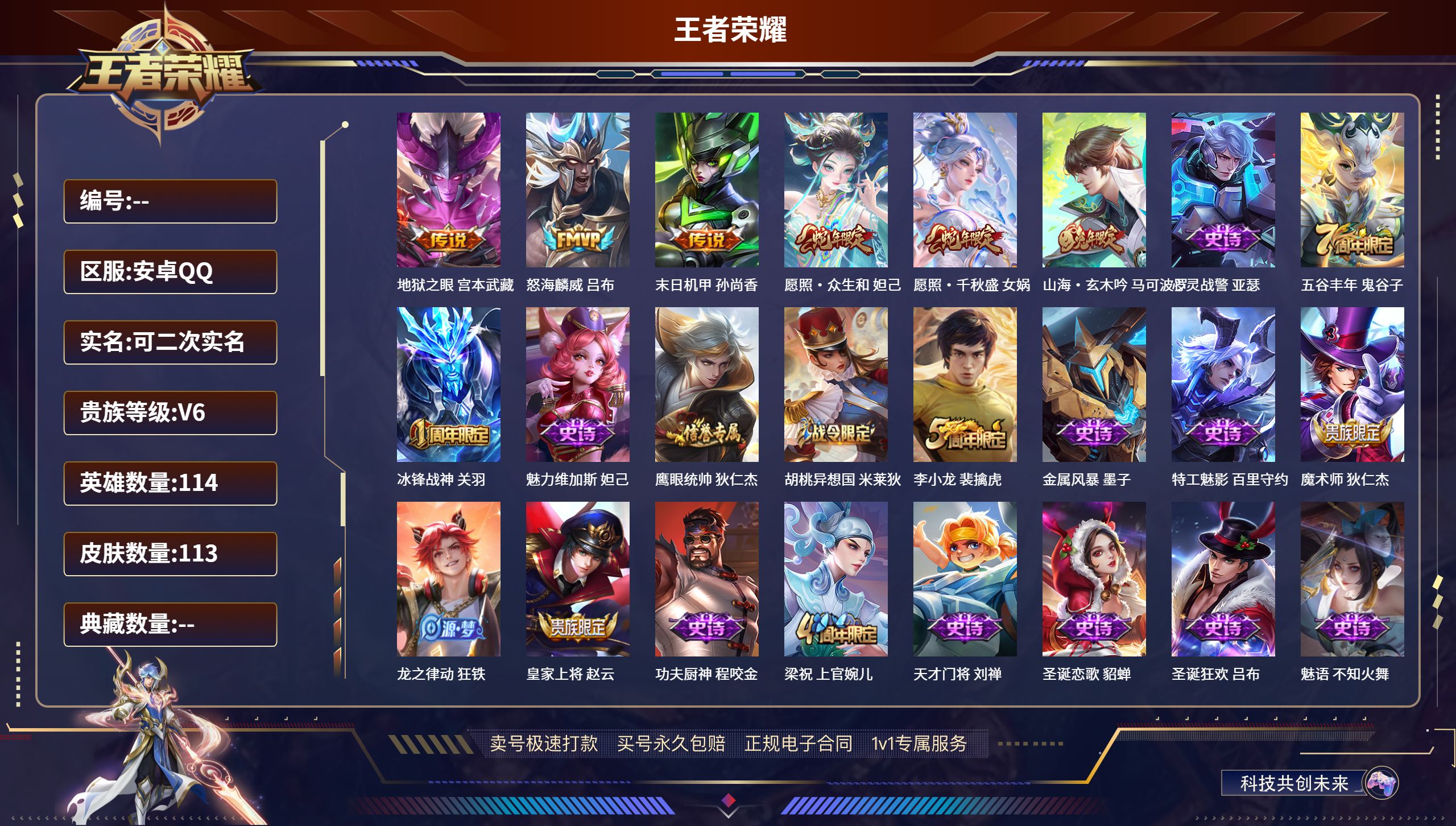 PX_2262475-安卓QQ/非凡王者/113皮肤/114英雄/0典藏/0珍品无双/0无双/0珍品传说/5传说/25史诗/7稀有英雄 【5,传说皮肤】地狱之眼,宫本武藏,怒海麟威,吕布,末日机甲,孙尚香,愿照·众生和,妲己,愿照·千秋盛,女娲, 【25,史诗皮肤】山海·玄木吟,马可波罗,心灵战警,亚瑟,五谷丰年,鬼谷子,冰锋战神,关羽,魅力维加斯,妲己,鹰眼统帅,狄仁杰,胡桃异想国,米莱狄,李小龙,裴擒虎,金属风暴,墨子,特工魅影,百里守约,魔术师,狄仁杰,龙之律动,狂铁,皇家上将,赵云,功夫厨神,程咬金,梁祝,上官婉儿,天才门将,刘禅,圣诞恋歌,貂蝉,圣诞狂欢,吕布,魅语,不知火舞,节奏热浪,阿轲,乱世虎臣,张飞,水果甜心,孙尚香,化蝶舞,阿轲,乘风破浪,夏侯惇,暗隐猎兽者,兰陵王, 【70,勇者皮肤】太极少年,赵怀真,星际陆战队,达摩,沙漠行僧,达摩,大漠名商,沈梦溪,缤纷绘卷,张良,纽约教父,刘备,拳王,达摩,大发明家,达摩,沉稳之力,孙尚香,海盐诗旅,桑启,朔风刀,夏侯惇,醍醐杖,老夫子,归虚梦演,孙膑,白色死神,白起,黄金武士,典韦,阴阳师,狄仁杰,古海寻踪,张良,功夫老勺,老夫子,西部大镖客,牛魔,鲨炮海盗猫,沈梦溪,海滩派对,项羽,万华元夜,狄仁杰,演武夺筹,程咬金,红桃皇后,芈月,奇妙博物学,庄周,美猴王,孙悟空,野性能量,吕布,哥特玫瑰,露娜,守护之力,大乔,原初探秘者,鬼谷子,潮玩探月行,猪八戒,天穹祈灯,鬼谷子,化身博士,扁鹊,阿尔法小队,后羿,死亡骑士,亚瑟,浪漫序章,刘备,胡桃狂想曲,蒙犽,海滩丽影,钟无艳,忍·炎影,赵云,坚韧之力,苏烈,擒涛扼浪,裴擒虎,乓乓大师,鲁班大师,探海日志,鲁班大师,天使之翼,孙膑,玩趣恶龙,高渐离,龙腾万里,关羽,金庭之子,兰陵王,时尚教父,姜子牙,教廷特使,韩信,街头霸王,韩信,云中旅人,李元芳,妄想特派,李元芳,西部大镖客,孙悟空,少女阿狸,妲己,混沌棋,弈星,春野闲踪,苏烈,契约魔法,米莱狄,布丁狗之约,阿古朵,灵野札记,张良,驱傩正仪,钟馗,命运角斗场,狂铁,虚灵犬护,钟馗,劲辣红锅,太乙真人,剑破天穹,刘邦,星梦巡礼,姜子牙,谧流熔炉,太乙真人,灵卦秘语,少司缘,爆裂喵拳,达摩,玫蓝誓约,戈娅,景韶洛都,明世隐, 【14,其他皮肤】爱与和平,苏烈,第七人偶,干将莫邪,万圣前夜,小乔,福禄兄弟,鲁班七号,冰刃幻境,镜,星航指挥官,诸葛亮,魇语军师,司马懿,激情绿茵,马可波罗,西部大镖客,孙悟空,绝影神枪,百里守约,孤猎,澜,精准探案法,米莱狄,赤焰之缨,云缨,地府判官,钟馗, 【7,稀有英雄】不知火舞,橘右京,夏洛特,娜可露露,韩信,艾琳,赵云, 营地ID:,