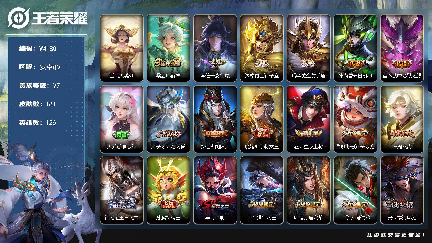 PX_2304932-【W4180】【亮点:5.6K场次-对抗23段】安卓Q-可二次-贵7-126英雄-181皮肤-1典藏-6传说-66限定-2按键-贵族积分36817-营地ID:320231296(热门:武则天-至尊宝-朱雀志-玄武志-蓝屏警告-大圣娶亲)