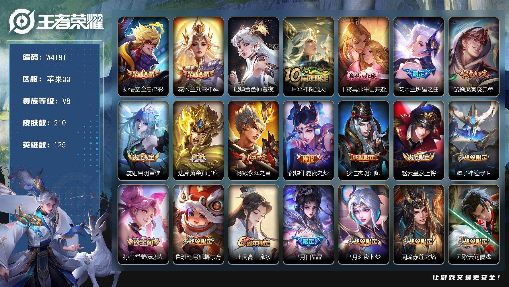 PX_2304933-【W4181】【亮点:5.4K场次-金标花木兰,元歌】苹果Q-不可二次-贵8-125英雄-210皮肤-2典藏-1星元-8传说-69限定-6按键-贵族积分79886-营地ID:400259637(热门:全息碎影-九霄神辉-寅虎赤拳-白晶晶-蓝屏警告) 【星元皮肤】:貂蝉金色仲夏夜
