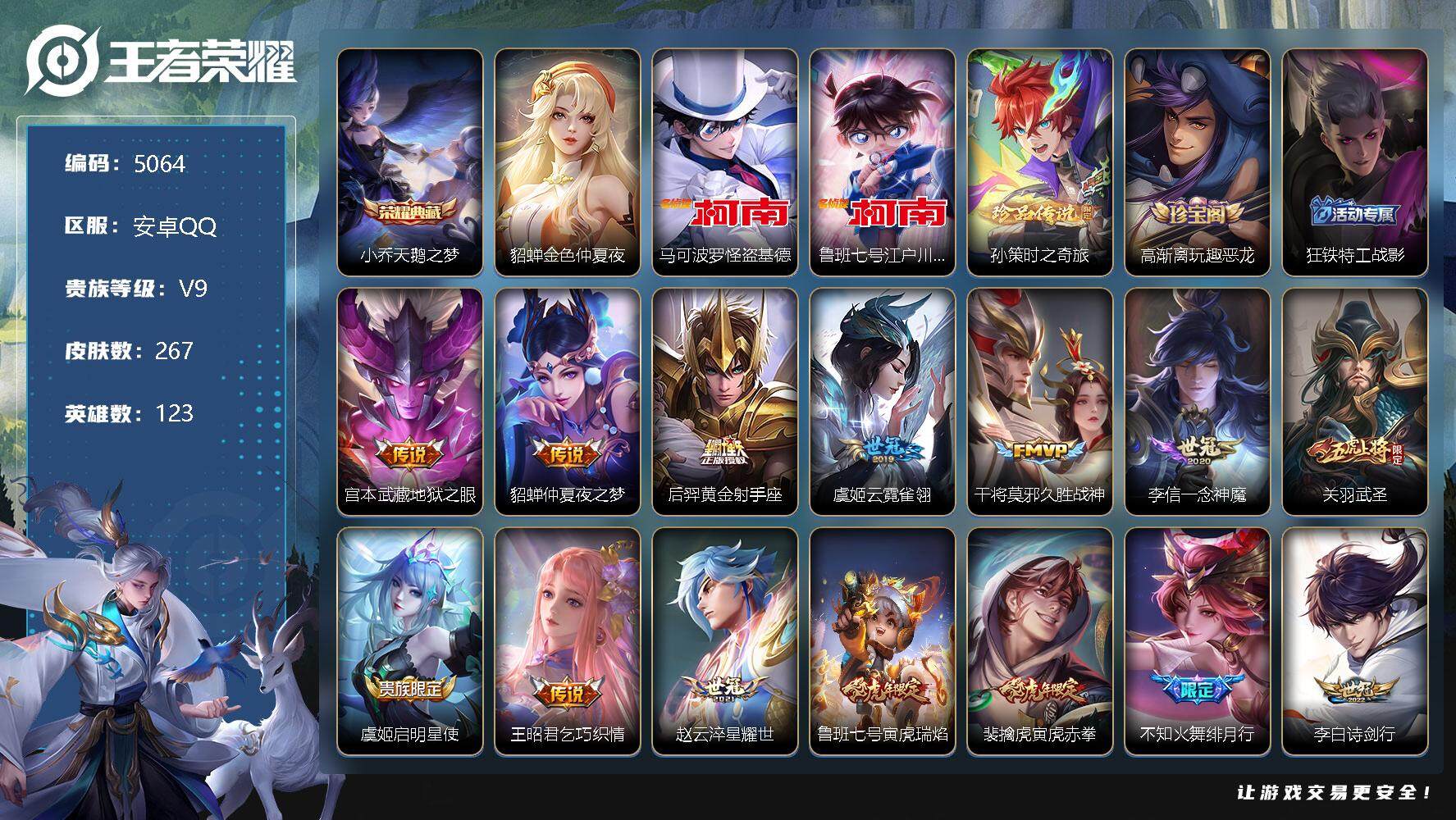 PX_2146188-?万象图鉴】【雪境甄姬·时之奇旅·全套名侦探柯南联动珍品】【14生肖限定】【无二次-2025.8.23出二次】ASYw13079-安卓Q-125英雄-351皮肤-290铭文-贵族积分10w【贵族9】【1典藏·1无双·3珍品·3星传说·35传说·1天幕·19按键】【因赛季更新游戏段付以上号为准!】 【荣耀典藏】:关羽赤影疾锋 【无双皮肤】:甄姬雪境奇遇 【珍品传说】:马可波罗怪盗基德,鲁班七号江户川柯南,孙策时之奇旅 【星元皮肤】:孙尚香未来机甲,孙悟空幽冥火,宫本武藏幽冥之眼 【天幕】:财神纳福天幕 【内测皮肤】:嬴政优雅恋人,高渐离玩趣恶龙,狂铁特工战影 【传说皮肤】:狄仁杰超时空战士,孙悟空地狱火,宫本武藏地狱之眼,孙尚香末日机甲,李白凤求凰,达摩黄金狮子座,干将莫邪久胜战神,张良黄金白羊座,李信一念神魔,关羽武圣,虞姬启明星使,镜炽阳神光,公孙离祈雪灵祝,赵云淬星耀世,孙尚香异界灵契,马超无双飞将,王昭君星穹之声,不知火舞绯月行,李信山海炽霜斩,伽罗炽翼辉光,夏洛特浮生妄,兰陵王影龙天霄,大乔时之奇旅,王昭君永恒水手月亮,狄仁杰夜礼服假面,露娜霜月吟,桑启鸣野蒿,裴擒虎祥瑞亨通,虞姬愿照岁时盈,蔡文姬愿照福禄聚,澜愿照九州拓,妲己愿照众生和,女娲愿照千秋盛,司空震愿照山河定,杨玉环星之鸣奏 【限定皮肤】:蔡文姬夏日便利店,虞姬夏日便利店,姜子牙天穹之誓,杨戬破阵退雄兵,狄仁杰阴阳师,赵云皇家上将,墨子神迹守卫,嬴政优雅恋人,孙尚香异界灵契,庄周高山流水,高渐离玩趣恶龙,钟无艳王者之锤,扁鹊奇幻香踪,芈月重明,吕布御风骁将,元歌云间偶戏,夏侯惇朔风刀,甄姬游园惊梦,曹操烛龙,典韦穷奇,典韦蓝屏警告,马可波罗山海玄木吟,狄仁杰魔术师,狄仁杰万华元夜,达摩星际陆战队,项羽海滩派对,老夫子醍醐杖,老夫子航海奇遇记,关羽武圣,程咬金演武夺筹,王昭君星穹之声,兰陵王影龙天霄,不知火舞绯月行,亚瑟潮玩骑士王,孙悟空至尊宝,孙悟空大圣娶亲,牛魔御旌,李元芳匿光侦查者,李元芳云中旅人,虞姬启明星使,钟馗驱傩正仪,杨戬潮玩骑兵,女娲朔望之晖,干将莫邪冰霜恋舞曲,雅典娜单词大作战,蔡文姬繁星吟游,鬼谷子原初探秘者,鬼谷子五谷丰年,大乔时之奇旅,黄忠烈魂,百里玄策原初追逐者,弈星混沌棋,公孙离祈雪灵祝,公孙离玉兔公主,明世隐疑决卦,裴擒虎李小龙,裴擒虎擒涛扼浪,狂铁御狮,米莱狄御霄,米莱狄胡桃异想国,云中君纤云弄巧,李信山海炽霜斩,伽罗炽翼辉光,盾山御銮,上官婉儿梁祝,嫦娥拒霜思,西施玲珑珍味,蒙犽狂想玩偶喵,鲁班大师探海日志,桑启海盐诗旅,夏洛特浮生妄,戈娅驭风魔法,艾琳流音漫舞,司空震地狱燃心,阿古朵江河有灵,张良古海寻踪,王昭君永恒水手月亮,狄仁杰夜礼服假面,蒙犽百解令,蒙恬荣光圣徽,高渐离燃音魔法,妲己灵卜魔法,鬼谷子天穹祈灯,伽罗琥珀纪元,沈梦溪龙舞盛年,鲁班七号蔬乡物语,李元芳蔬乡物语,刘邦剑破天穹,程咬金群星魔术团,镜青焰无极,项羽苍威无极,芈月浮光幕影 【年限皮肤】:李白凤求凰,公孙离祈雪灵祝,吕布御风骁将,关羽武圣,黄忠烈魂,马可波罗山海玄木吟,李信山海炽霜斩,伽罗炽翼辉光 【赛季限定】:芈月重明,夏侯惇朔风刀,曹操烛龙,典韦穷奇,狄仁杰万华元夜,老夫子醍醐杖,程咬金演武夺筹,张良古海寻踪,牛魔御旌,李元芳云中旅人,钟馗驱傩正仪,鬼谷子原初探秘者,百里玄策原初追逐者,弈星混沌棋,明世隐疑决卦,裴擒虎擒涛扼浪,狂铁御狮,米莱狄御霄,盾山御銮,鲁班大师探海日志,桑启海盐诗旅,鬼谷子天穹祈灯,蒙恬荣光圣徽,刘邦剑破天穹,姜子牙天穹之誓 【战令限定】:墨子神迹守卫,蔡文姬夏日便利店,虞姬夏日便利店,扁鹊奇幻香踪,元歌云间偶戏,典韦蓝屏警告,达摩星际陆战队,老夫子航海奇遇记,艾琳流音漫舞,亚瑟潮玩骑士王,杨戬潮玩骑兵,女娲朔望之晖,雅典娜单词大作战,米莱狄胡桃异想国,西施玲珑珍味,蒙犽狂想玩偶喵,司空震地狱燃心,戈娅驭风魔法,高渐离燃音魔法,妲己灵卜魔法,鲁班七号蔬乡物语,李元芳蔬乡物语,镜青焰无极,项羽苍威无极 【史诗皮肤】:鲁班七号电玩小子,项羽苍穹之光,露娜紫霞仙子,钟无艳王者之锤,赵云皇家上将,貂蝉圣诞恋歌,甄姬冰雪圆舞曲,王昭君偶像歌手,狄仁杰魔术师,廉颇地狱岩魂,宫本武藏鬼剑武藏,孙尚香水果甜心,嬴政优雅恋人,嬴政暗夜贵公子,嬴政摇滚巨星,妲己魅力维加斯,妲己女仆咖啡,墨子龙骑士,墨子金属风暴,吕布圣诞狂欢,刘禅绅士熊喵,曹操幽灵船长,李白千年之狐,吕布末日机甲,张飞乱世虎臣,孙悟空至尊宝,花木兰水晶猎龙者,刘邦德古拉伯爵,夏侯惇乘风破浪,小乔缤纷独角兽,兰陵王暗隐猎兽者,诸葛亮黄金分割率,甄姬游园惊梦,亚瑟心灵战警,安琪拉心灵骇客,百里守约特工魅影,铠曙光守护者,蔡文姬舞动绿茵,刘禅天才门将,李元芳逐浪之夏,程咬金功夫厨神,白起星夜王子,阿轲节奏热浪,孙策猫狗日记,大乔猫狗日记,干将莫邪冰霜恋舞曲,孙悟空大圣娶亲,典韦蓝屏警告,伽罗箭羽风息,狄仁杰鹰眼统帅,公孙离无限星赏官,上官婉儿梁祝,蔡文姬繁星吟游,大乔白蛇,不知火舞魅语,瑶遇见神鹿,黄忠烈魂,孙尚香时之恋人,蒙犽狂想玩偶喵,百里玄策原初追逐者,裴擒虎李小龙,云中君纤云弄巧,元歌云间偶戏,吕布御风骁将,米莱狄胡桃异想国,老夫子航海奇遇记,杨戬天秀启明,钟馗乐园奇幻夜,庄周高山流水,嫦娥拒霜思,夏洛