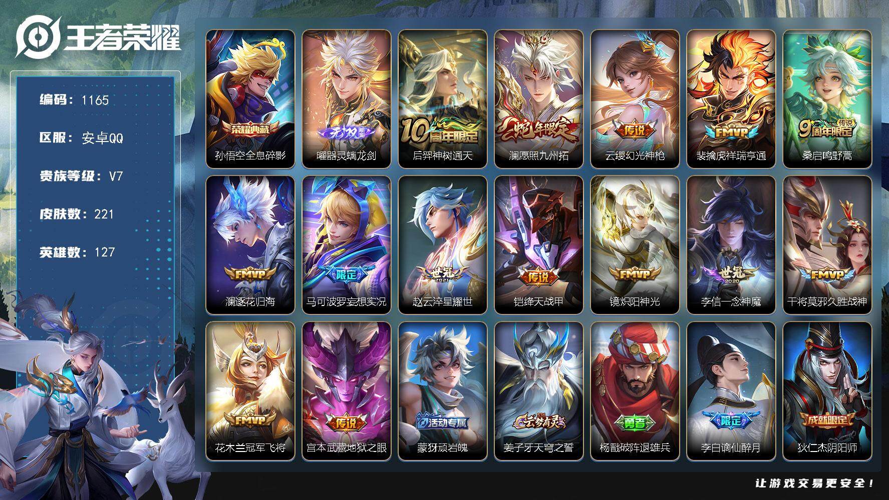 PX_2258984-【螭龙剑九州拓逐花归海至尊宝孙行者】安卓Q-V7-最强王者段位-127英雄-221皮肤-1典藏-0珍品无双-1无双-0珍品传说-14传说-58史诗 【英雄全皮】:孙权全皮,蒙恬全皮 【荣耀典藏】:孙悟空全息碎影 【无双皮肤】:曜器灵螭龙剑 【传说皮肤】:后羿神树通天,澜愿照九州拓,云缨幻光神枪,裴擒虎祥瑞亨通,桑启鸣野蒿,澜逐花归海,马可波罗妄想实况,赵云淬星耀世,铠绛天战甲,镜炽阳神光,李信一念神魔,干将莫邪久胜战神,花木兰冠军飞将,宫本武藏地狱之眼 【限定皮肤】:蒙犽顽岩魄,姜子牙天穹之誓,杨戬破阵退雄兵,李白谪仙醉月,狄仁杰阴阳师,赵云皇家上将,孙尚香蔷薇恋人,元歌无心,马可波罗妄想实况,狄仁杰魔术师,项羽海滩派对,王昭君午后时光,孙悟空至尊宝,孙悟空孙行者,李元芳云中旅人,干将莫邪胡桃夹子,鬼谷子五谷丰年,百里玄策原初追逐者,沈梦溪大漠名商,裴擒虎李小龙,裴擒虎擒涛扼浪,狂铁电玩高手,嫦娥暖冬兔眠,鲁班大师探海日志,桑启海盐诗旅,暃星界游侠,阿古朵江河有灵,张良古海寻踪,蒙犽百解令,蒙恬荣光圣徽,鬼谷子天穹祈灯,沈梦溪龙舞盛年,刘邦剑破天穹,周瑜熔金海岸 【年限皮肤】:马超神威 【赛季限定】:张良古海寻踪,李元芳云中旅人,百里玄策原初追逐者,沈梦溪大漠名商,裴擒虎擒涛扼浪,鲁班大师探海日志,桑启海盐诗旅,鬼谷子天穹祈灯,蒙恬荣光圣徽,刘邦剑破天穹,姜子牙天穹之誓 【战令限定】:王昭君午后时光,狂铁电玩高手,嫦娥暖冬兔眠,暃星界游侠 【史诗皮肤】:赵云皇家上将,赵云未来纪元,貂蝉圣诞恋歌,甄姬冰雪圆舞曲,狄仁杰魔术师,廉颇地狱岩魂,宫本武藏鬼剑武藏,孙尚香蔷薇恋人,孙尚香水果甜心,嬴政摇滚巨星,妲己魅力维加斯,妲己女仆咖啡,墨子金属风暴,曹操幽灵船长,李白千年之狐,张飞乱世虎臣,孙悟空至尊宝,花木兰水晶猎龙者,刘邦德古拉伯爵,夏侯惇乘风破浪,小乔缤纷独角兽,兰陵王暗隐猎兽者,诸葛亮黄金分割率,雅典娜冰冠公主,安琪拉心灵骇客,百里守约特工魅影,铠曙光守护者,蔡文姬舞动绿茵,刘禅天才门将,李元芳逐浪之夏,白起星夜王子,阿轲节奏热浪,孙策猫狗日记,狄仁杰鹰眼统帅,马超神威,百里玄策原初追逐者,裴擒虎李小龙,钟馗乐园奇幻夜,孙悟空孙行者,狂铁电玩高手,鬼谷子五谷丰年,元歌无心,暃星界游侠,刘禅电玩爆裂旋风,阿古朵江河有灵,蒙犽百解令,周瑜雪夜绮愿,蒙恬荣光圣徽,蒙犽顽岩魄,亚连破空之剑,李白谪仙醉月,牛魔星界战将,孙膑茶境仙,赵怀真器灵浮梦炉,阿轲化蝶舞,狂铁龙之律动,黄忠百相守梦,女娲万灵启世 【其他皮肤】:项羽海滩派对,韩信教廷特使,韩信街头霸王,露娜哥特玫瑰,阿轲致命风华,阿轲爱心护理,达摩大发明家,赵云忍炎影,芈月红桃皇后,白起白色死神,扁鹊化身博士,宫本武藏未来纪元,安琪拉玩偶对对碰,典韦黄金武士,亚瑟死亡骑士,花木兰兔女郎,甄姬花好人间,宫本武藏万象初新,后羿阿尔法小队,狄仁杰阴阳师,刘备汉昭烈帝,关羽龙腾万里,钟无艳海滩丽影,王昭君幻想奇妙夜,狂铁命运角斗场,老夫子功夫老勺,诸葛亮掌控之力,李白敏锐之力,鬼谷子幻乐之宴,苏烈坚韧之力,大乔守护之力,明世隐虹云星官,吕布野性能量,孙膑归虚梦演,沈梦溪鲨炮海盗猫,姜子牙炽热元素使,哪吒次元突破,盾山圆桌骑士,狂铁特工战影,刘禅秘密基地,露娜瓷语鉴心,张良缤纷绘卷,鲁班大师乓乓大师,干将莫邪胡桃夹子,程咬金无双福将,刘禅唤灵魔甲,王昭君午后时光,沈梦溪大漠名商,蒙恬蔚蓝守将,李元芳云中旅人,刘备潮玩造梦师,桑启海盐诗旅,嫦娥暖冬兔眠,海月幻泉雾影,猪八戒潮玩探月行,裴擒虎擒涛扼浪,太乙真人劲辣红锅,莱西奥西部游侠,鲁班大师探海日志,李元芳妄想特派,张良古海寻踪,钟无艳聚星闪耀,海月王牌新星,后羿完美运算,鬼谷子天穹祈灯,海诺时空谍影,嫦娥漠中幻影,廉颇功夫炙烤,沈梦溪龙舞盛年,钟无艳春野之旅,扁鹊无尽旅途,刘邦剑破天穹,大司命暗都幽影,杨戬破阵退雄兵,姜子牙天穹之誓,周瑜熔金海岸,孙悟空神迹守卫,盘古敬我三分,东皇太一噬灭天穹,亚瑟动物派对,干将莫邪雾都夜雨,吕布逐霄战戟,苍苍林狼骑,太乙真人谧流熔炉,典韦铁骨偃魂,马超访茗客,西施雪境奇遇,姜子牙星梦巡礼,明世隐景韶洛都,戈娅玫蓝誓约,刘备浪漫序章,钟馗虚灵犬护,苏烈春野闲踪,张良灵野札记,阿古朵布丁狗之约,露娜命运加冕,姬小满小满鸭,白起死霸装,甄姬逆浪荇歌,庄周锦麟游梦,莱西奥踏浪烽翎,鬼谷子克喵,亚瑟荣光之誓,孙权径山谋武,艾琳鹤鸣心笺,曹操逐霄之志,鲁班七号福禄兄弟,鲁班七号木偶奇遇记,高渐离金属狂潮,貂蝉异域舞娘,花木兰剑舞者,王昭君精灵公主,狄仁杰锦衣卫,后羿精灵王,李白范海辛,钟馗地府判官,虞姬加勒比小姐,关羽天启骑士,蔡文姬蔷薇王座,马可波罗激情绿茵,杨戬埃及法老,诸葛亮星航指挥官,黄忠芝加哥教父,干将莫邪第七人偶,铠龙域领主,百里守约绝影神枪,女娲尼罗河女神,公孙离花间舞,弈星踏雪寻梅,米莱狄精准探案法,元歌午夜歌剧院,司马懿魇语军师,盾山极冰防御线,伽罗花见巫女,李信灼热之刃,上官婉儿修竹墨客,曜归虚梦演,马超幸存者,西施归虚梦演,蒙恬秩序猎龙将,阿古朵熊喵少女,澜孤猎,司空震启蛰,云缨赤焰之缨,金蝉前尘,暃碧珀绯影,桑启画中游 【内测皮肤】:孙尚香蔷薇恋人,狂铁特工战影,干将莫邪胡桃夹子 【营地ID】:1733044
