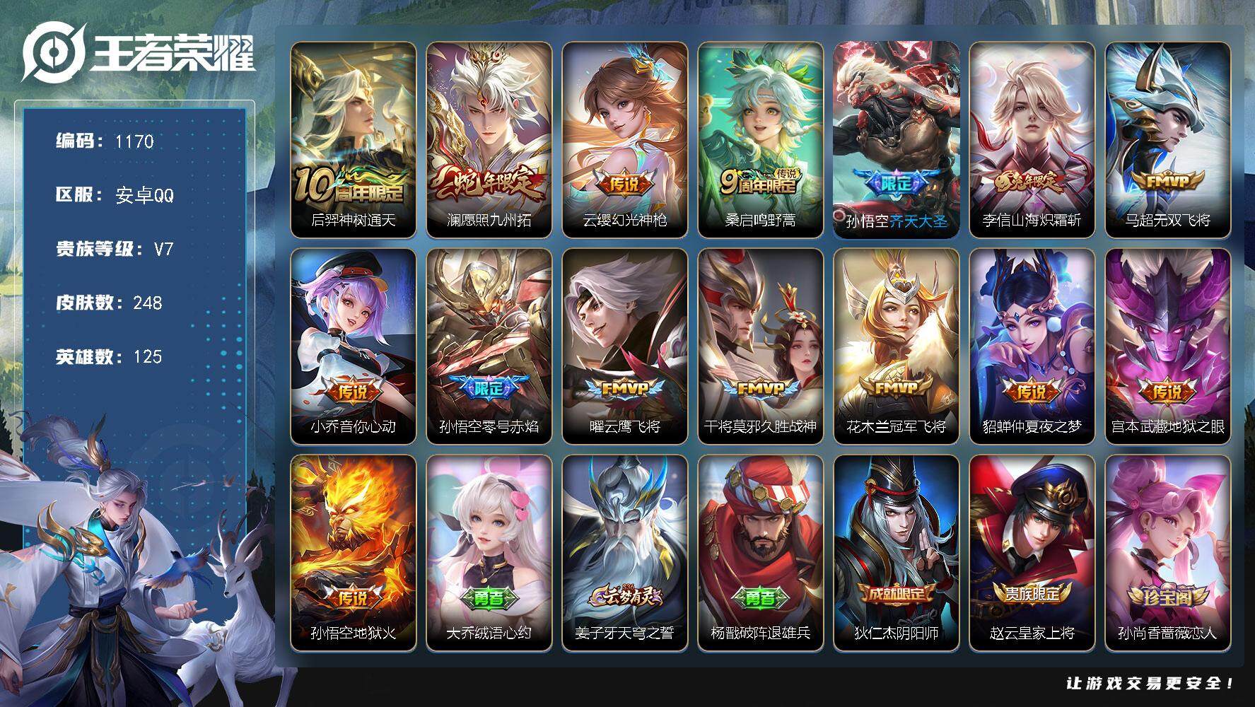 PX_2259003-【248皮15传说,愿照九州拓,齐天大圣,山海炽霜斩,无双飞将】安卓Q-V7-最强王者段位-125英雄-248皮肤-0典藏-0珍品无双-0无双-0珍品传说-15传说-70史诗 【传说皮肤】:后羿神树通天,澜愿照九州拓,云缨幻光神枪,桑启鸣野蒿,孙悟空齐天大圣,李信山海炽霜斩,马超无双飞将,小乔音你心动,孙悟空零号赤焰,曜云鹰飞将,干将莫邪久胜战神,花木兰冠军飞将,貂蝉仲夏夜之梦,宫本武藏地狱之眼,孙悟空地狱火 【限定皮肤】:大乔绒语心约,姜子牙天穹之誓,杨戬破阵退雄兵,狄仁杰阴阳师,赵云皇家上将,孙尚香蔷薇恋人,庄周高山流水,扁鹊奇幻香踪,元歌无心,甄姬游园惊梦,马可波罗山海玄木吟,狄仁杰魔术师,达摩沙漠行僧,项羽海滩派对,程咬金演武夺筹,韩信傲雪梅枪,兰陵王金庭之子,孙悟空零号赤焰,孙悟空孙行者,孙悟空齐天大圣,后羿如梦令,后羿圣弓游侠,李元芳银河之约,李元芳云中旅人,钟馗驱傩正仪,杨戬潮玩骑兵,干将莫邪真爱魔法,鬼谷子五谷丰年,苏烈千军破阵,百里守约朱雀志,沈梦溪大漠名商,裴擒虎李小龙,裴擒虎擒涛扼浪,云中君纤云弄巧,李信山海炽霜斩,嫦娥拒霜思,西施玲珑珍味,鲁班大师探海日志,桑启海盐诗旅,戈娅驭风魔法,艾琳女武神,艾琳流音漫舞,司空震地狱燃心,阿古朵江河有灵,张良古海寻踪,蒙犽百解令,鬼谷子天穹祈灯,沈梦溪龙舞盛年,刘邦剑破天穹,上官婉儿群星魔术团,镜青焰无极,项羽苍威无极,刘备异域游侠,周瑜熔金海岸 【年限皮肤】:百里守约朱雀志,马可波罗山海玄木吟,李信山海炽霜斩 【赛季限定】:达摩沙漠行僧,程咬金演武夺筹,兰陵王金庭之子,张良古海寻踪,李元芳云中旅人,钟馗驱傩正仪,苏烈千军破阵,沈梦溪大漠名商,裴擒虎擒涛扼浪,鲁班大师探海日志,桑启海盐诗旅,鬼谷子天穹祈灯,刘邦剑破天穹,姜子牙天穹之誓 【战令限定】:扁鹊奇幻香踪,艾琳流音漫舞,后羿圣弓游侠,李元芳银河之约,杨戬潮玩骑兵,干将莫邪真爱魔法,西施玲珑珍味,司空震地狱燃心,戈娅驭风魔法,镜青焰无极,项羽苍威无极 【史诗皮肤】:项羽苍穹之光,露娜紫霞仙子,赵云嘻哈天王,赵云皇家上将,赵云未来纪元,貂蝉圣诞恋歌,甄姬冰雪圆舞曲,王昭君偶像歌手,狄仁杰魔术师,宫本武藏鬼剑武藏,孙尚香蔷薇恋人,孙尚香水果甜心,嬴政摇滚巨星,妲己魅力维加斯,妲己女仆咖啡,墨子龙骑士,墨子金属风暴,吕布圣诞狂欢,曹操幽灵船长,李白千年之狐,吕布末日机甲,小乔缤纷独角兽,兰陵王暗隐猎兽者,甄姬游园惊梦,亚瑟心灵战警,雅典娜冰冠公主,百里守约特工魅影,铠曙光守护者,蔡文姬舞动绿茵,刘禅天才门将,李元芳逐浪之夏,程咬金功夫厨神,白起星夜王子,阿轲节奏热浪,孙策猫狗日记,大乔猫狗日记,百里守约朱雀志,伽罗箭羽风息,狄仁杰鹰眼统帅,李元芳银河之约,娜可露露晚萤,后羿如梦令,不知火舞魅语,橘右京修罗,裴擒虎李小龙,云中君纤云弄巧,干将莫邪真爱魔法,孙悟空孙行者,庄周高山流水,嫦娥拒霜思,韩信傲雪梅枪,澜赏金猎手,鬼谷子五谷丰年,元歌无心,马可波罗山海玄木吟,扁鹊奇幻香踪,刘禅电玩爆裂旋风,戈娅驭风魔法,司空震地狱燃心,阿古朵江河有灵,蒙犽百解令,上官婉儿群星魔术团,镜青焰无极,亚连破空之剑,艾琳陌上桑,赵怀真器灵浮梦炉,扁鹊灵蛊蚀心,黄忠百相守梦,公孙离涂山容容,女娲万灵启世 【其他皮肤】:项羽海滩派对,韩信教廷特使,韩信街头霸王,阿轲爱心护理,赵云忍炎影,艾琳女武神,程咬金星际陆战队,白起白色死神,牛魔西部大镖客,扁鹊化身博士,扁鹊救世之瞳,安琪拉玩偶对对碰,孙膑天使之翼,姜子牙时尚教父,妲己少女阿狸,典韦黄金武士,亚瑟死亡骑士,达摩拳王,张飞五福同心,甄姬花好人间,宫本武藏万象初新,后羿阿尔法小队,狄仁杰阴阳师,刘备纽约教父,刘备汉昭烈帝,关羽龙腾万里,钟无艳海滩丽影,狂铁命运角斗场,老夫子功夫老勺,孙尚香沉稳之力,李白敏锐之力,鬼谷子幻乐之宴,苏烈坚韧之力,大乔守护之力,明世隐虹云星官,吕布野性能量,孙膑归虚梦演,沈梦溪鲨炮海盗猫,姜子牙炽热元素使,哪吒次元突破,鲁班七号黑桃队长,盾山圆桌骑士,狂铁特工战影,刘禅秘密基地,露娜瓷语鉴心,程咬金演武夺筹,张良缤纷绘卷,钟馗驱傩正仪,鲁班大师乓乓大师,苏烈千军破阵,后羿圣弓游侠,典韦铁甲之心,妲己紫罗兰之誓,马可波罗潮玩牛仔,达摩沙漠行僧,程咬金无双福将,刘邦虎啸剑宗,兰陵王金庭之子,米莱狄契约魔法,沈梦溪大漠名商,蒙恬蔚蓝守将,李元芳云中旅人,桑启海盐诗旅,海月幻泉雾影,猪八戒潮玩探月行,牛魔牛运亨通,白起乐园追猎者,裴擒虎擒涛扼浪,杨戬潮玩骑兵,太乙真人劲辣红锅,莱西奥西部游侠,鲁班大师探海日志,西施玲珑珍味,李元芳妄想特派,艾琳流音漫舞,张良古海寻踪,钟无艳聚星闪耀,兰陵王幻夜行动,曹操决胜大满贯,后羿完美运算,鬼谷子天穹祈灯,朵莉亚金色潮汐,廉颇功夫炙烤,沈梦溪龙舞盛年,钟无艳春野之旅,刘邦剑破天穹,项羽苍威无极,大司命暗都幽影,刘备异域游侠,杨戬破阵退雄兵,貂蝉长夏之忆,姜子牙天穹之誓,周瑜熔金海岸,大乔绒语心约,孙悟空神迹守卫,东皇太一噬灭天穹,亚瑟动物派对,姜子牙星梦巡礼,东皇太一金福满堂,达摩爆裂喵拳,少司缘灵卦秘语,甄姬逆浪荇歌,云中君云械蓝图,莱西奥踏浪烽翎,鬼谷子克喵,哪吒罗小黑战记,亚瑟荣光之誓,艾琳鹤鸣心笺,鲁班七号福禄兄弟,鲁班七号木偶奇遇记,