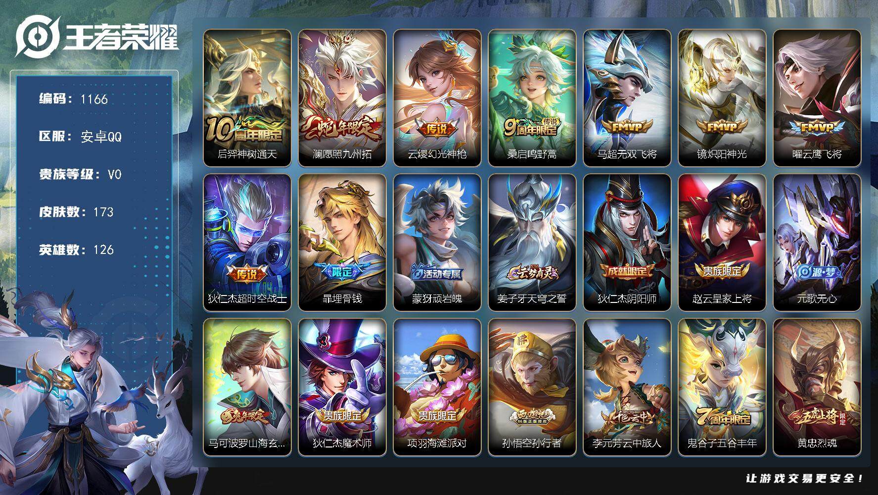 PX_2258985-【173皮8传说,云鹰飞将炽阳神光九州拓孙行者】安卓Q-V0-至尊星耀III段位-126英雄-173皮肤-0典藏-0珍品无双-0无双-0珍品传说-8传说-47史诗 【传说皮肤】:后羿神树通天,澜愿照九州拓,云缨幻光神枪,桑启鸣野蒿,马超无双飞将,镜炽阳神光,曜云鹰飞将,狄仁杰超时空战士 【限定皮肤】:暃埋骨钱,蒙犽顽岩魄,姜子牙天穹之誓,狄仁杰阴阳师,赵云皇家上将,元歌无心,马可波罗山海玄木吟,狄仁杰魔术师,项羽海滩派对,孙悟空孙行者,李元芳云中旅人,鬼谷子五谷丰年,黄忠烈魂,百里玄策原初追逐者,沈梦溪大漠名商,裴擒虎擒涛扼浪,嫦娥拒霜思,鲁班大师探海日志,桑启海盐诗旅,张良古海寻踪,蒙犽百解令,高渐离燃音魔法,妲己灵卜魔法,鬼谷子天穹祈灯,姬小满妄想食味,沈梦溪龙舞盛年,鲁班七号蔬乡物语,李元芳蔬乡物语,刘邦剑破天穹,程咬金群星魔术团,镜青焰无极,项羽苍威无极,刘备异域游侠,芈月浮光幕影,周瑜熔金海岸 【年限皮肤】:黄忠烈魂,马可波罗山海玄木吟 【赛季限定】:张良古海寻踪,李元芳云中旅人,百里玄策原初追逐者,沈梦溪大漠名商,裴擒虎擒涛扼浪,鲁班大师探海日志,桑启海盐诗旅,鬼谷子天穹祈灯,刘邦剑破天穹,姜子牙天穹之誓 【战令限定】:高渐离燃音魔法,妲己灵卜魔法,鲁班七号蔬乡物语,李元芳蔬乡物语,镜青焰无极,项羽苍威无极 【史诗皮肤】:赵云皇家上将,赵云未来纪元,貂蝉圣诞恋歌,狄仁杰魔术师,宫本武藏鬼剑武藏,孙尚香水果甜心,嬴政摇滚巨星,妲己女仆咖啡,墨子金属风暴,刘禅绅士熊喵,曹操幽灵船长,吕布末日机甲,张飞乱世虎臣,花木兰水晶猎龙者,小乔缤纷独角兽,兰陵王暗隐猎兽者,雅典娜冰冠公主,安琪拉心灵骇客,百里守约特工魅影,李元芳逐浪之夏,程咬金功夫厨神,阿轲节奏热浪,狄仁杰鹰眼统帅,小乔青蛇,黄忠烈魂,孙尚香时之恋人,百里玄策原初追逐者,孙悟空孙行者,嫦娥拒霜思,貂蝉唤灵魅影,鬼谷子五谷丰年,元歌无心,马可波罗山海玄木吟,刘禅电玩爆裂旋风,百里守约真我赫兹,蒙犽百解令,妲己灵卜魔法,高渐离燃音魔法,姬小满妄想食味,鲁班七号蔬乡物语,镜青焰无极,芈月浮光幕影,蒙犽顽岩魄,暃埋骨钱,姬小满战舞者,亚连破空之剑,牛魔星界战将,阿轲化蝶舞 【其他皮肤】:项羽海滩派对,韩信教廷特使,韩信街头霸王,露娜哥特玫瑰,芈月红桃皇后,牛魔西部大镖客,武则天东方不败,庄周鲤鱼之梦,宫本武藏未来纪元,安琪拉玩偶对对碰,姜子牙时尚教父,典韦黄金武士,亚瑟死亡骑士,花木兰兔女郎,刘备万事如意,狄仁杰阴阳师,刘备纽约教父,刘备汉昭烈帝,关羽龙腾万里,钟无艳海滩丽影,王昭君幻想奇妙夜,老夫子功夫老勺,孙尚香沉稳之力,诸葛亮掌控之力,李白敏锐之力,大乔守护之力,明世隐虹云星官,小乔丁香结,吕布野性能量,孙膑归虚梦演,沈梦溪鲨炮海盗猫,姜子牙炽热元素使,哪吒次元突破,鲁班七号黑桃队长,狂铁特工战影,鲁班大师乓乓大师,程咬金无双福将,米莱狄契约魔法,沈梦溪大漠名商,蒙恬蔚蓝守将,李元芳云中旅人,刘备潮玩造梦师,桑启海盐诗旅,海月幻泉雾影,猪八戒潮玩探月行,牛魔牛运亨通,赵怀真太极少年,裴擒虎擒涛扼浪,太乙真人劲辣红锅,鲁班大师探海日志,姬小满零食大作战,李元芳妄想特派,哪吒热血海滩,张良古海寻踪,后羿完美运算,鬼谷子天穹祈灯,妲己灵卜魔法,嫦娥漠中幻影,廉颇功夫炙烤,亚瑟鸿运当头,沈梦溪龙舞盛年,钟无艳春野之旅,李元芳蔬乡物语,扁鹊无尽旅途,刘邦剑破天穹,程咬金群星魔术团,项羽苍威无极,大司命暗都幽影,刘备异域游侠,貂蝉长夏之忆,姜子牙天穹之誓,周瑜熔金海岸,孙悟空神迹守卫,盘古敬我三分,东皇太一噬灭天穹,干将莫邪雾都夜雨,吕布逐霄战戟,苍苍林狼骑,太乙真人谧流熔炉,典韦铁骨偃魂,西施雪境奇遇,姜子牙星梦巡礼,明世隐景韶洛都,戈娅玫蓝誓约,刘备浪漫序章,艾琳鹤鸣心笺,项羽帝国元帅,貂蝉异域舞娘,老夫子潮流仙人,孙膑未来旅行,李白范海辛,钟馗地府判官,刘邦圣殿之光,虞姬加勒比小姐,雅典娜战争女神,马可波罗激情绿茵,苍维京掠夺者,大乔伊势巫女,百里守约绝影神枪,百里玄策威尼斯狂欢,梦奇美梦成真,女娲尼罗河女神,裴擒虎街头旋风,弈星踏雪寻梅,元歌午夜歌剧院,司马懿魇语军师,盾山极冰防御线,伽罗花见巫女,上官婉儿修竹墨客,盘古创世神祝,曜归虚梦演,马超幸存者,镜冰刃幻境,阿古朵熊喵少女,澜孤猎,司空震启蛰,云缨赤焰之缨,暃碧珀绯影 【内测皮肤】:狂铁特工战影 【营地ID】:1730283623
