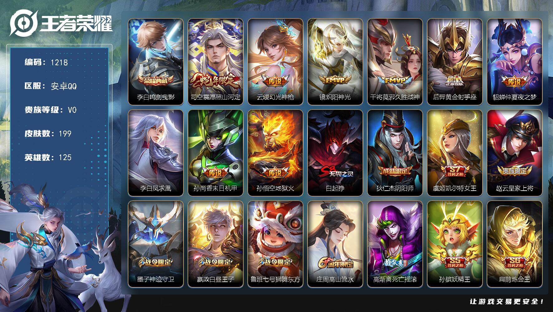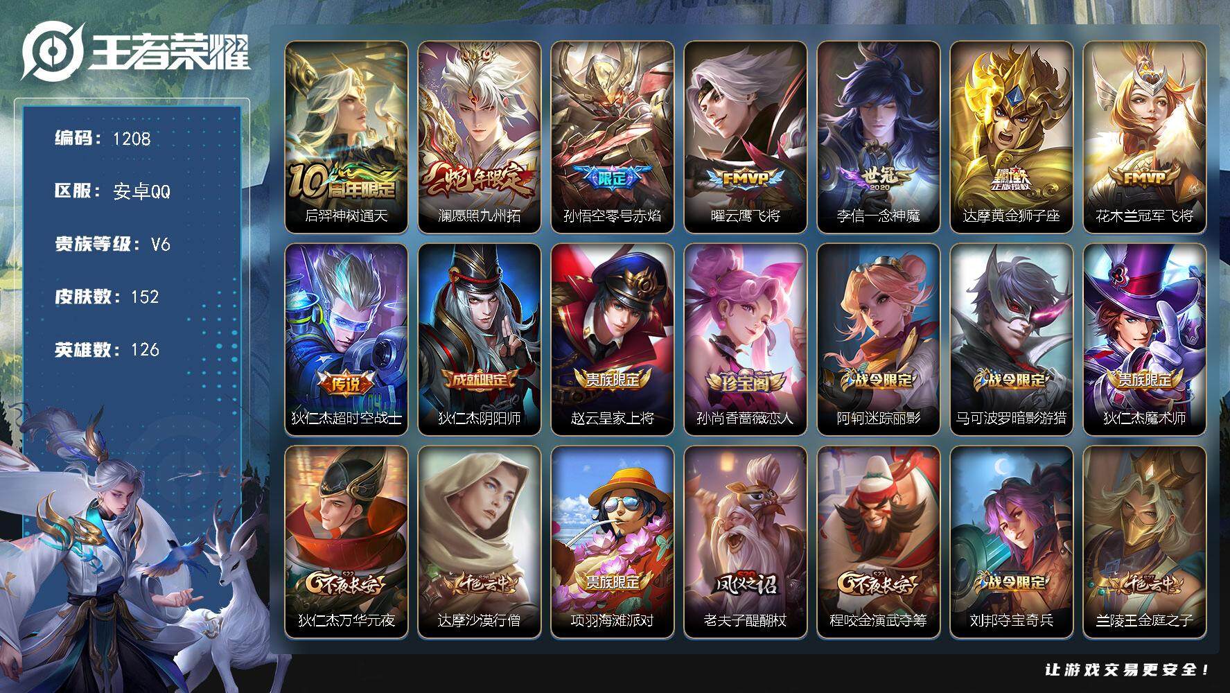 PX_2268408-【152皮8传说,澜愿照九州拓,黄金狮子座,零号赤焰】安卓Q-V6-永恒钻石I段位-126英雄-152皮肤-0典藏-0珍品无双-0无双-0珍品传说-8传说-34史诗 【传说皮肤】:后羿神树通天,澜愿照九州拓,孙悟空零号赤焰,曜云鹰飞将,李信一念神魔,达摩黄金狮子座,花木兰冠军飞将,狄仁杰超时空战士 【限定皮肤】:狄仁杰阴阳师,赵云皇家上将,孙尚香蔷薇恋人,阿轲迷踪丽影,马可波罗暗影游猎,狄仁杰魔术师,狄仁杰万华元夜,达摩沙漠行僧,项羽海滩派对,老夫子醍醐杖,程咬金演武夺筹,刘邦夺宝奇兵,兰陵王金庭之子,孙悟空零号赤焰,李元芳云中旅人,钟馗驱傩正仪,蔡文姬繁星吟游,鬼谷子原初探秘者,苏烈千军破阵,百里守约朱雀志,沈梦溪大漠名商,明世隐疑决卦,裴擒虎李小龙,裴擒虎擒涛扼浪,云中君纤云弄巧,猪八戒西部大镖客,桑启海盐诗旅,艾琳女武神,鬼谷子天穹祈灯,刘邦剑破天穹 【年限皮肤】:百里守约朱雀志 【赛季限定】:狄仁杰万华元夜,达摩沙漠行僧,老夫子醍醐杖,程咬金演武夺筹,兰陵王金庭之子,李元芳云中旅人,钟馗驱傩正仪,鬼谷子原初探秘者,苏烈千军破阵,沈梦溪大漠名商,明世隐疑决卦,裴擒虎擒涛扼浪,桑启海盐诗旅,鬼谷子天穹祈灯,刘邦剑破天穹 【战令限定】:阿轲迷踪丽影,马可波罗暗影游猎,刘邦夺宝奇兵,猪八戒西部大镖客 【史诗皮肤】:露娜紫霞仙子,赵云皇家上将,甄姬冰雪圆舞曲,狄仁杰魔术师,宫本武藏鬼剑武藏,孙尚香蔷薇恋人,孙尚香水果甜心,嬴政摇滚巨星,妲己魅力维加斯,曹操幽灵船长,吕布末日机甲,张飞乱世虎臣,刘邦德古拉伯爵,夏侯惇乘风破浪,兰陵王暗隐猎兽者,雅典娜冰冠公主,李元芳逐浪之夏,程咬金功夫厨神,百里守约朱雀志,狄仁杰鹰眼统帅,蔡文姬繁星吟游,娜可露露晚萤,不知火舞魅语,阿轲迷踪丽影,橘右京修罗,马可波罗暗影游猎,裴擒虎李小龙,云中君纤云弄巧,杨戬天秀启明,阿轲化蝶舞,刘禅鸭鸭历险记,狂铁龙之律动,老夫子藏狐褐绒,少司缘巫礼祀神 【其他皮肤】:项羽海滩派对,韩信教廷特使,韩信街头霸王,达摩大发明家,赵云忍炎影,芈月红桃皇后,艾琳女武神,白起白色死神,牛魔西部大镖客,扁鹊救世之瞳,宫本武藏未来纪元,安琪拉玩偶对对碰,孙膑天使之翼,姜子牙时尚教父,妲己少女阿狸,典韦黄金武士,亚瑟死亡骑士,达摩拳王,花木兰兔女郎,张飞五福同心,甄姬花好人间,刘备万事如意,宫本武藏万象初新,后羿阿尔法小队,狄仁杰阴阳师,刘备汉昭烈帝,关羽龙腾万里,墨子进击墨子号,钟无艳海滩丽影,宫本武藏霸王丸,狂铁命运角斗场,老夫子功夫老勺,诸葛亮掌控之力,李白敏锐之力,苏烈坚韧之力,大乔守护之力,庄周奇妙博物学,吕布野性能量,沈梦溪鲨炮海盗猫,哪吒次元突破,明世隐疑决卦,刘邦夺宝奇兵,盾山圆桌骑士,老夫子醍醐杖,猪八戒西部大镖客,鬼谷子原初探秘者,狄仁杰万华元夜,刘禅秘密基地,程咬金演武夺筹,张良缤纷绘卷,盘古重装意志,钟馗驱傩正仪,鲁班大师乓乓大师,苏烈千军破阵,达摩沙漠行僧,程咬金无双福将,兰陵王金庭之子,沈梦溪大漠名商,蒙恬蔚蓝守将,李元芳云中旅人,桑启海盐诗旅,猪八戒潮玩探月行,裴擒虎擒涛扼浪,后羿完美运算,鬼谷子天穹祈灯,刘邦剑破天穹,东皇太一噬灭天穹,太乙真人谧流熔炉,姜子牙星梦巡礼,达摩爆裂喵拳,明世隐景韶洛都,戈娅玫蓝誓约,刘备浪漫序章,钟馗虚灵犬护,沈梦溪鸭鸭历险记,苏烈春野闲踪,张良灵野札记,阿古朵布丁狗之约,亚瑟荣光之誓,艾琳鹤鸣心笺,鲁班七号福禄兄弟,高渐离金属狂潮,王昭君精灵公主,狄仁杰锦衣卫,曹操超能战警,孙悟空西部大镖客,周瑜海军大将,兰陵王隐刃,李白范海辛,钟馗地府判官,李元芳特种部队,马可波罗激情绿茵,苍维京掠夺者,干将莫邪第七人偶,百里守约绝影神枪,梦奇美梦成真,裴擒虎街头旋风,弈星踏雪寻梅,孙策海之征途,司马懿魇语军师,伽罗花见巫女,李信灼热之刃,猪八戒年年有余,蒙犽归虚梦演,镜冰刃幻境,蒙恬秩序猎龙将,澜孤猎,司空震启蛰,云缨赤焰之缨,金蝉前尘 【内测皮肤】:孙尚香蔷薇恋人,艾琳女武神 【营地ID】:1718794649