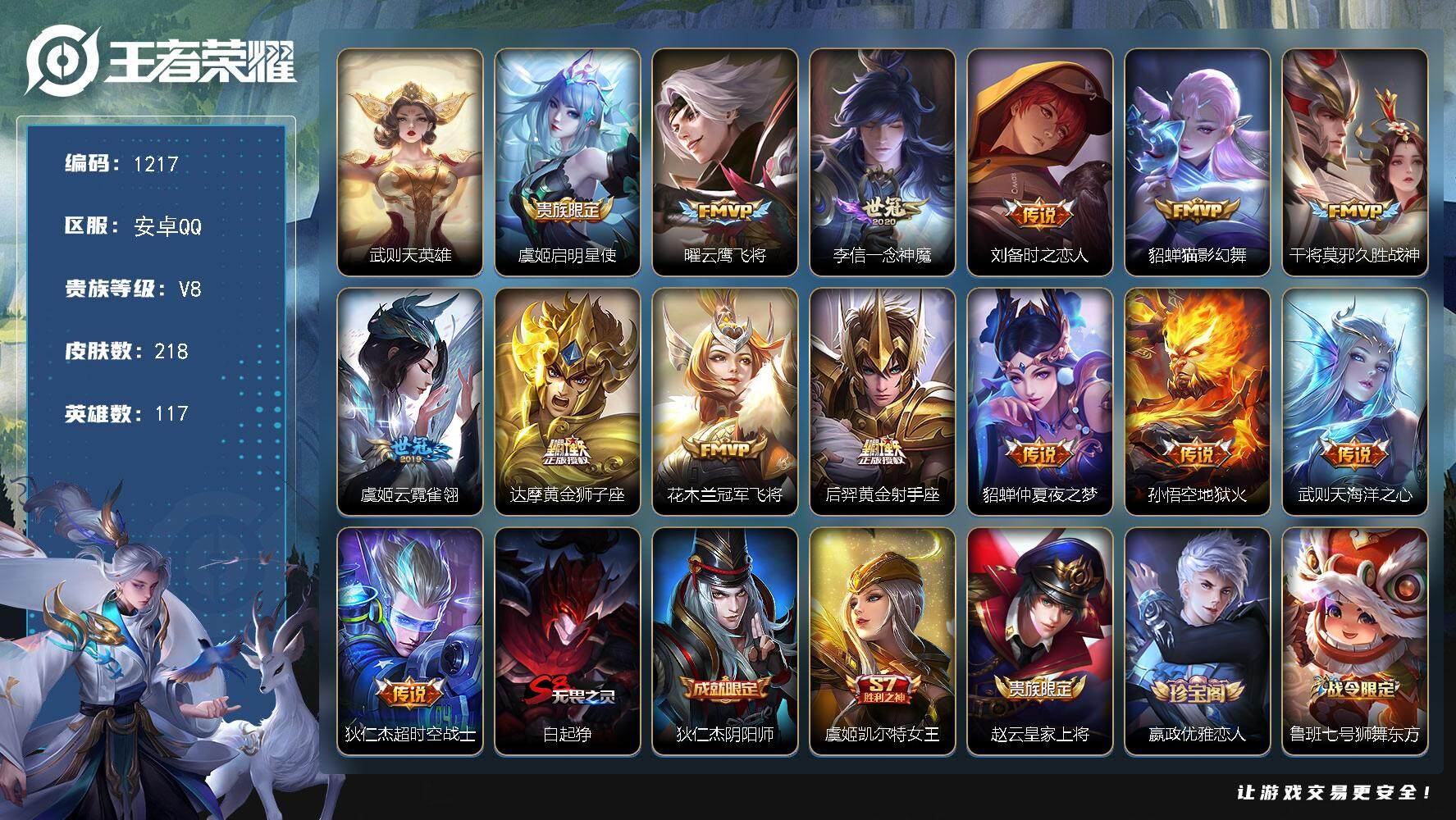 PX_2268393-【至尊宝云鹰飞将,218皮14传说】安卓Q-V8-永恒钻石IV段位-117英雄-218皮肤-0典藏-0珍品无双-0无双-0珍品传说-14传说-51史诗 【荣耀典藏】:武则天英雄 【传说皮肤】:虞姬启明星使,曜云鹰飞将,李信一念神魔,刘备时之恋人,貂蝉猫影幻舞,干将莫邪久胜战神,虞姬云霓雀翎,达摩黄金狮子座,花木兰冠军飞将,后羿黄金射手座,貂蝉仲夏夜之梦,孙悟空地狱火,武则天海洋之心,狄仁杰超时空战士 【限定皮肤】:白起狰,狄仁杰阴阳师,虞姬凯尔特女王,赵云皇家上将,嬴政优雅恋人,鲁班七号狮舞东方,阿轲迷踪丽影,孙膑妖精王,扁鹊炼金王,芈月重明,周瑜赤莲之焰,夏侯惇朔风刀,甄姬游园惊梦,曹操烛龙,典韦穷奇,马可波罗暗影游猎,狄仁杰魔术师,狄仁杰万华元夜,项羽海滩派对,老夫子圣诞老人,老夫子醍醐杖,程咬金演武夺筹,刘邦夺宝奇兵,韩信飞衡,兰陵王驯魔猎人,孙悟空至尊宝,牛魔御旌,虞姬启明星使,钟馗神迹守卫,钟馗驱傩正仪,雅典娜单词大作战,蔡文姬繁星吟游,太乙真人饕餮,鬼谷子原初探秘者,百里玄策原初追逐者,弈星混沌棋,明世隐疑决卦,裴擒虎李小龙,裴擒虎擒涛扼浪,狂铁御狮,米莱狄御霄,盾山御銮,猪八戒西部大镖客,上官婉儿梁祝,上官婉儿天狼绘梦者,蒙犽狂想玩偶喵,鲁班大师探海日志,桑启海盐诗旅,阿古朵江河有灵,张良古海寻踪,鬼谷子天穹祈灯 【年限皮肤】:韩信飞衡 【赛季限定】:孙膑妖精王,扁鹊炼金王,白起狰,芈月重明,夏侯惇朔风刀,曹操烛龙,典韦穷奇,狄仁杰万华元夜,老夫子醍醐杖,程咬金演武夺筹,张良古海寻踪,牛魔御旌,虞姬凯尔特女王,钟馗驱傩正仪,太乙真人饕餮,鬼谷子原初探秘者,百里玄策原初追逐者,弈星混沌棋,明世隐疑决卦,裴擒虎擒涛扼浪,狂铁御狮,米莱狄御霄,盾山御銮,鲁班大师探海日志,桑启海盐诗旅,鬼谷子天穹祈灯 【战令限定】:鲁班七号狮舞东方,阿轲迷踪丽影,周瑜赤莲之焰,马可波罗暗影游猎,刘邦夺宝奇兵,兰陵王驯魔猎人,钟馗神迹守卫,雅典娜单词大作战,猪八戒西部大镖客,蒙犽狂想玩偶喵 【史诗皮肤】:项羽职棒王牌,露娜紫霞仙子,阿轲暗夜猫娘,赵云皇家上将,赵云未来纪元,貂蝉圣诞恋歌,老夫子圣诞老人,甄姬冰雪圆舞曲,狄仁杰魔术师,孙尚香水果甜心,嬴政优雅恋人,嬴政暗夜贵公子,嬴政摇滚巨星,妲己魅力维加斯,妲己女仆咖啡,墨子龙骑士,墨子金属风暴,吕布圣诞狂欢,刘禅绅士熊喵,曹操幽灵船长,李白千年之狐,韩信白龙吟,孙悟空至尊宝,花木兰水晶猎龙者,刘邦德古拉伯爵,兰陵王暗隐猎兽者,诸葛亮黄金分割率,甄姬游园惊梦,雅典娜冰冠公主,安琪拉心灵骇客,百里守约特工魅影,白起星夜王子,孙策猫狗日记,伽罗箭羽风息,鲁班七号狮舞东方,狄仁杰鹰眼统帅,公孙离无限星赏官,兰陵王驯魔猎人,上官婉儿梁祝,蔡文姬繁星吟游,娜可露露晚萤,韩信飞衡,阿轲迷踪丽影,橘右京修罗,孙尚香时之恋人,上官婉儿天狼绘梦者,马可波罗暗影游猎,蒙犽狂想玩偶喵,百里玄策原初追逐者,裴擒虎李小龙,阿古朵江河有灵 【其他皮肤】:项羽海滩派对,韩信教廷特使,韩信街头霸王,露娜哥特玫瑰,阿轲爱心护理,达摩大发明家,赵云白执事,赵云忍炎影,程咬金星际陆战队,白起白色死神,扁鹊化身博士,庄周鲤鱼之梦,孙膑天使之翼,姜子牙时尚教父,妲己少女阿狸,典韦黄金武士,亚瑟死亡骑士,达摩拳王,花木兰兔女郎,刘备万事如意,宫本武藏万象初新,后羿阿尔法小队,狄仁杰阴阳师,刘备纽约教父,孙膑妖精王,扁鹊炼金王,虞姬凯尔特女王,墨子进击墨子号,白起狰,钟无艳海滩丽影,太乙真人饕餮,宫本武藏霸王丸,曹操烛龙,王昭君幻想奇妙夜,芈月重明,老夫子功夫老勺,典韦穷奇,诸葛亮掌控之力,鬼谷子幻乐之宴,狂铁御狮,大乔守护之力,米莱狄御霄,明世隐虹云星官,牛魔御旌,小乔丁香结,吕布野性能量,钟馗神迹守卫,盾山御銮,孙膑归虚梦演,沈梦溪鲨炮海盗猫,姜子牙炽热元素使,夏侯惇朔风刀,周瑜赤莲之焰,弈星混沌棋,哪吒次元突破,鲁班七号黑桃队长,明世隐疑决卦,刘邦夺宝奇兵,老夫子醍醐杖,猪八戒西部大镖客,廉颇无尽征程,鬼谷子原初探秘者,雅典娜单词大作战,狄仁杰万华元夜,刘禅秘密基地,杨戬次元傲视,露娜瓷语鉴心,程咬金演武夺筹,钟馗驱傩正仪,程咬金无双福将,桑启海盐诗旅,猪八戒潮玩探月行,裴擒虎擒涛扼浪,太乙真人劲辣红锅,鲁班大师探海日志,张良古海寻踪,钟无艳聚星闪耀,亚连破局者,兰陵王幻夜行动,鬼谷子天穹祈灯,海诺时空谍影,鲁班七号福禄兄弟,鲁班七号木偶奇遇记,高渐离金属狂潮,项羽帝国元帅,露娜绯红之刃,钟无艳生化警戒,貂蝉异域舞娘,花木兰剑舞者,老夫子潮流仙人,王昭君精灵公主,曹操死神来了,曹操超能战警,张良一千零一夜,小乔万圣前夜,孙膑未来旅行,孙悟空西部大镖客,周瑜海军大将,后羿精灵王,刘禅英喵野望,兰陵王隐刃,李白范海辛,钟馗地府判官,李元芳特种部队,刘邦圣殿之光,关羽天启骑士,蔡文姬蔷薇王座,马可波罗激情绿茵,苍维京掠夺者,杨戬埃及法老,太乙真人圆桌骑士,哪吒三太子,诸葛亮星航指挥官,黄忠芝加哥教父,大乔伊势巫女,东皇太一东海龙王,干将莫邪第七人偶,鬼谷子阿摩司公爵,铠龙域领主,百里守约绝影神枪,百里玄策威尼斯狂欢,苏烈爱与和平,梦奇美梦成真,女娲尼罗河女神,明世隐占星师,公孙离花间舞,杨玉环霓裳曲,裴擒虎街头旋风,弈星踏雪寻梅,米莱狄精准探案法,元歌午夜