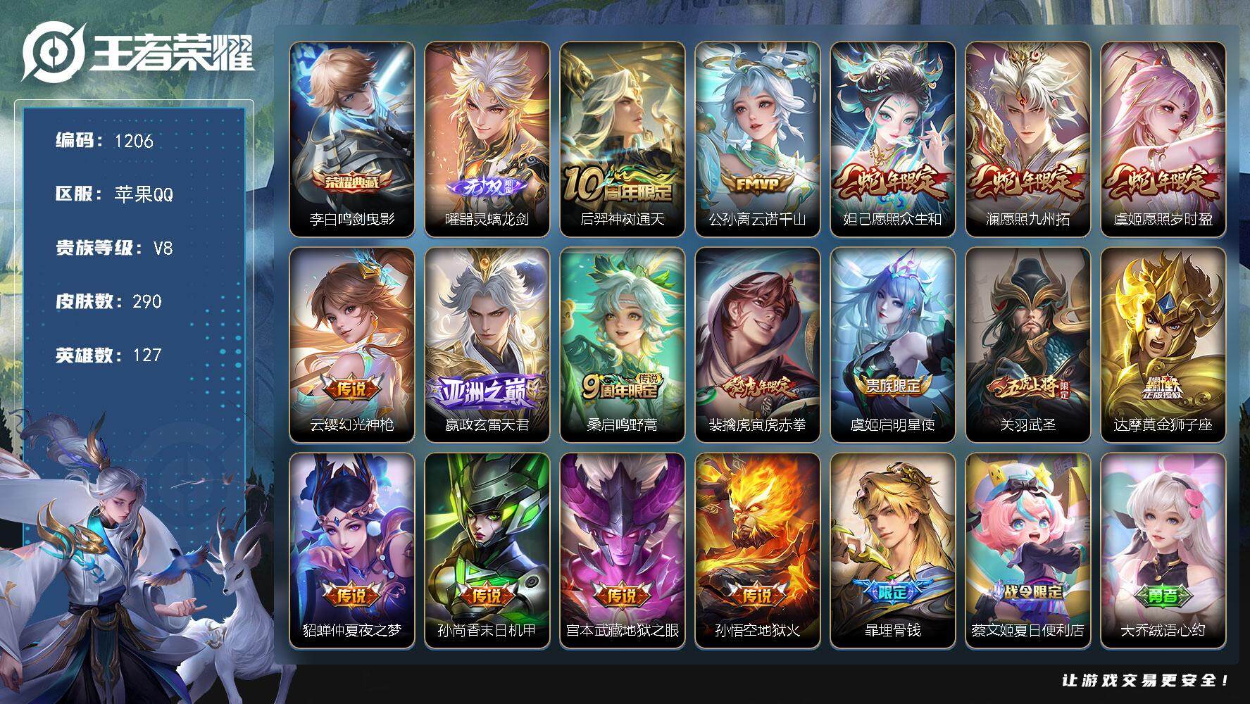 PX_2268409-【290皮1典藏1无双16传说4星传说,鸣剑,螭龙剑,云诺千山,寅虎赤拳】苹果Q-V8-最强王者段位-127英雄-290皮肤-1典藏-0珍品无双-1无双-0珍品传说-16传说-83史诗 【荣耀典藏】:李白鸣剑曳影 【无双皮肤】:曜器灵螭龙剑 【传说皮肤】:后羿神树通天,公孙离云诺千山,妲己愿照众生和,澜愿照九州拓,虞姬愿照岁时盈,云缨幻光神枪,嬴政玄雷天君,桑启鸣野蒿,裴擒虎寅虎赤拳,虞姬启明星使,关羽武圣,达摩黄金狮子座,貂蝉仲夏夜之梦,孙尚香末日机甲,宫本武藏地狱之眼,孙悟空地狱火 【限定皮肤】:暃埋骨钱,蔡文姬夏日便利店,大乔绒语心约,虞姬夏日便利店,姜子牙天穹之誓,李白谪仙醉月,狄仁杰阴阳师,赵云皇家上将,赵云引擎之心,嬴政优雅恋人,鲁班七号乒乒小将,高渐离玩趣恶龙,芈月重明,元歌云间偶戏,元歌无心,夏侯惇朔风刀,曹操烛龙,典韦穷奇,马可波罗山海玄木吟,狄仁杰魔术师,狄仁杰万华元夜,达摩沙漠行僧,项羽海滩派对,老夫子醍醐杖,关羽武圣,程咬金演武夺筹,韩信飞衡,亚瑟潮玩骑士王,孙悟空孙行者,牛魔御旌,李元芳云中旅人,虞姬启明星使,钟馗驱傩正仪,杨玉环遇见飞天,干将莫邪胡桃夹子,蔡文姬繁星吟游,鬼谷子原初探秘者,苏烈千军破阵,百里玄策原初追逐者,弈星混沌棋,梦奇顽趣,公孙离玉兔公主,明世隐疑决卦,裴擒虎李小龙,裴擒虎寅虎赤拳,裴擒虎擒涛扼浪,狂铁御狮,米莱狄御霄,云中君纤云弄巧,盾山御銮,上官婉儿梁祝,嫦娥拒霜思,嫦娥暖冬兔眠,鲁班大师探海日志,桑启海盐诗旅,暃星界游侠,戈娅驭风魔法,阿古朵江河有灵,张良古海寻踪,蒙犽百解令,蒙恬荣光圣徽,鬼谷子天穹祈灯,沈梦溪龙舞盛年,刘邦剑破天穹,程咬金群星魔术团,镜青焰无极,项羽苍威无极,刘备异域游侠,周瑜熔金海岸 【年限皮肤】:裴擒虎寅虎赤拳,韩信飞衡,关羽武圣,马可波罗山海玄木吟 【赛季限定】:芈月重明,夏侯惇朔风刀,曹操烛龙,典韦穷奇,狄仁杰万华元夜,达摩沙漠行僧,老夫子醍醐杖,程咬金演武夺筹,张良古海寻踪,牛魔御旌,李元芳云中旅人,钟馗驱傩正仪,鬼谷子原初探秘者,苏烈千军破阵,百里玄策原初追逐者,弈星混沌棋,梦奇顽趣,明世隐疑决卦,裴擒虎擒涛扼浪,狂铁御狮,米莱狄御霄,盾山御銮,鲁班大师探海日志,桑启海盐诗旅,鬼谷子天穹祈灯,蒙恬荣光圣徽,刘邦剑破天穹,姜子牙天穹之誓 【战令限定】:蔡文姬夏日便利店,虞姬夏日便利店,元歌云间偶戏,亚瑟潮玩骑士王,嫦娥暖冬兔眠,暃星界游侠,戈娅驭风魔法,镜青焰无极,项羽苍威无极 【史诗皮肤】:鲁班七号电玩小子,露娜紫霞仙子,阿轲暗夜猫娘,赵云皇家上将,赵云未来纪元,貂蝉圣诞恋歌,甄姬冰雪圆舞曲,王昭君偶像歌手,狄仁杰魔术师,廉颇地狱岩魂,宫本武藏鬼剑武藏,孙尚香水果甜心,嬴政优雅恋人,嬴政暗夜贵公子,妲己魅力维加斯,墨子金属风暴,吕布圣诞狂欢,曹操幽灵船长,李白千年之狐,吕布末日机甲,张飞乱世虎臣,韩信白龙吟,赵云引擎之心,花木兰水晶猎龙者,刘邦德古拉伯爵,夏侯惇乘风破浪,小乔缤纷独角兽,兰陵王暗隐猎兽者,雅典娜冰冠公主,安琪拉心灵骇客,百里守约特工魅影,铠曙光守护者,李元芳逐浪之夏,程咬金功夫厨神,白起星夜王子,阿轲节奏热浪,杨玉环遇见飞天,孙策猫狗日记,伽罗箭羽风息,狄仁杰鹰眼统帅,上官婉儿梁祝,蔡文姬繁星吟游,韩信飞衡,小乔青蛇,不知火舞魅语,橘右京修罗,百里玄策原初追逐者,裴擒虎李小龙,云中君纤云弄巧,元歌云间偶戏,鲁班七号乒乒小将,杨戬天秀启明,沈梦溪月团寄思,孙悟空孙行者,嫦娥拒霜思,公孙离玉兔公主,元歌无心,梦奇顽趣,暃星界游侠,马可波罗山海玄木吟,戈娅驭风魔法,阿古朵江河有灵,蒙犽百解令,蒙恬荣光圣徽,镜青焰无极,黄忠怒海争锋,蔡文姬夏日便利店,暃埋骨钱,亚连破空之剑,李白谪仙醉月,牛魔星界战将,孙膑茶境仙,白起苍鳞隐世,赵怀真器灵浮梦炉,阿轲化蝶舞,刘禅鸭鸭历险记,狂铁龙之律动,百里守约雪豹霜爪,后羿石田雨龙,周瑜百相守梦,黄忠百相守梦,女娲万灵启世,少司缘巫礼祀神 【其他皮肤】:项羽海滩派对,韩信教廷特使,韩信街头霸王,露娜哥特玫瑰,达摩大发明家,赵云忍炎影,程咬金星际陆战队,白起白色死神,牛魔西部大镖客,扁鹊化身博士,扁鹊救世之瞳,宫本武藏未来纪元,安琪拉玩偶对对碰,孙膑天使之翼,妲己少女阿狸,典韦黄金武士,亚瑟死亡骑士,达摩拳王,花木兰兔女郎,张飞五福同心,甄姬花好人间,宫本武藏万象初新,后羿阿尔法小队,狄仁杰阴阳师,刘备纽约教父,刘备汉昭烈帝,关羽龙腾万里,钟无艳海滩丽影,宫本武藏霸王丸,曹操烛龙,王昭君幻想奇妙夜,芈月重明,老夫子功夫老勺,牛魔制霸全明星,孙尚香沉稳之力,典韦穷奇,诸葛亮掌控之力,李白敏锐之力,鬼谷子幻乐之宴,狂铁御狮,苏烈坚韧之力,大乔守护之力,米莱狄御霄,明世隐虹云星官,张良幽兰居士,牛魔御旌,小乔丁香结,盾山御銮,孙膑归虚梦演,高渐离玩趣恶龙,沈梦溪鲨炮海盗猫,姜子牙炽热元素使,夏侯惇朔风刀,弈星混沌棋,哪吒次元突破,明世隐疑决卦,盾山圆桌骑士,老夫子醍醐杖,狂铁特工战影,鬼谷子原初探秘者,狄仁杰万华元夜,亚瑟潮玩骑士王,刘禅秘密基地,杨戬次元傲视,露娜瓷语鉴心,程咬金演武夺筹,张良缤纷绘卷,钟馗驱傩正仪,鲁班大师乓乓大师,苏烈千军破阵,典韦铁甲之心,干将莫邪胡桃夹子,达摩沙漠行僧,程咬金无双福将,刘禅唤灵魔甲,蒙犽胡桃狂想