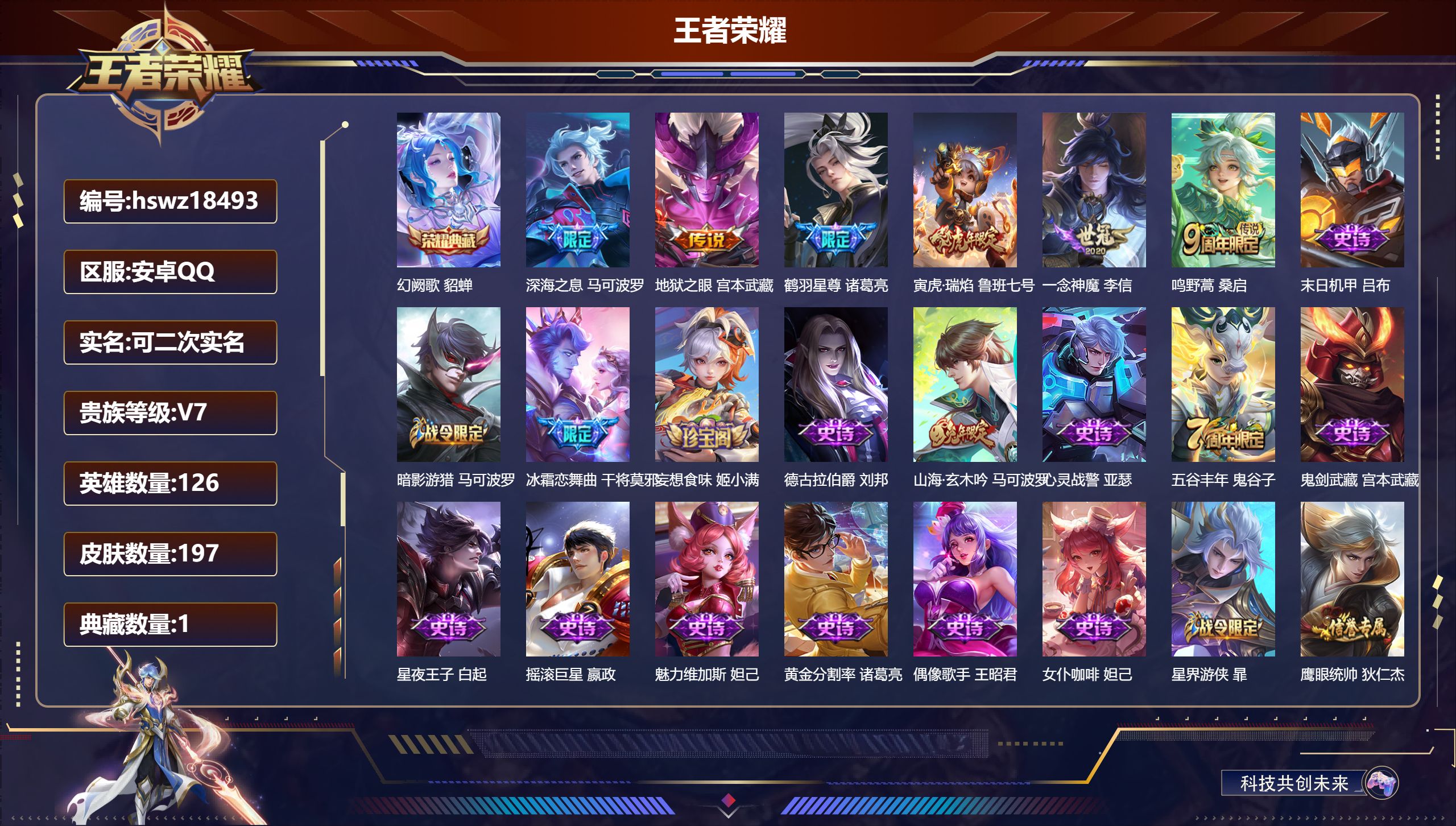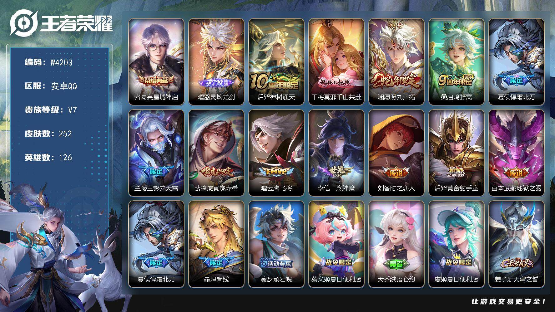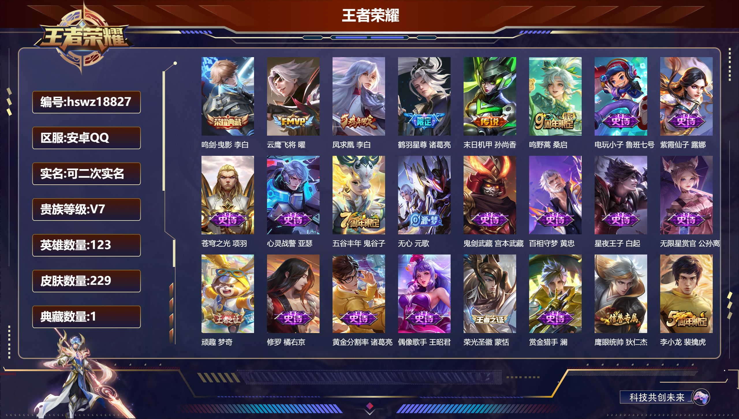 PX_2306722-Q/非凡王者/229皮肤/123英雄/1典藏/0珍品无双/0无双/0珍品传说/5传说/54史诗/7稀有英雄 【1,典藏皮肤】鸣剑·曳影,李白, 【5,传说皮肤】云鹰飞将,曜,凤求凰,李白,鹤羽星尊,诸葛亮,末日机甲,孙尚香,鸣野蒿,桑启, 【54,史诗皮肤】电玩小子,鲁班七号,紫霞仙子,露娜,苍穹之光,项羽,心灵战警,亚瑟,五谷丰年,鬼谷子,无心,元歌,鬼剑武藏,宫本武藏,百相守梦,黄忠,星夜王子,白起,无限星赏官,公孙离,顽趣,梦奇,修罗,橘右京,黄金分割率,诸葛亮,偶像歌手,王昭君,荣光圣徽,蒙恬,赏金猎手,澜,鹰眼统帅,狄仁杰,李小龙,裴擒虎,驯魔猎人,兰陵王,龙骑士,墨子,金属风暴,墨子,特工魅影,百里守约,原初追逐者,百里玄策,逐浪之夏,李元芳,未来纪元,赵云,朱雀志,百里守约,黎明之约,雅典娜,魔术师,狄仁杰,埋骨钱,暃,神威,马超,皇家上将,赵云,至尊宝,孙悟空,功夫厨神,程咬金,梁祝,上官婉儿,电玩·爆裂旋风,刘禅,圣诞恋歌,貂蝉,云间偶戏,元歌,水晶猎龙者,花木兰,涂山容容,公孙离,破空之剑,亚连,怒海争锋,黄忠,夏日便利店,蔡文姬,星界战将,牛魔,地狱岩魂,廉颇,冰雪圆舞曲,甄姬,默契交锋,花木兰,暗夜猫娘,阿轲,织梦人,西施,万物之道,弈星,绅士熊喵,刘禅,时之恋人,孙尚香,水果甜心,孙尚香,幽灵船长,曹操,乘风破浪,夏侯惇, 【103,勇者皮肤】胡桃夹子,干将莫邪,圆桌骑士,盾山,爱心护理,阿轲,太极少年,赵怀真,沙漠行僧,达摩,大漠名商,沈梦溪,缤纷绘卷,张良,大发明家,达摩,功夫炙烤,廉颇,沉稳之力,孙尚香,爱与正义,程咬金,海盐诗旅,桑启,朔风刀,夏侯惇,醍醐杖,老夫子,归虚梦演,孙膑,汉昭烈帝,刘备,白色死神,白起,黄金武士,典韦,御旌,牛魔,阴阳师,狄仁杰,致命风华,阿轲,次元突破,哪吒,古海寻踪,张良,功夫老勺,老夫子,鲨炮海盗猫,沈梦溪,鲤鱼之梦,庄周,海滩派对,项羽,完美运算,后羿,万华元夜,狄仁杰,克喵,鬼谷子,踏浪烽翎,莱西奥,演武夺筹,程咬金,红桃皇后,芈月,野性能量,吕布,哥特玫瑰,露娜,守护之力,大乔,无双福将,程咬金,原初探秘者,鬼谷子,星空之诺,沈梦溪,潮玩探月行,猪八戒,天穹祈灯,鬼谷子,疑决卦,明世隐,化身博士,扁鹊,潮玩骑士王,亚瑟,金色潮汐,朵莉亚,幻乐之宴,鬼谷子,霸王丸,宫本武藏,虹云星官,明世隐,救世之瞳,扁鹊,赤莲之焰,周瑜,死亡骑士,亚瑟,敏锐之力,李白,破局者,亚连,玩偶对对碰,安琪拉,掌控之力,诸葛亮,海滩丽影,钟无艳,忍·炎影,赵云,坚韧之力,苏烈,擒涛扼浪,裴擒虎,乓乓大师,鲁班大师,探海日志,鲁班大师,兔女郎,花木兰,龙腾万里,关羽,金庭之子,兰陵王,未来纪元,宫本武藏,千军破阵,苏烈,零食大作战,姬小满,荣光之誓,亚瑟,花好人间,甄姬,万象初新,宫本武藏,御銮,盾山,时尚教父,姜子牙,秘密基地,刘禅,教廷特使,韩信,街头霸王,韩信,云中旅人,李元芳,妄想特派,李元芳,西部大镖客,孙悟空,少女阿狸,妲己,混沌棋,弈星,御霄,米莱狄,命运加冕,露娜,幻想奇妙夜,王昭君,驱傩正仪,钟馗,命运角斗场,狂铁,死霸装,白起,特工战影,狂铁,虚灵犬护,钟馗,御狮,狂铁,神迹守卫,孙悟空,剑破天穹,刘邦,熔金海岸,周瑜,天穹之誓,姜子牙,星梦巡礼,姜子牙,破阵·退雄兵,杨戬,谧流熔炉,太乙真人,群星魔术团,程咬金,经纬探寻者,盘古,暗都幽影,大司命,夏日便利店,虞姬,鹤鸣心笺,艾琳,噬灭天穹,东皇太一,敬我三分,盘古, 【67,其他皮肤】伊势巫女,大乔,金属狂潮,高渐离,前尘,金蝉,战争骑士,夏侯惇,圣殿之光,刘邦,潮流仙人,老夫子,三太子,哪吒,棒球奇才,沈梦溪,极冰防御线,盾山,龙域领主,铠,生化警戒,钟无艳,死神来了,曹操,超能战警,曹操,花见巫女,伽罗,爱与和平,苏烈,未来旅行,孙膑,第七人偶,干将莫邪,万圣前夜,小乔,灼热之刃,李信,海之征途,孙策,木偶奇遇记,鲁班七号,福禄兄弟,鲁班七号,精灵王,后羿,冰刃幻境,镜,碧珀绯影,暃,海军大将,周瑜,星航指挥官,诸葛亮,魇语军师,司马懿,午夜歌剧院,元歌,启蛰,司空震,隐刃,兰陵王,花间舞,公孙离,异域舞娘,貂蝉,街头旋风,裴擒虎,东海龙王,东皇太一,修竹墨客,上官婉儿,范海辛,李白,占星师,明世隐,激情绿茵,马可波罗,埃及法老,杨戬,归虚梦演,西施,年年有余,猪八戒,天堂福音,张良,尼罗河女神,女娲,锦衣卫,狄仁杰,一千零一夜,张良,归虚梦演,曜,威尼斯狂欢,百里玄策,幸存者,马超,战争女神,雅典娜,荷鲁斯之眼,云中君,创世神祝,盘古,特种部队,李元芳,绝影神枪,百里守约,蔷薇王座,蔡文姬,森,瑶,孤猎,澜,加勒比小姐,虞姬,踏雪寻梅,弈星,秩序猎龙将,蒙恬,精准探案法,米莱狄,精灵公主,王昭君,赤焰之缨,云缨,露花倒影,嫦娥,地府判官,钟馗,美梦成真,梦奇,西部大镖客,孙悟空, 【7,稀有英雄】不知火舞,橘右京,夏洛特,娜可露露,韩信,艾琳,赵云, 营地ID:,