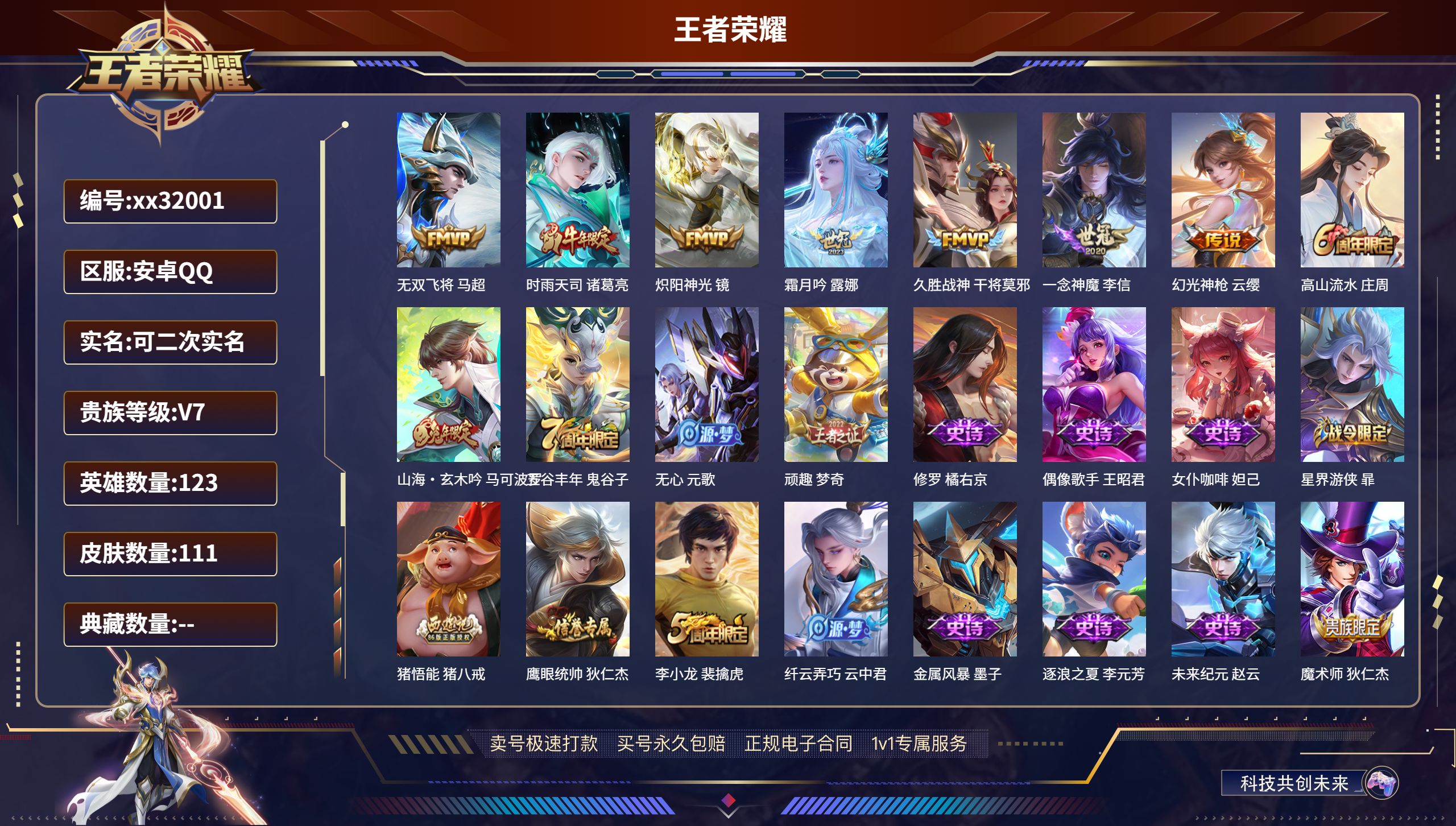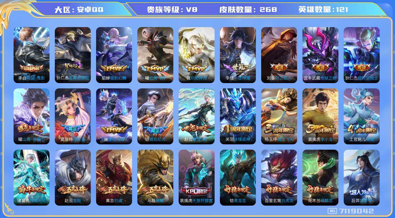 PX_1998273-@32001,可二次,V7,贵族积分20010,安卓QQ/,111皮肤/,123英雄, 【7,传说皮肤】,无双飞将,马超,时雨天司,诸葛亮,炽阳神光,镜,霜月吟,露娜,久胜战神,干将莫邪,一念神魔,李信,幻光神枪,云缨, 【27,史诗皮肤】,高山流水,庄周,山海·玄木吟,马可波罗,五谷丰年,鬼谷子,无心,元歌,顽趣,梦奇,修罗,橘右京,偶像歌手,王昭君,女仆咖啡,妲己,星界游侠,暃,猪悟能,猪八戒,鹰眼统帅,狄仁杰,李小龙,裴擒虎,纤云弄巧,云中君,金属风暴,墨子,逐浪之夏,李元芳,未来纪元,赵云,魔术师,狄仁杰,皇家上将,赵云,功夫厨神,程咬金,圣诞恋歌,貂蝉,水晶猎龙者,花木兰,圣诞狂欢,吕布,千年之狐,李白,绅士熊喵,刘禅,时之恋人,孙尚香,水果甜心,孙尚香,暗隐猎兽者,兰陵王, 【54,勇者皮肤】,沙漠行僧,达摩,大漠名商,沈梦溪,缤纷绘卷,张良,纽约教父,刘备,大发明家,达摩,乐园追猎者,白起,功夫炙烤,廉颇,沉稳之力,孙尚香,海盐诗旅,桑启,幻泉雾影,海月,醍醐杖,老夫子,黄金武士,典韦,阴阳师,狄仁杰,古海寻踪,张良,海滩派对,项羽,万华元夜,狄仁杰,演武夺筹,程咬金,哥特玫瑰,露娜,守护之力,大乔,原初探秘者,鬼谷子,天穹祈灯,鬼谷子,化身博士,扁鹊,五福同心,张飞,幻乐之宴,鬼谷子,虹云星官,明世隐,救世之瞳,扁鹊,死亡骑士,亚瑟,危途狂花,戈娅,海滩丽影,钟无艳,忍·炎影,赵云,雪境奇遇,西施,万事如意,刘备,逐霄战戟,吕布,擒涛扼浪,裴擒虎,乓乓大师,鲁班大师,探海日志,鲁班大师,玩趣恶龙,高渐离,龙腾万里,关羽,金庭之子,兰陵王,未来纪元,宫本武藏,千军破阵,苏烈,万象初新,宫本武藏,秘密基地,刘禅,教廷特使,韩信,街头霸王,韩信,云中旅人,李元芳,少女阿狸,妲己,暖冬·兔眠,嫦娥,驱傩正仪,钟馗,特工战影,狂铁,铁骨偃魂,典韦,苍林狼骑,苍,谧流熔炉,太乙真人,噬灭天穹,东皇太一, 【23,其他皮肤】,伊势巫女,大乔,战争骑士,夏侯惇,花见巫女,伽罗,灼热之刃,李信,福禄兄弟,鲁班七号,精灵王,后羿,碧珀绯影,暃,海军大将,周瑜,午夜歌剧院,元歌,启蛰,司空震,花间舞,公孙离,街头旋风,裴擒虎,维京掠夺者,苍,激情绿茵,马可波罗,一千零一夜,张良,归虚梦演,曜,幸存者,马超,特种部队,李元芳,绝影神枪,百里守约,森,瑶,孤猎,澜,美梦成真,梦奇,天启骑士,关羽, 【8,稀有英雄】,敖隐,不知火舞,橘右京,夏洛特,娜可露露,韩信,艾琳,赵云, 营地ID:,