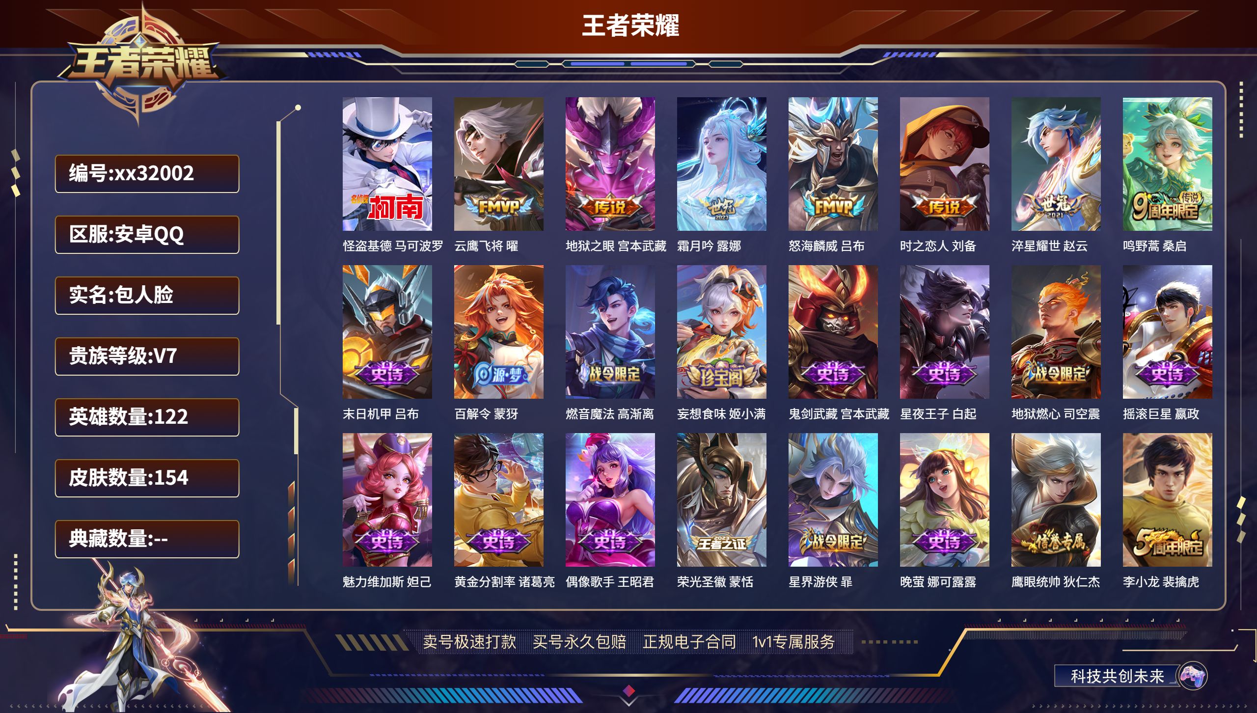 PX_2000265-实名:,可修改,贵族等级:,V8,英雄数:,121,皮肤数:,268,荣耀水晶:,鸣剑·曳影,星传说:,星际治安官,传说皮:,云鹰飞将,猫影幻舞,炽阳神光,一念神魔,地狱之眼,时之恋人-刘备,超时空战士-狄仁杰,山海·苍雷引,浮生妄,澜逐花归海,琥珀纪元铠,乘龙·铭钟鼎,限定皮:,冰锋战神,遇见飞天,李小龙,梁祝,时雨天司,龙胆,烈魂,神威,天狼狩猎者,白虎志,青龙志,瑞麟志,如梦令-嫦娥,至尊宝,如梦令-后羿,高山流水,寅虎·赤拳,寅虎·心曲,玉兔公主,五谷丰年,绯月行,诗剑行