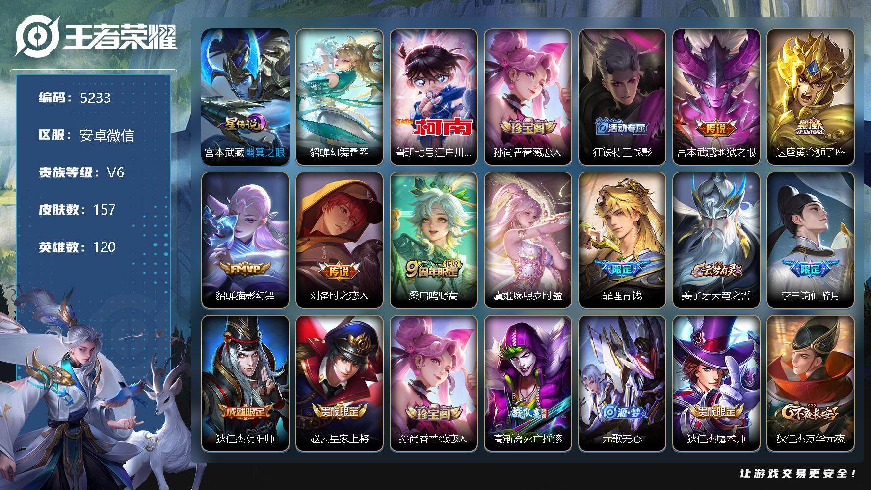PX_1945151-可二次【打野38段:金标盘古,4银标战力,蛇年虞姬】2星元:幽冥之眼,貂蝉幻舞叠翠,5按键,11王者印记】【保证金商家·终身售后·找回包赔】【因赛季更新游戏段以上号为准!】 【商品标题】:安卓WX-V6-120英雄-157皮肤-0典藏-0无双-1珍品传说-6传说-46史诗-70铭文 【珍品传说】:鲁班七号江户川柯南 【内测皮肤】:孙尚香蔷薇恋人,狂铁特工战影 【传说皮肤】:宫本武藏地狱之眼,达摩黄金狮子座,貂蝉猫影幻舞,刘备时之恋人,桑启鸣野蒿,虞姬愿照岁时盈 【限定皮肤】:暃埋骨钱,姜子牙天穹之誓,李白谪仙醉月,狄仁杰阴阳师,赵云皇家上将,孙尚香蔷薇恋人,高渐离死亡摇滚,元歌无心,狄仁杰魔术师,狄仁杰万华元夜,达摩沙漠行僧,项羽海滩派对,王昭君午后时光,兰陵王金庭之子,亚瑟潮玩骑士王,李元芳云中旅人,雅典娜黎明之约,鬼谷子五谷丰年,苏烈千军破阵,百里玄策原初追逐者,梦奇顽趣,沈梦溪大漠名商,裴擒虎天狼狩猎者,裴擒虎擒涛扼浪,狂铁电玩高手,嫦娥拒霜思,嫦娥暖冬兔眠,鲁班大师探海日志,桑启海盐诗旅,暃星界游侠,张良古海寻踪,蒙恬荣光圣徽,鬼谷子天穹祈灯,刘邦剑破天穹,周瑜熔金海岸 【赛季限定】:狄仁杰万华元夜,达摩沙漠行僧,兰陵王金庭之子,张良古海寻踪,李元芳云中旅人,雅典娜黎明之约,苏烈千军破阵,百里玄策原初追逐者,梦奇顽趣,沈梦溪大漠名商,裴擒虎擒涛扼浪,鲁班大师探海日志,桑启海盐诗旅,鬼谷子天穹祈灯,蒙恬荣光圣徽,刘邦剑破天穹,姜子牙天穹之誓 【战令限定】:王昭君午后时光,亚瑟潮玩骑士王,狂铁电玩高手,嫦娥暖冬兔眠,暃星界游侠 【史诗皮肤】:鲁班七号电玩小子,赵云皇家上将,赵云未来纪元,甄姬冰雪圆舞曲,狄仁杰魔术师,廉颇地狱岩魂,宫本武藏鬼剑武藏,孙尚香蔷薇恋人,妲己魅力维加斯,墨子金属风暴,刘禅绅士熊喵,曹操幽灵船长,张飞乱世虎臣,花木兰水晶猎龙者,夏侯惇乘风破浪,兰陵王暗隐猎兽者,诸葛亮黄金分割率,亚瑟心灵战警,安琪拉心灵骇客,百里守约特工魅影,铠曙光守护者,李元芳逐浪之夏,白起星夜王子,大乔猫狗日记,裴擒虎天狼狩猎者,狄仁杰鹰眼统帅,娜可露露晚萤,百里玄策原初追逐者,司马懿暗渊魔法,嫦娥拒霜思,雅典娜黎明之约,狂铁电玩高手,鬼谷子五谷丰年,元歌无心,梦奇顽趣,暃星界游侠,莱西奥末日机甲,蒙恬荣光圣徽,暃埋骨钱,亚连破空之剑,马可波罗星界特工