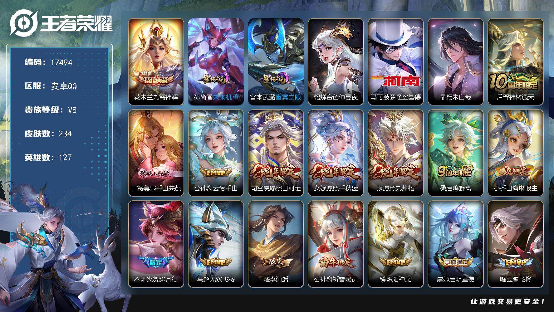 PX_2304943-可换绑【花木兰典藏,双珍品怪盗基德,李逍遥,祈雪灵祝,多传说限定号】,3星传说,10按键,13王者印记,满级铭文,可二次BX2164,安卓Q-V8-234皮肤-1典藏皮肤-2珍品传说-23传说-79史诗【英雄全皮】:蒙恬全皮,司空震全皮【荣耀典藏】:花木兰九霄神辉【珍品传说】:马可波罗怪盗基德,暃朽木白哉【星元皮肤】:孙尚香未来机甲,宫本武藏幽冥之眼,貂蝉金色仲夏夜【传说皮肤】:后羿神树通天,干将莫邪千山共赴,公孙离云诺千山,司空震愿照山河定,女娲愿照千秋盛,澜愿照九州拓,桑启鸣野蒿,小乔山海琳琅生,不知火舞绯月行,马超无双飞将,曜李逍遥,,公孙离祈雪灵祝,镜炽阳神光,虞姬启明星使,曜云鹰飞将,李信一念神魔,伽罗太华,干将莫邪久胜战神,虞姬云霓雀翎,达摩黄金狮子座,貂蝉仲夏夜之梦,孙尚香末日机甲,宫本武藏地狱之眼【限定皮肤】:蒙犽顽岩魄,姜子牙天穹之誓,狄仁杰阴阳师,小乔山海琳琅生,赵云皇家上将,庄周高山流水,高渐离玩趣恶龙,元歌云间偶戏,元歌无心,甄姬游园惊梦,马可波罗逐梦之星,马可波罗暗影游猎,马可波罗山海玄木吟,狄仁杰魔术师,狄仁杰万华元夜,达摩沙漠行僧,项羽海滩派对,关羽冰锋战神,程咬金演武夺筹,兰陵王金庭之子,花木兰默契交锋,不知火舞绯月行,亚瑟潮玩骑士王,后羿圣弓游侠,李元芳云中旅人,虞姬启明星使,钟馗驱傩正仪,女娲朔望之晖,干将莫邪冰霜恋舞曲,干将莫邪真爱魔法,雅典娜黎明之约,鬼谷子五谷丰年,苏烈千军破阵,百里玄策原初追逐者,梦奇顽趣,公孙离祈雪灵祝,沈梦溪大漠名商,裴擒虎擒涛扼浪,伽罗太华,上官婉儿天狼绘梦者,嫦娥暖冬兔眠,曜李逍遥,,西施至美乘鲤谣,鲁班大师探海日志,桑启海盐诗旅,暃星界游侠,艾琳流音漫舞,司空震地狱燃心,阿古朵江河有灵,张良古海寻踪,蒙恬荣光圣徽,鬼谷子天穹祈灯,姬小满妄想食味,沈梦溪龙舞盛年,鲁班七号蔬乡物语,李元芳蔬乡物语,刘邦剑破天穹,上官婉儿群星魔术团,程咬金群星魔术团,镜青焰无极,项羽苍威无极【年限皮肤】:公孙离祈雪灵祝,伽罗太华,马超神威,马可波罗山海玄木吟,小乔山海琳琅生【赛季限定】:狄仁杰万华元夜,达摩沙漠行僧,程咬金演武夺筹,兰陵王金庭之子,张良古海寻踪,李元芳云中旅人,钟馗驱傩正仪,雅典娜黎明之约,苏烈千军破阵,百里玄策原初追逐者,梦奇顽趣,沈梦溪大漠名商,裴擒虎擒涛扼浪,鲁班大师探海日志,桑启海盐诗旅,鬼谷子天穹祈灯,蒙恬荣光圣徽,刘邦剑破天穹,姜子牙天穹之誓 【战令限定】:元歌云间偶戏,马可波罗暗影游猎,艾琳流音漫舞,亚瑟潮玩骑士王,后羿圣弓游侠,女娲朔望之晖,干将莫邪真爱魔法,嫦娥暖冬兔眠,司空震地狱燃心,暃星界游侠,鲁班七号蔬乡物语,李元芳蔬乡物语,镜青焰无极,项羽苍威无极 【史诗皮肤】:项羽苍穹之光,露娜紫霞仙子,阿轲暗夜猫娘,赵云皇家上将,貂蝉圣诞恋歌,甄姬冰雪圆舞曲,王昭君偶像歌手,狄仁杰魔术师,廉颇地狱岩魂,宫本武藏鬼剑武藏,孙尚香水果甜心,妲己魅力维加斯,妲己女仆咖啡,墨子金属风暴,吕布圣诞狂欢,刘禅绅士熊喵,曹操幽灵船长,吕布末日机甲,张飞乱世虎臣,关羽冰锋战神,花木兰水晶猎龙者,刘邦德古拉伯爵,甄姬游园惊梦,马可波罗逐梦之星,亚瑟心灵战警,雅典娜冰冠公主,安琪拉心灵骇客,百里守约特工魅影,铠曙光守护者,蔡文姬舞动绿茵,李元芳逐浪之夏,白起星夜王子,阿轲节奏热浪,孙策猫狗日记,大乔猫狗日记,干将莫邪冰霜恋舞曲,伽罗箭羽风息,狄仁杰鹰眼统帅,娜可露露晚萤,不知火舞魅语,橘右京修罗,马超神威,上官婉儿天狼绘梦者,马可波罗暗影游猎,百里玄策原初追逐者,元歌云间偶戏,花木兰默契交锋,百里玄策热力回旋,干将莫邪真爱魔法,庄周高山流水,司马懿暗渊魔法,雅典娜黎明之约,夏洛特永昼,澜赏金猎手,鬼谷子五谷丰年,元歌无心,梦奇顽趣,暃星界游侠,马可波罗山海玄木吟,司空震地狱燃心,阿古朵江河有灵,西施至美乘鲤谣,蒙恬荣光圣徽,姬小满妄想食味,鲁班七号蔬乡物语,上官婉儿群星魔术团,镜青焰无极,蒙犽顽岩魄,亚连破空之剑,弈星炽弈燎原,牛魔星界战将,弈星万物之道,赵怀真器灵浮梦炉,狂铁龙之律动,后羿石田雨龙,周瑜百相守梦,黄忠百相守梦,女娲万灵启世,少司缘巫礼祀神 【其他皮肤】:项羽海滩派对,韩信教廷特使,韩信街头霸王,达摩大发明家,赵云忍炎影,芈月红桃皇后,白起白色死神,牛魔西部大镖客,武则天东方不败,扁鹊救世之瞳,宫本武藏未来纪元,亚瑟死亡骑士,花木兰兔女郎,张飞五福同心,甄姬花好人间,刘备万事如意,宫本武藏万象初新,狄仁杰阴阳师,刘备纽约教父,关羽龙腾万里,钟无艳海滩丽影,王昭君幻想奇妙夜,老夫子功夫老勺,孙尚香沉稳之力,诸葛亮掌控之力,李白敏锐之力,鬼谷子幻乐之宴,苏烈坚韧之力,明世隐虹云星官,女娲朔望之晖,小乔丁香结,吕布野性能量,高渐离玩趣恶龙,沈梦溪鲨炮海盗猫,哪吒次元突破,盾山圆桌骑士,狂铁特工战影,狄仁杰万华元夜,亚瑟潮玩骑士王,刘禅秘密基地,程咬金演武夺筹,钟馗驱傩正仪,鲁班大师乓乓大师,苏烈千军破阵,后羿圣弓游侠,马可波罗潮玩牛仔,达摩沙漠行僧,程咬金无双福将,兰陵王金庭之子,刘禅唤灵魔甲,沈梦溪大漠名商,蒙恬蔚蓝守将,李元芳云中旅人,戈娅危途狂花,桑启海盐诗旅,嫦娥暖冬兔眠,猪八戒潮玩探月行,裴擒虎擒涛扼浪,太乙真人劲辣红锅,鲁班大师探海日志,李元芳妄想特