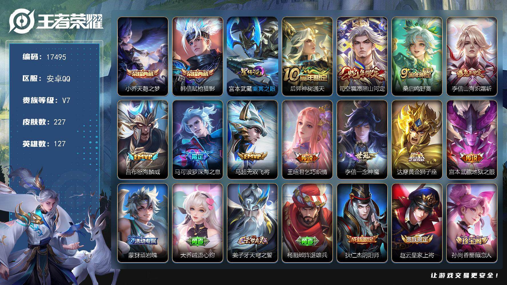 PX_2304978-实名:,可修改,贵族等级:,V4,英雄数:,82,皮肤数:,62,传说皮:,乞巧织情,神树通天,限定皮:,五谷丰年,山海·玄木吟,愿照·千秋盛