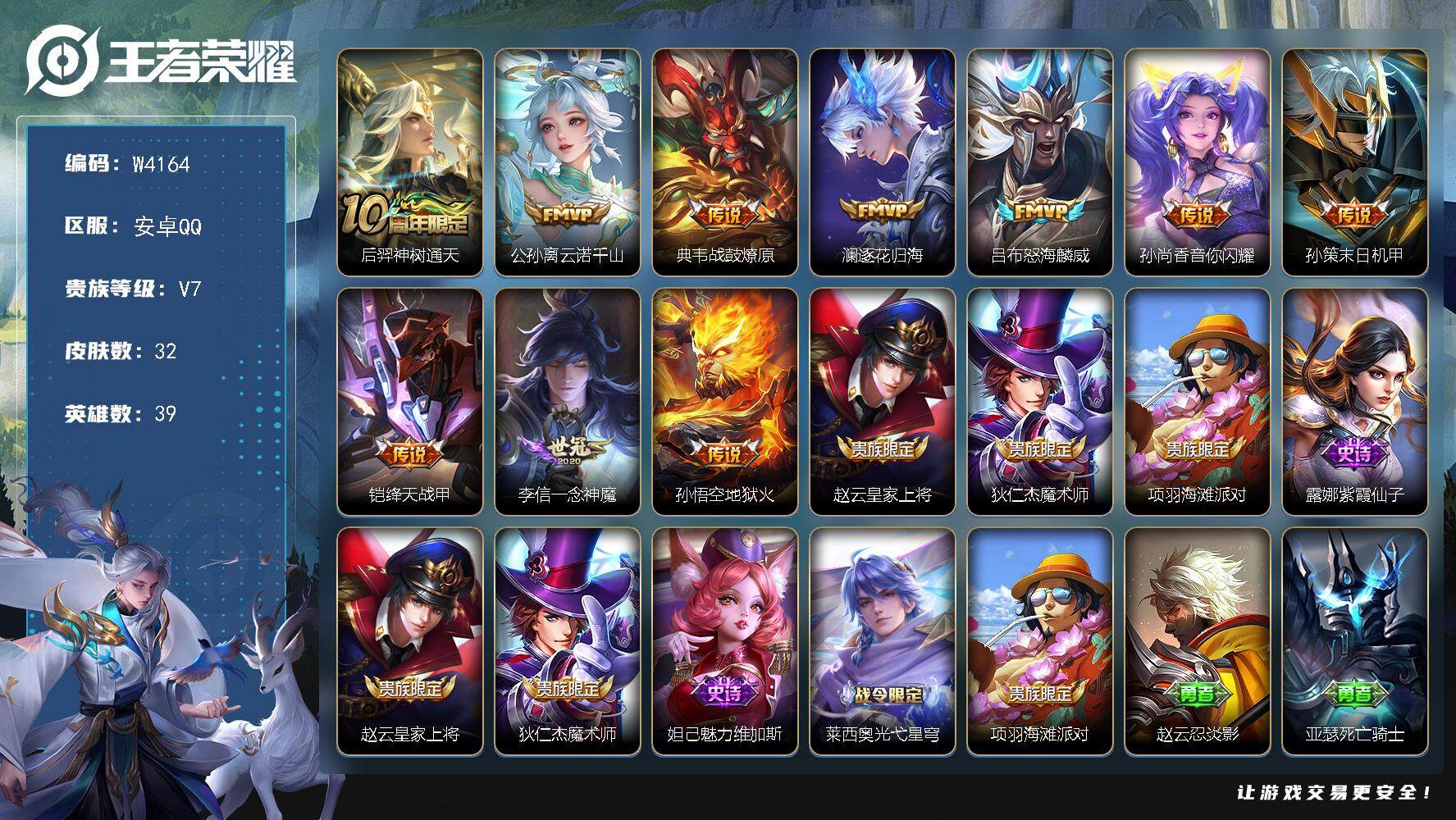 PX_2304894-【W4164】安卓Q区-可二次-贵7-39英雄-32皮肤-10传说-5史诗-7限定-8按键-至尊宝专属播报-逐花归海/地狱火/战鼓燎原/绛天战甲/末日机甲/一念神魔/云诺千山/怒海麟威/神树通天-贵族积分2.7W-营地ID:1560394048