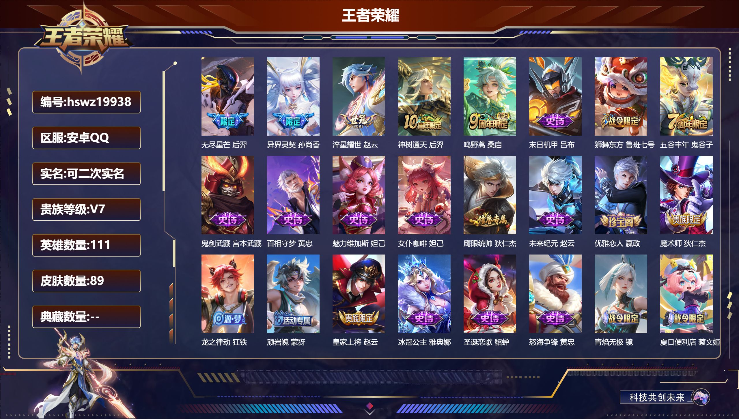 PX_2304884-Q/永恒钻石/89皮肤/111英雄/0典藏/0珍品无双/0无双/0珍品传说/5传说/24史诗/7稀有英雄 【5,传说皮肤】无尽星芒,后羿,异界灵契,孙尚香,淬星耀世,赵云,神树通天,后羿,鸣野蒿,桑启, 【24,史诗皮肤】末日机甲,吕布,狮舞东方,鲁班七号,五谷丰年,鬼谷子,鬼剑武藏,宫本武藏,百相守梦,黄忠,魅力维加斯,妲己,女仆咖啡,妲己,鹰眼统帅,狄仁杰,未来纪元,赵云,优雅恋人,嬴政,魔术师,狄仁杰,龙之律动,狂铁,顽岩魄,蒙犽,皇家上将,赵云,冰冠公主,雅典娜,圣诞恋歌,貂蝉,怒海争锋,黄忠,青焰无极,镜,夏日便利店,蔡文姬,地狱岩魂,廉颇,乱世虎臣,张飞,缤纷独角兽,小乔,魔法小厨娘,安琪拉,水果甜心,孙尚香, 【51,勇者皮肤】时空谍影,海诺,爱心护理,阿轲,龙舞盛年,沈梦溪,丁香结,小乔,幻泉雾影,海月,汉昭烈帝,刘备,白色死神,白起,黄金武士,典韦,阴阳师,狄仁杰,径山谋武,孙权,海滩派对,项羽,克喵,鬼谷子,踏浪烽翎,莱西奥,阿尔法小队,后羿,死亡骑士,亚瑟,敏锐之力,李白,幽兰居士,张良,玩偶对对碰,安琪拉,乓乓大师,鲁班大师,天使之翼,孙膑,兔女郎,花木兰,未来纪元,宫本武藏,罗小黑战记,哪吒,荣光之誓,亚瑟,花好人间,甄姬,教廷特使,韩信,黑猫爱糖果,李元芳,街头霸王,韩信,少女阿狸,妲己,蔚蓝守将,蒙恬,契约魔法,米莱狄,绒语心约,大乔,幻想奇妙夜,王昭君,命运角斗场,狂铁,罗小黑战记,张良,剑破天穹,刘邦,异域游侠,刘备,苍威无极,项羽,熔金海岸,周瑜,天穹之誓,姜子牙,破阵·退雄兵,杨戬,谧流熔炉,太乙真人,群星魔术团,程咬金,暗都幽影,大司命,夏日便利店,虞姬,鹤鸣心笺,艾琳,云械蓝图,云中君,逆浪荇歌,甄姬,噬灭天穹,东皇太一,敬我三分,盘古,怪诞之夜,米莱狄, 【9,其他皮肤】潮流仙人,老夫子,第七人偶,干将莫邪,海军大将,周瑜,年年有余,猪八戒,一千零一夜,张良,绝影神枪,百里守约,精准探案法,米莱狄,地府判官,钟馗,天启骑士,关羽, 【7,稀有英雄】嬴政,不知火舞,橘右京,夏洛特,韩信,艾琳,赵云, 营地ID:,