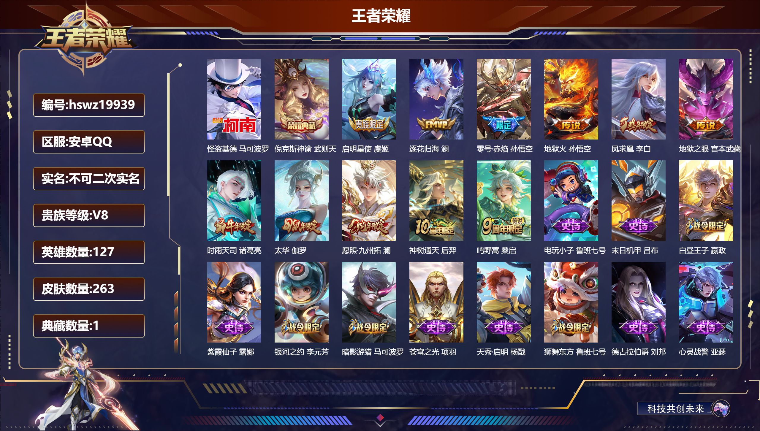 PX_2304888-Q/非凡王者/263皮肤/127英雄/1典藏/0珍品无双/0无双/1珍品传说/11传说/69史诗/9稀有英雄 【1,珍品传说】怪盗基德,马可波罗, 【1,典藏皮肤】倪克斯神谕,武则天, 【11,传说皮肤】启明星使,虞姬,逐花归海,澜,零号·赤焰,孙悟空,地狱火,孙悟空,凤求凰,李白,地狱之眼,宫本武藏,时雨天司,诸葛亮,太华,伽罗,愿照·九州拓,澜,神树通天,后羿,鸣野蒿,桑启, 【69,史诗皮肤】电玩小子,鲁班七号,末日机甲,吕布,白昼王子,嬴政,紫霞仙子,露娜,银河之约,李元芳,暗影游猎,马可波罗,苍穹之光,项羽,天秀·启明,杨戬,狮舞东方,鲁班七号,德古拉伯爵,刘邦,心灵战警,亚瑟,鬼剑武藏,宫本武藏,百相守梦,黄忠,迷踪丽影,阿轲,遇见飞天,杨玉环,摇滚巨星,嬴政,魅力维加斯,妲己,偶像歌手,王昭君,女仆咖啡,妲己,晚萤,娜可露露,舞动绿茵,蔡文姬,鹰眼统帅,狄仁杰,胡桃异想国,米莱狄,大圣娶亲,孙悟空,李小龙,裴擒虎,光弋星穹,莱西奥,纤云弄巧,云中君,金属风暴,墨子,特工魅影,百里守约,原初追逐者,百里玄策,未来纪元,赵云,优雅恋人,嬴政,鸭鸭历险记,刘禅,魔术师,狄仁杰,龙之律动,狂铁,皇家上将,赵云,冰冠公主,雅典娜,至尊宝,孙悟空,功夫厨神,程咬金,梁祝,上官婉儿,圣诞恋歌,貂蝉,云间偶戏,元歌,水晶猎龙者,花木兰,涂山容容,公孙离,破空之剑,亚连,烈魂,黄忠,魅语,不知火舞,器灵·浮梦炉,赵怀真,白龙吟,韩信,圣诞老人,老夫子,地狱岩魂,廉颇,月团寄思,沈梦溪,千年之狐,李白,节奏热浪,阿轲,游园惊梦,甄姬,曙光守护者,铠,万灵启世,女娲,心灵骇客,安琪拉,乱世虎臣,张飞,龙胆,赵云,蓝屏警告,典韦,时之恋人,孙尚香,水果甜心,孙尚香,狂想玩偶喵,蒙犽,化蝶舞,阿轲,狼魂孤将,苍,幽灵船长,曹操,乘风破浪,夏侯惇,暗隐猎兽者,兰陵王, 【119,勇者皮肤】圆桌骑士,盾山,烛龙,曹操,爱心护理,阿轲,星际陆战队,达摩,缤纷绘卷,张良,纽约教父,刘备,大发明家,达摩,龙舞盛年,沈梦溪,丁香结,小乔,功夫炙烤,廉颇,朔风刀,夏侯惇,醍醐杖,老夫子,朔望之晖,女娲,汉昭烈帝,刘备,白色死神,白起,黄金武士,典韦,夺宝奇兵,刘邦,御旌,牛魔,阴阳师,狄仁杰,炼金王,扁鹊,致命风华,阿轲,次元突破,哪吒,科学大爆炸,项羽,功夫老勺,老夫子,鲨炮海盗猫,沈梦溪,海滩派对,项羽,万华元夜,狄仁杰,踏浪烽翎,莱西奥,演武夺筹,程咬金,红桃皇后,芈月,奇妙博物学,庄周,蜃楼王,庄周,猎兽之王,吕布,野性能量,吕布,哥特玫瑰,露娜,守护之力,大乔,无双福将,程咬金,瓷语鉴心,露娜,原初探秘者,鬼谷子,星空之诺,沈梦溪,潮玩探月行,猪八戒,西部大镖客,猪八戒,疑决卦,明世隐,如懿,安琪拉,化身博士,扁鹊,潮玩骑士王,亚瑟,阿尔法小队,后羿,狮心王,亚瑟,次元傲视,杨戬,星际陆战队,程咬金,幻乐之宴,鬼谷子,霸王丸,宫本武藏,虹云星官,明世隐,死亡骑士,亚瑟,浪漫序章,刘备,敏锐之力,李白,玩偶对对碰,安琪拉,掌控之力,诸葛亮,海滩丽影,钟无艳,忍·炎影,赵云,狰,白起,重明,芈月,炽热元素使,姜子牙,坚韧之力,苏烈,万事如意,刘备,乓乓大师,鲁班大师,妖精王,孙膑,天使之翼,孙膑,雾都夜雨,干将莫邪,玩趣恶龙,高渐离,兔女郎,花木兰,龙腾万里,关羽,未来纪元,宫本武藏,罗小黑战记,哪吒,往忆晖光,明世隐,荣光之誓,亚瑟,花好人间,甄姬,万象初新,宫本武藏,御銮,盾山,单词大作战,雅典娜,秘密基地,刘禅,穷奇,典韦,教廷特使,韩信,街头霸王,韩信,西部大镖客,孙悟空,凯尔特女王,虞姬,进击墨子号,墨子,蔬乡物语,李元芳,少女阿狸,妲己,混沌棋,弈星,御霄,米莱狄,布丁狗之约,阿古朵,命运加冕,露娜,小满鸭,姬小满,幻想奇妙夜,王昭君,驱傩正仪,钟馗,神迹守卫,钟馗,鸭鸭历险记,沈梦溪,死霸装,白起,虚灵犬护,钟馗,御狮,狂铁,白执事,赵云,饕餮,太乙真人,劲辣红锅,太乙真人,神迹守卫,孙悟空,剑破天穹,刘邦,铁骨偃魂,典韦,熔金海岸,周瑜,苍林狼骑,苍,天穹之誓,姜子牙,星梦巡礼,姜子牙,谧流熔炉,太乙真人,暗都幽影,大司命,鹤鸣心笺,艾琳,锦麟游梦,庄周,逆浪荇歌,甄姬,噬灭天穹,东皇太一,玫蓝誓约,戈娅,景韶洛都,明世隐, 【62,其他皮肤】伊势巫女,大乔,金属狂潮,高渐离,前尘,金蝉,战争骑士,夏侯惇,圣殿之光,刘邦,芝加哥教父,黄忠,潮流仙人,老夫子,三太子,哪吒,棒球奇才,沈梦溪,龙域领主,铠,生化警戒,钟无艳,死神来了,曹操,花见巫女,伽罗,未来旅行,孙膑,第七人偶,干将莫邪,灼热之刃,李信,海之征途,孙策,木偶奇遇记,鲁班七号,精灵王,后羿,绯红之刃,露娜,冰刃幻境,镜,碧珀绯影,暃,星航指挥官,诸葛亮,魇语军师,司马懿,英喵野望,刘禅,午夜歌剧院,元歌,启蛰,司空震,隐刃,兰陵王,花间舞,公孙离,异域舞娘,貂蝉,街头旋风,裴擒虎,东海龙王,东皇太一,剑舞者,花木兰,范海辛,李白,维京掠夺者,苍,归虚梦演,蒙犽,激情绿茵,马可波罗,埃及法老,杨戬,归虚梦演,西施,画中游,桑启,年年有余,猪八戒,锦衣卫,狄仁杰,一千零一夜,张良,归虚梦演,曜,威尼斯狂欢,百里玄策,幸存者,马超,战争女神,雅典娜,荷鲁斯之眼,云中君,创世神祝,盘古,特种部队,李元芳,绝影神枪,百里守约,蔷薇王座,蔡文姬,森,瑶,加勒比小姐,虞姬,踏雪寻梅,弈星,秩序猎龙将,蒙恬,赤焰之缨,云缨,地府判官,钟馗,美梦成真,梦奇,天启骑士,关羽,怪盗基德,马可波罗,西部大镖客,孙悟空, 【9,稀有英雄】武则天,嬴政,不知火舞,橘右京,夏洛特,娜可露露,韩信,艾琳,赵云, 营地ID:,