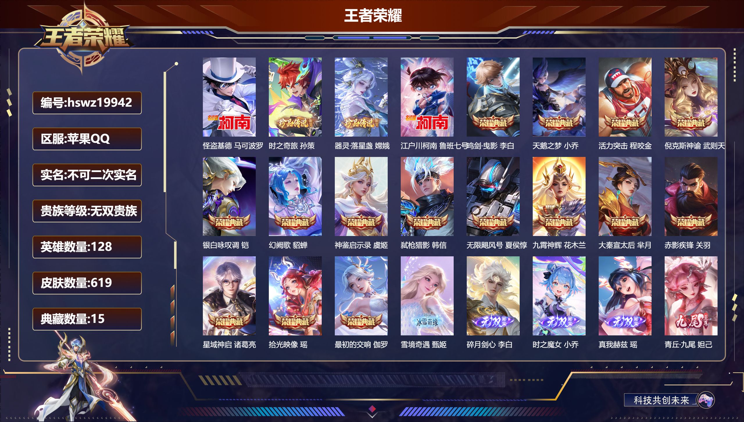 PX_2304893-Q/荣耀王者/619皮肤/128英雄/15典藏/0珍品无双/9无双/4珍品传说/114传说/208史诗/10稀有英雄 【4,珍品传说】怪盗基德,马可波罗,时之奇旅,孙策,器灵·落星盏,嫦娥,江户川柯南,鲁班七号, 【15,典藏皮肤】鸣剑·曳影,李白,天鹅之梦,小乔,活力突击,程咬金,倪克斯神谕,武则天,银白咏叹调,铠,幻阙歌,貂蝉,神鉴启示录,虞姬,弑枪猎影,韩信,无限飓风号,夏侯惇,九霄神辉,花木兰,大秦宣太后,芈月,赤影疾锋,关羽,星域神启,诸葛亮,拾光映像,瑶,最初的交响,伽罗, 【9,无双皮肤】雪境奇遇,甄姬,碎月剑心,李白,时之魔女,小乔,真我赫兹,瑶,青丘·九尾,妲己,离恨烟,公孙离,花合斗,不知火舞,群星魔术团,韩信,器灵·螭龙剑,曜, 【114,传说皮肤】枫霜尽,橘右京,胖达荣荣,梦奇,鹤归松栖,云缨,武圣,关羽,永恒水手月亮,王昭君,启明星使,虞姬,云霓雀翎,虞姬,前尘镜,娜可露露,花朝如约,蔡文姬,碎云,百里守约,纵目迁山,杨戬,逐花归海,澜,时之祈愿,瑶,电玩·雷克斯,澜,飞鸢探春,李元芳,无双飞将,马超,白虎志,百里玄策,九山相柳,司马懿,死亡执政官,大司命,李逍遥,,曜,零号·赤焰,孙悟空,地狱火,孙悟空,云鹰飞将,曜,齐天大圣,孙悟空,补天,女娲,夜礼服假面,狄仁杰,神器·狴犴令,狄仁杰,追逃游戏,亚瑟,深海之息,马可波罗,觅芳踪,艾琳,游龙清影,西施,追逃游戏,安琪拉,燃星之曲,花木兰,灼幽烈阳,东皇太一,浮生妄,夏洛特,猫影幻舞,貂蝉,仲夏夜之梦,貂蝉,落雪白狼,亚连,惊梅引,宫本武藏,影龙天霄,兰陵王,记忆之芯,公孙离,地狱之眼,宫本武藏,祈雪灵祝,公孙离,默契交锋,兰陵王,海洋之心,武则天,时雨天司,诸葛亮,音你心动,周瑜,炽阳神光,镜,启示之音,露娜,黄金射手座,后羿,遇见神鼓,吕布,曦玄引,吕布,霜月吟,露娜,无限倾心,项羽,寅虎·瑞焰,鲁班七号,时之奇旅,鲁班七号,怒海麟威,吕布,乞巧织情,王昭君,乘龙·问璇玑,孙尚香,时之恋人,刘备,挚爱之约,孙策,黄金狮子座,达摩,绯月行,不知火舞,久胜战神,干将莫邪,末日机甲,孙尚香,乘龙·淬吴钩,孙策,异界灵契,孙尚香,末日机甲,孙策,山海·炽霜斩,李信,一念神魔,李信,音你心动,小乔,战鼓燎原,典韦,画中仙,干将莫邪,天魔缭乱,吕布,山海·琳琅生,小乔,淬星耀世,赵云,百相守梦,张飞,小动物乐团,孙膑,炽翼辉光,伽罗,乘龙·铭钟鼎,赵云,太华,伽罗,绛天战甲,铠,至美·化雀舞,甄姬,时之奇旅,大乔,挚爱花嫁,大乔,妄想奇谈,上官婉儿,妄想实况,马可波罗,寅虎·赤拳,裴擒虎,超时空战士,狄仁杰,琥珀纪元,马超,霜北刀,夏侯惇,冥王哈迪斯,铠,黄金白羊座,张良,星之鸣奏,杨玉环,金乌负日,海月,心动手记,朵莉亚,愿照·九州拓,澜,群星魔术团,云中君,黄金天蝎座,墨子,玄雷天君,嬴政,愿照·众生和,妲己,愿照·福禄聚,蔡文姬,神树通天,后羿,幻光神枪,云缨,愿照·山河定,司空震,祥瑞亨通,裴擒虎,愿照·岁时盈,虞姬,千劫归真,后羿,牧神诗旅,庄周,愿照·千秋盛,女娲,曦玄引,貂蝉,鸣野蒿,桑启,映山客,王昭君,续相思,西施, 【208,史诗皮肤】奔雷神使,牛魔,龙鼓争鸣,蒙犽,霸王别姬,项羽,时之奇旅,安琪拉,电玩小子,鲁班七号,末日机甲,吕布,白昼王子,嬴政,蔬乡物语,鲁班七号,超元猎域,百里玄策,紫霞仙子,露娜,百解令,蒙犽,高山流水,庄周,匿光追影者,镜,云端筑梦师,庄周,雪夜绮愿,周瑜,奇遇舞章,艾琳,暗渊魔法,司马懿,乘龙·忆丹青,大乔,暗影游猎,马可波罗,燃音魔法,高渐离,天秀·音浪,高渐离,白鹤梁神女,大乔,苍穹之光,项羽,天秀·启明,杨戬,狮舞东方,鲁班七号,猫狗日记,大乔,妄想食味,姬小满,糖绘人间,亚连,德古拉伯爵,刘邦,山海·玄木吟,马可波罗,心灵战警,亚瑟,闲日渔趣,姜子牙,五谷丰年,鬼谷子,银翎春语,杨玉环,诗语江南,西施,无心,元歌,戍鼓铭心,钟无艳,巫礼祀神,少司缘,鬼剑武藏,宫本武藏,百相守梦,黄忠,迷踪丽影,阿轲,幻珠鲛人,朵莉亚,星夜王子,白起,守夜人,弈星,寅虎·心曲,杨玉环,至美·乘鲤谣,西施,无限星赏官,公孙离,千筹问战,张良,地狱燃心,司空震,玉兔公主,公孙离,遇见飞天,杨玉环,摇滚巨星,嬴政,电玩高手,狂铁,顽趣,梦奇,蜜橘之夏,公孙离,修罗,橘右京,拒霜思,嫦娥,魅力维加斯,妲己,黄金分割率,诸葛亮,赞萌露比,云缨,电玩·兔顽号,蔡文姬,滕王阁序,弈星,乐园奇幻夜,钟馗,如梦令,嫦娥,苍鳞隐世,白起,偶像歌手,王昭君,完美假期,米莱狄,荣光圣徽,蒙恬,女仆咖啡,妲己,白蛇,大乔,赏金猎手,澜,星界游侠,暃,晚萤,娜可露露,猪悟能,猪八戒,遇见神鹿,瑶,舞动绿茵,蔡文姬,暗夜贵公子,嬴政,鹰眼统帅,狄仁杰,胡桃异想国,米莱狄,白晶晶,芈月,匿光启智者,鲁班大师,末日机甲,莱西奥,玫瑰异探,镜,孙行者,孙悟空,纤云弄巧,云中君,驯魔猎人,兰陵王,如梦令,后羿,龙骑士,墨子,降魔,墨子,金属风暴,墨子,傲雪梅枪,韩信,冰霜神祇,盘古,特工魅影,百里守约,猫狗日记,孙策,原初追逐者,百里玄策,逐浪之夏,李元芳,奇幻香踪,扁鹊,真我赫兹,百里守约,未来纪元,赵云,引擎之心,赵云,灵蛊蚀心,扁鹊,朱雀志,百里守约,黎明之约,雅典娜,石田雨龙,后羿,鸭鸭历险记,刘禅,驭风魔法,戈娅,魔术师,狄仁杰,热力回旋,百里玄策,埋骨钱,暃,龙之律动,狂铁,唤灵魅影,貂蝉,顽岩魄,蒙犽,皇家上将,赵云,冰冠公主,雅典娜,至尊宝,孙悟空,涂山红红,少司缘,辉光之辰,后羿,战舞者,姬小满,功夫厨神,程咬金,东方月初,大司命,电玩·爆裂旋风,刘禅,天才门将,刘禅,圣诞恋歌,貂蝉,云间偶戏,元歌,水晶猎龙者,