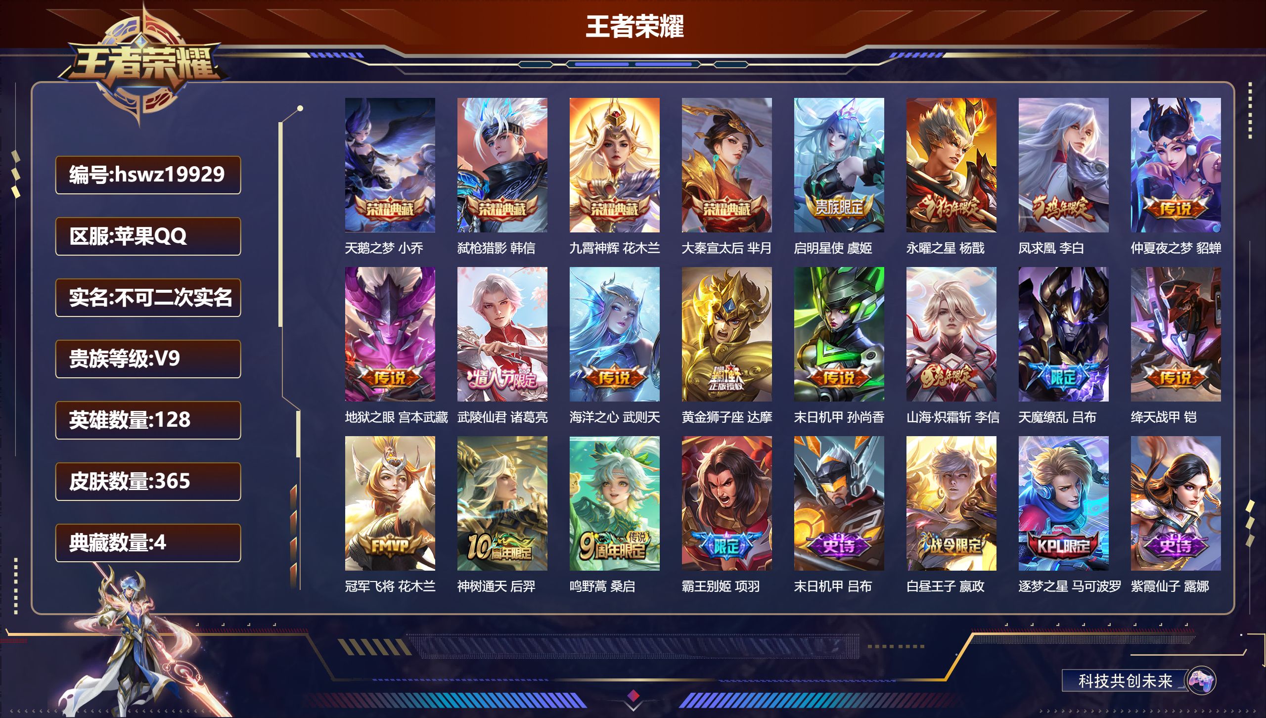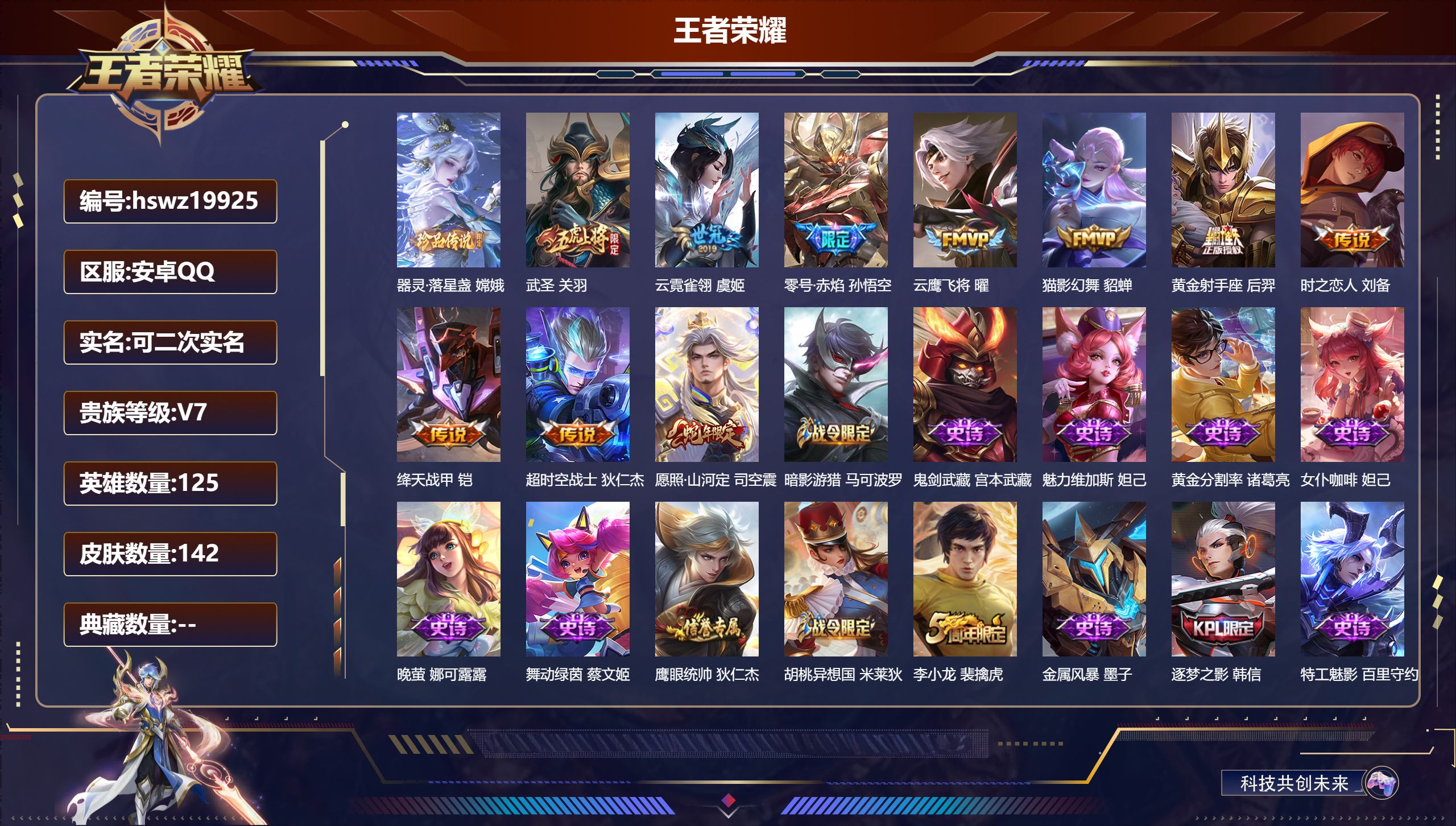 PX_2304858-Q/至尊星耀/142皮肤/125英雄/0典藏/0珍品无双/0无双/1珍品传说/10传说/31史诗/7稀有英雄 【1,珍品传说】器灵·落星盏,嫦娥, 【10,传说皮肤】武圣,关羽,云霓雀翎,虞姬,零号·赤焰,孙悟空,云鹰飞将,曜,猫影幻舞,貂蝉,黄金射手座,后羿,时之恋人,刘备,绛天战甲,铠,超时空战士,狄仁杰,愿照·山河定,司空震, 【31,史诗皮肤】暗影游猎,马可波罗,鬼剑武藏,宫本武藏,魅力维加斯,妲己,黄金分割率,诸葛亮,女仆咖啡,妲己,晚萤,娜可露露,舞动绿茵,蔡文姬,鹰眼统帅,狄仁杰,胡桃异想国,米莱狄,李小龙,裴擒虎,金属风暴,墨子,逐梦之影,韩信,特工魅影,百里守约,优雅恋人,嬴政,魔术师,狄仁杰,皇家上将,赵云,冰冠公主,雅典娜,至尊宝,孙悟空,云间偶戏,元歌,魅语,不知火舞,白龙吟,韩信,冰雪圆舞曲,甄姬,暗夜猫娘,阿轲,曙光守护者,铠,乱世虎臣,张飞,绅士熊喵,刘禅,时之恋人,孙尚香,水果甜心,孙尚香,狂想玩偶喵,蒙犽,化蝶舞,阿轲,幽灵船长,曹操, 【62,勇者皮肤】圆桌骑士,盾山,太极少年,赵怀真,星际陆战队,达摩,缤纷绘卷,张良,大发明家,达摩,丁香结,小乔,沉稳之力,孙尚香,醍醐杖,老夫子,黄金武士,典韦,阴阳师,狄仁杰,古海寻踪,张良,功夫老勺,老夫子,海滩派对,项羽,万华元夜,狄仁杰,演武夺筹,程咬金,西部游侠,莱西奥,野性能量,吕布,哥特玫瑰,露娜,守护之力,大乔,原初探秘者,鬼谷子,潮玩探月行,猪八戒,天穹祈灯,鬼谷子,西部大镖客,猪八戒,疑决卦,明世隐,化身博士,扁鹊,潮玩骑士王,亚瑟,五福同心,张飞,霸王丸,宫本武藏,虹云星官,明世隐,救世之瞳,扁鹊,死亡骑士,亚瑟,掌控之力,诸葛亮,海滩丽影,钟无艳,忍·炎影,赵云,坚韧之力,苏烈,乓乓大师,鲁班大师,兔女郎,花木兰,龙腾万里,关羽,千军破阵,苏烈,荣光之誓,亚瑟,花好人间,甄姬,万象初新,宫本武藏,单词大作战,雅典娜,教廷特使,韩信,街头霸王,韩信,妄想特派,李元芳,西部大镖客,孙悟空,混沌棋,弈星,幻想奇妙夜,王昭君,驱傩正仪,钟馗,命运角斗场,狂铁,白执事,赵云,剑破天穹,刘邦,异域游侠,刘备,熔金海岸,周瑜,天穹之誓,姜子牙,长夏之忆,貂蝉,星梦巡礼,姜子牙,谧流熔炉,太乙真人,群星魔术团,程咬金,暗都幽影,大司命,噬灭天穹,东皇太一, 【39,其他皮肤】战争骑士,夏侯惇,圣殿之光,刘邦,芝加哥教父,黄忠,三太子,哪吒,棒球奇才,沈梦溪,龙域领主,铠,生化警戒,钟无艳,花见巫女,伽罗,爱与和平,苏烈,第七人偶,干将莫邪,万圣前夜,小乔,灼热之刃,李信,木偶奇遇记,鲁班七号,绯红之刃,露娜,碧珀绯影,暃,魇语军师,司马懿,启蛰,司空震,隐刃,兰陵王,花间舞,公孙离,异域舞娘,貂蝉,归虚梦演,鲁班大师,修竹墨客,上官婉儿,范海辛,李白,维京掠夺者,苍,激情绿茵,马可波罗,归虚梦演,西施,锦衣卫,狄仁杰,归虚梦演,曜,威尼斯狂欢,百里玄策,荷鲁斯之眼,云中君,创世神祝,盘古,特种部队,李元芳,绝影神枪,百里守约,孤猎,澜,踏雪寻梅,弈星,赤焰之缨,云缨,露花倒影,嫦娥,西部大镖客,孙悟空,器灵·落星盏,嫦娥, 【7,稀有英雄】不知火舞,橘右京,夏洛特,娜可露露,韩信,艾琳,赵云, 营地ID:,