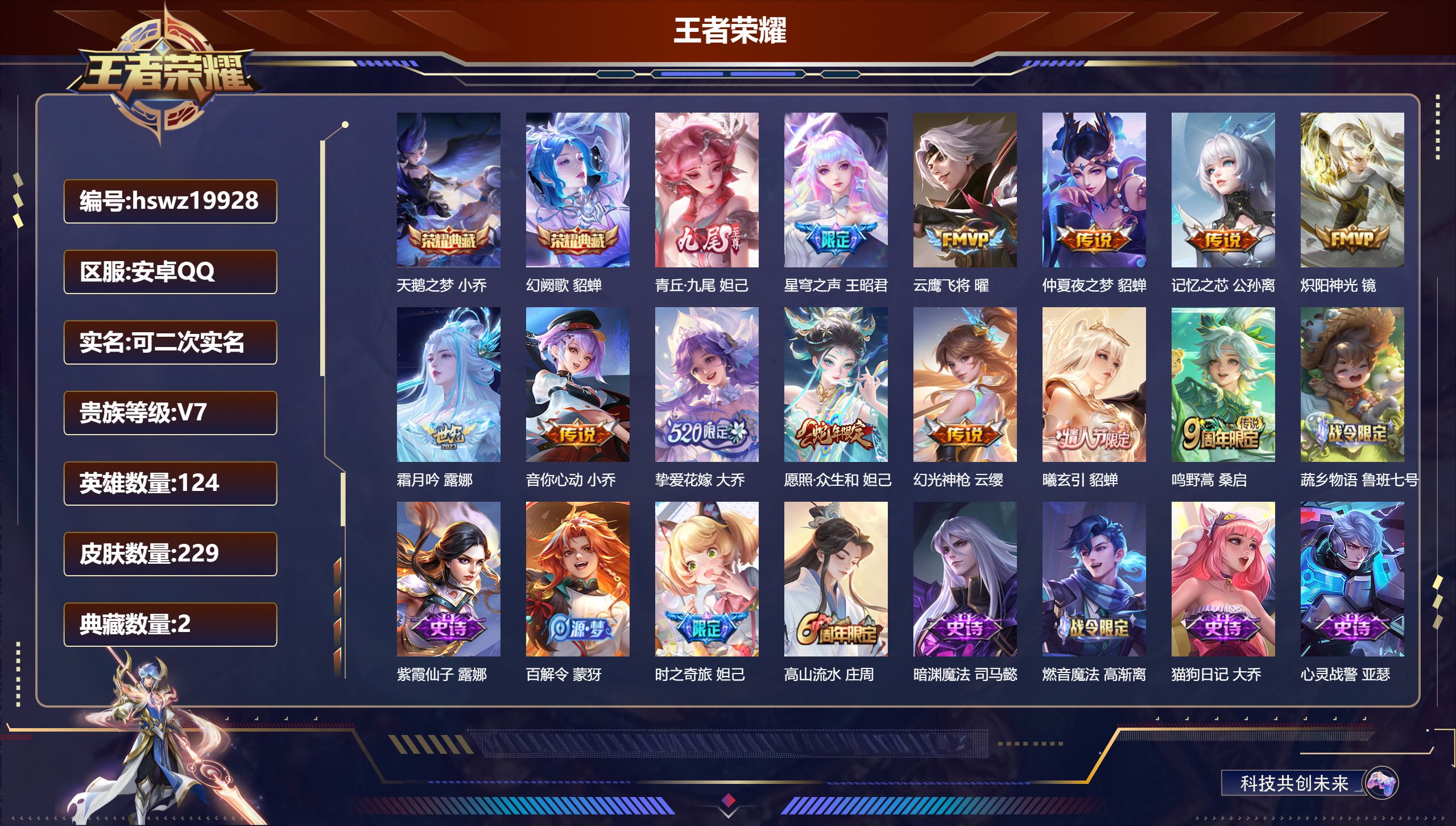 PX_2304864-Q/最强王者/229皮肤/124英雄/2典藏/0珍品无双/1无双/0珍品传说/12传说/68史诗/6稀有英雄 【2,典藏皮肤】天鹅之梦,小乔,幻阙歌,貂蝉, 【1,无双皮肤】青丘·九尾,妲己, 【12,传说皮肤】星穹之声,王昭君,云鹰飞将,曜,仲夏夜之梦,貂蝉,记忆之芯,公孙离,炽阳神光,镜,霜月吟,露娜,音你心动,小乔,挚爱花嫁,大乔,愿照·众生和,妲己,幻光神枪,云缨,曦玄引,貂蝉,鸣野蒿,桑启, 【68,史诗皮肤】蔬乡物语,鲁班七号,紫霞仙子,露娜,百解令,蒙犽,时之奇旅,妲己,高山流水,庄周,暗渊魔法,司马懿,燃音魔法,高渐离,猫狗日记,大乔,心灵战警,亚瑟,五谷丰年,鬼谷子,诗语江南,西施,无心,元歌,鬼剑武藏,宫本武藏,百相守梦,黄忠,至美·乘鲤谣,西施,无限星赏官,公孙离,摇滚巨星,嬴政,顽趣,梦奇,修罗,橘右京,拒霜思,嫦娥,魅力维加斯,妲己,黄金分割率,诸葛亮,偶像歌手,王昭君,女仆咖啡,妲己,晚萤,娜可露露,遇见神鹿,瑶,舞动绿茵,蔡文姬,鹰眼统帅,狄仁杰,孙行者,孙悟空,纤云弄巧,云中君,金属风暴,墨子,特工魅影,百里守约,猫狗日记,孙策,逐浪之夏,李元芳,灵蛊蚀心,扁鹊,魔术师,狄仁杰,龙之律动,狂铁,顽岩魄,蒙犽,皇家上将,赵云,电玩·爆裂旋风,刘禅,天才门将,刘禅,圣诞恋歌,貂蝉,水晶猎龙者,花木兰,涂山容容,公孙离,圣诞狂欢,吕布,青焰无极,镜,魅语,不知火舞,群星魔术团,上官婉儿,器灵·浮梦炉,赵怀真,浮光幕影,芈月,夏日便利店,蔡文姬,星界战将,牛魔,茶境仙,孙膑,蔷薇恋人,孙尚香,冰雪圆舞曲,甄姬,千年之狐,李白,节奏热浪,阿轲,暗夜猫娘,阿轲,织梦人,西施,曙光守护者,铠,心灵骇客,安琪拉,乘龙·聚宝船,安琪拉,乱世虎臣,张飞,万物之道,弈星,缤纷独角兽,小乔,水果甜心,孙尚香,化蝶舞,阿轲,暗隐猎兽者,兰陵王, 【117,勇者皮肤】时空谍影,海诺,爱心护理,阿轲,太极少年,赵怀真,沙漠行僧,达摩,大漠名商,沈梦溪,暖冬絮语,程咬金,纽约教父,刘备,拳王,达摩,龙舞盛年,沈梦溪,乐园追猎者,白起,功夫炙烤,廉颇,沉稳之力,孙尚香,海盐诗旅,桑启,幻泉雾影,海月,归虚梦演,孙膑,黑桃队长,鲁班七号,黄金武士,典韦,王牌新星,海月,阴阳师,狄仁杰,次元突破,哪吒,古海寻踪,张良,牛运亨通,牛魔,功夫老勺,老夫子,西部大镖客,牛魔,鲨炮海盗猫,沈梦溪,虎啸剑宗,刘邦,海滩派对,项羽,克喵,鬼谷子,踏浪烽翎,莱西奥,演武夺筹,程咬金,红桃皇后,芈月,野性能量,吕布,哥特玫瑰,露娜,守护之力,大乔,无双福将,程咬金,潮玩探月行,猪八戒,天穹祈灯,鬼谷子,决胜大满贯,曹操,阿尔法小队,后羿,五福同心,张飞,金色潮汐,朵莉亚,幻乐之宴,鬼谷子,东方不败,武则天,虹云星官,明世隐,潮玩牛仔,马可波罗,救世之瞳,扁鹊,死亡骑士,亚瑟,浪漫序章,刘备,敏锐之力,李白,危途狂花,戈娅,胡桃狂想曲,蒙犽,破局者,亚连,玩偶对对碰,安琪拉,掌控之力,诸葛亮,海滩丽影,钟无艳,雪境奇遇,西施,唤灵魔甲,刘禅,逐霄战戟,吕布,擒涛扼浪,裴擒虎,乓乓大师,鲁班大师,探海日志,鲁班大师,天使之翼,孙膑,雾都夜雨,干将莫邪,兔女郎,花木兰,龙腾万里,关羽,金庭之子,兰陵王,未来纪元,宫本武藏,罗小黑战记,哪吒,千军破阵,苏烈,花好人间,甄姬,潮玩造梦师,刘备,时尚教父,姜子牙,秘密基地,刘禅,教廷特使,韩信,云中旅人,李元芳,紫罗兰之誓,妲己,重装意志,盘古,进击墨子号,墨子,蔬乡物语,李元芳,少女阿狸,妲己,灵卜魔法,妲己,秘证寻踪,小乔,蔚蓝守将,蒙恬,春野闲踪,苏烈,布丁狗之约,阿古朵,绒语心约,大乔,命运加冕,露娜,小满鸭,姬小满,幻想奇妙夜,王昭君,灵野札记,张良,驱傩正仪,钟馗,死霸装,白起,特工战影,狂铁,虚灵犬护,钟馗,剑破天穹,刘邦,异域游侠,刘备,苍威无极,项羽,铁骨偃魂,典韦,熔金海岸,周瑜,苍林狼骑,苍,天穹之誓,姜子牙,魅影绮裳,影,长夏之忆,貂蝉,访茗客,马超,星梦巡礼,姜子牙,谧流熔炉,太乙真人,群星魔术团,程咬金,经纬探寻者,盘古,暗都幽影,大司命,夏日便利店,虞姬,锦麟游梦,庄周,逆浪荇歌,甄姬,噬灭天穹,东皇太一,灵卦秘语,少司缘,敬我三分,盘古,玫蓝誓约,戈娅,景韶洛都,明世隐, 【29,其他皮肤】金属狂潮,高渐离,芝加哥教父,黄忠,潮流仙人,老夫子,棒球奇才,沈梦溪,龙域领主,铠,万圣前夜,小乔,木偶奇遇记,鲁班七号,碧珀绯影,暃,英喵野望,刘禅,花间舞,公孙离,异域舞娘,貂蝉,街头旋风,裴擒虎,归虚梦演,鲁班大师,东海龙王,东皇太一,修竹墨客,上官婉儿,占星师,明世隐,激情绿茵,马可波罗,归虚梦演,西施,画中游,桑启,年年有余,猪八戒,锦衣卫,狄仁杰,战争女神,雅典娜,蔷薇王座,蔡文姬,踏雪寻梅,弈星,精灵公主,王昭君,赤焰之缨,云缨,露花倒影,嫦娥,地府判官,钟馗,美梦成真,梦奇, 【6,稀有英雄】不知火舞,夏洛特,娜可露露,韩信,艾琳,赵云, 营地ID:,,