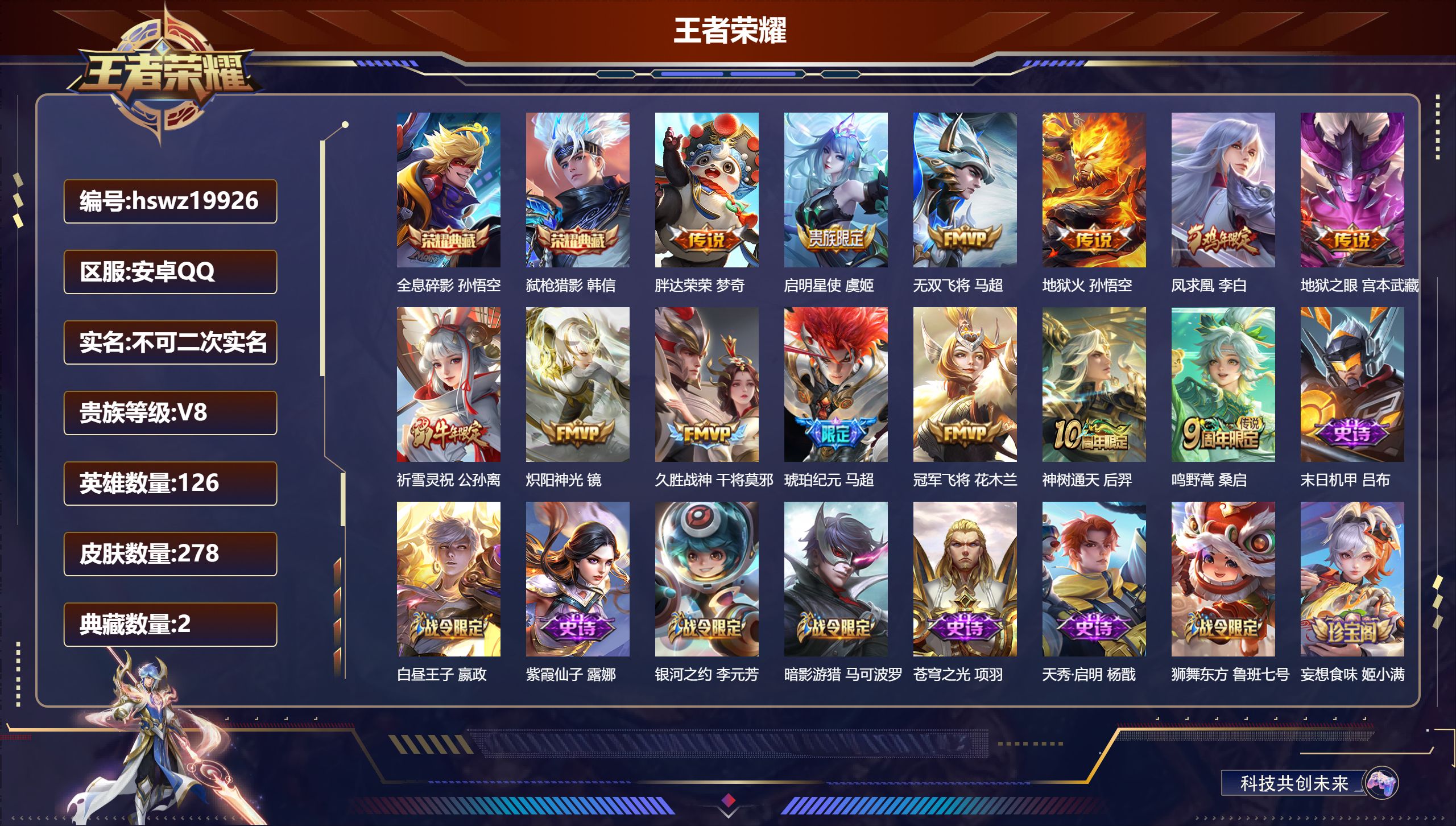 PX_2304860-Q/荣耀王者/278皮肤/126英雄/2典藏/0珍品无双/0无双/0珍品传说/13传说/74史诗/8稀有英雄 【2,典藏皮肤】全息碎影,孙悟空,弑枪猎影,韩信, 【13,传说皮肤】胖达荣荣,梦奇,启明星使,虞姬,无双飞将,马超,地狱火,孙悟空,凤求凰,李白,地狱之眼,宫本武藏,祈雪灵祝,公孙离,炽阳神光,镜,久胜战神,干将莫邪,琥珀纪元,马超,冠军飞将,花木兰,神树通天,后羿,鸣野蒿,桑启, 【74,史诗皮肤】末日机甲,吕布,白昼王子,嬴政,紫霞仙子,露娜,银河之约,李元芳,暗影游猎,马可波罗,苍穹之光,项羽,天秀·启明,杨戬,狮舞东方,鲁班七号,妄想食味,姬小满,德古拉伯爵,刘邦,心灵战警,亚瑟,五谷丰年,鬼谷子,巫礼祀神,少司缘,鬼剑武藏,宫本武藏,百相守梦,黄忠,星夜王子,白起,无限星赏官,公孙离,遇见飞天,杨玉环,摇滚巨星,嬴政,顽趣,梦奇,冰锋战神,关羽,修罗,橘右京,魅力维加斯,妲己,黄金分割率,诸葛亮,女仆咖啡,妲己,赏金猎手,澜,晚萤,娜可露露,鹰眼统帅,狄仁杰,大圣娶亲,孙悟空,飞衡,韩信,李小龙,裴擒虎,光弋星穹,莱西奥,纤云弄巧,云中君,金属风暴,墨子,逐梦之影,韩信,特工魅影,百里守约,猫狗日记,孙策,原初追逐者,百里玄策,逐浪之夏,李元芳,未来纪元,赵云,引擎之心,赵云,黎明之约,雅典娜,魔术师,狄仁杰,龙之律动,狂铁,神威,马超,皇家上将,赵云,冰冠公主,雅典娜,至尊宝,孙悟空,功夫厨神,程咬金,梁祝,上官婉儿,圣诞恋歌,貂蝉,云间偶戏,元歌,水晶猎龙者,花木兰,一生所爱,露娜,圣诞狂欢,吕布,地狱岩魂,廉颇,冰雪圆舞曲,甄姬,航海奇遇记,老夫子,千年之狐,李白,节奏热浪,阿轲,游园惊梦,甄姬,曙光守护者,铠,万灵启世,女娲,瑞麟志,花木兰,心灵骇客,安琪拉,乱世虎臣,张飞,真我赫兹,镜,琥珀纪元,伽罗,绅士熊喵,刘禅,缤纷独角兽,小乔,天狼狩猎者,裴擒虎,水果甜心,孙尚香,乘风破浪,夏侯惇,暗隐猎兽者,兰陵王, 【132,勇者皮肤】时空谍影,海诺,圆桌骑士,盾山,烛龙,曹操,爱心护理,阿轲,沙漠行僧,达摩,大漠名商,沈梦溪,缤纷绘卷,张良,纽约教父,刘备,拳王,达摩,大发明家,达摩,龙舞盛年,沈梦溪,丁香结,小乔,功夫炙烤,廉颇,铁甲之心,典韦,沉稳之力,孙尚香,海盐诗旅,桑启,幻泉雾影,海月,朔风刀,夏侯惇,醍醐杖,老夫子,归虚梦演,孙膑,汉昭烈帝,刘备,白色死神,白起,黑桃队长,鲁班七号,黄金武士,典韦,御旌,牛魔,阴阳师,狄仁杰,炼金王,扁鹊,径山谋武,孙权,致命风华,阿轲,次元突破,哪吒,古海寻踪,张良,牛运亨通,牛魔,功夫老勺,老夫子,西部大镖客,牛魔,鲨炮海盗猫,沈梦溪,海滩派对,项羽,完美运算,后羿,万华元夜,狄仁杰,克喵,鬼谷子,制霸全明星,牛魔,踏浪烽翎,莱西奥,演武夺筹,程咬金,西部游侠,莱西奥,美猴王,孙悟空,蜃楼王,庄周,猎兽之王,吕布,野性能量,吕布,哥特玫瑰,露娜,守护之力,大乔,无双福将,程咬金,原初探秘者,鬼谷子,星空之诺,沈梦溪,潮玩探月行,猪八戒,天穹祈灯,鬼谷子,疑决卦,明世隐,化身博士,扁鹊,潮玩骑士王,亚瑟,五福同心,张飞,金色潮汐,朵莉亚,幻乐之宴,鬼谷子,霸王丸,宫本武藏,虹云星官,明世隐,潮玩牛仔,马可波罗,死亡骑士,亚瑟,敏锐之力,李白,幽兰居士,张良,掌控之力,诸葛亮,海滩丽影,钟无艳,忍·炎影,赵云,狰,白起,雪境奇遇,西施,重明,芈月,炽热元素使,姜子牙,坚韧之力,苏烈,唤灵魔甲,刘禅,万事如意,刘备,乓乓大师,鲁班大师,死亡摇滚,高渐离,妖精王,孙膑,天使之翼,孙膑,雾都夜雨,干将莫邪,兔女郎,花木兰,龙腾万里,关羽,金庭之子,兰陵王,千军破阵,苏烈,往忆晖光,明世隐,荣光之誓,亚瑟,花好人间,甄姬,万象初新,宫本武藏,御銮,盾山,时尚教父,姜子牙,秘密基地,刘禅,穷奇,典韦,教廷特使,韩信,黑猫爱糖果,李元芳,街头霸王,韩信,云中旅人,李元芳,西部大镖客,孙悟空,神迹守卫,墨子,凯尔特女王,虞姬,进击墨子号,墨子,少女阿狸,妲己,混沌棋,弈星,御霄,米莱狄,命运加冕,露娜,幻想奇妙夜,王昭君,驱傩正仪,钟馗,神迹守卫,钟馗,死霸装,白起,特工战影,狂铁,虚灵犬护,钟馗,御狮,狂铁,白执事,赵云,饕餮,太乙真人,华丽摇滚,太乙真人,剑破天穹,刘邦,铁骨偃魂,典韦,熔金海岸,周瑜,苍林狼骑,苍,天穹之誓,姜子牙,魅影绮裳,影,星梦巡礼,姜子牙,谧流熔炉,太乙真人,群星魔术团,程咬金,暗都幽影,大司命,鹤鸣心笺,艾琳,云械蓝图,云中君,噬灭天穹,东皇太一,灵卦秘语,少司缘,敬我三分,盘古,玫蓝誓约,戈娅,景韶洛都,明世隐, 【55,其他皮肤】金属狂潮,高渐离,前尘,金蝉,战争骑士,夏侯惇,圣殿之光,刘邦,潮流仙人,老夫子,三太子,哪吒,棒球奇才,沈梦溪,龙域领主,铠,生化警戒,钟无艳,超能战警,曹操,花见巫女,伽罗,第七人偶,干将莫邪,灼热之刃,李信,熊喵少女,阿古朵,海之征途,孙策,帝国元帅,项羽,精灵王,后羿,绯红之刃,露娜,冰刃幻境,镜,碧珀绯影,暃,星航指挥官,诸葛亮,魇语军师,司马懿,午夜歌剧院,元歌,启蛰,司空震,花间舞,公孙离,街头旋风,裴擒虎,归虚梦演,鲁班大师,东海龙王,东皇太一,修竹墨客,上官婉儿,剑舞者,花木兰,范海辛,李白,维京掠夺者,苍,占星师,明世隐,激情绿茵,马可波罗,埃及法老,杨戬,归虚梦演,西施,画中游,桑启,年年有余,猪八戒,尼罗河女神,女娲,锦衣卫,狄仁杰,归虚梦演,曜,威尼斯狂欢,百里玄策,幸存者,马超,战争女神,雅典娜,创世神祝,盘古,特种部队,李元芳,绝影神枪,百里守约,蔷薇王座,蔡文姬,孤猎,澜,精灵公主,王昭君,赤焰之缨,云缨,露花倒影,嫦娥,美梦成真,梦奇,圆桌骑士