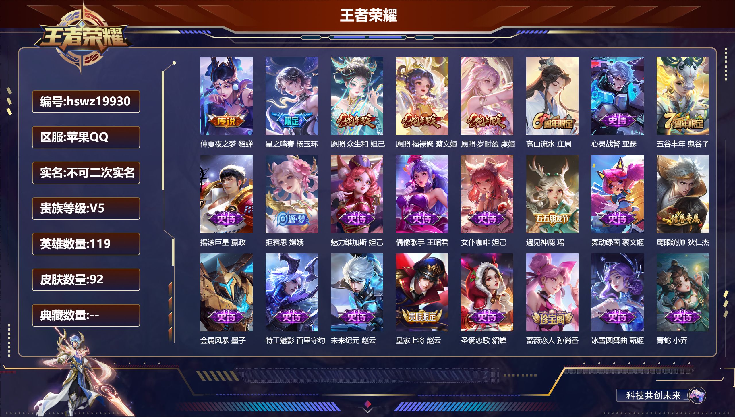 PX_2304868-Q/尊贵铂金/92皮肤/119英雄/0典藏/0珍品无双/0无双/0珍品传说/5传说/25史诗/8稀有英雄 【5,传说皮肤】仲夏夜之梦,貂蝉,星之鸣奏,杨玉环,愿照·众生和,妲己,愿照·福禄聚,蔡文姬,愿照·岁时盈,虞姬, 【25,史诗皮肤】高山流水,庄周,心灵战警,亚瑟,五谷丰年,鬼谷子,摇滚巨星,嬴政,拒霜思,嫦娥,魅力维加斯,妲己,偶像歌手,王昭君,女仆咖啡,妲己,遇见神鹿,瑶,舞动绿茵,蔡文姬,鹰眼统帅,狄仁杰,金属风暴,墨子,特工魅影,百里守约,未来纪元,赵云,皇家上将,赵云,圣诞恋歌,貂蝉,蔷薇恋人,孙尚香,冰雪圆舞曲,甄姬,青蛇,小乔,曙光守护者,铠,心灵骇客,安琪拉,缤纷独角兽,小乔,时之恋人,孙尚香,水果甜心,孙尚香,化蝶舞,阿轲, 【44,勇者皮肤】爱心护理,阿轲,沙漠行僧,达摩,大漠名商,沈梦溪,缤纷绘卷,张良,沉稳之力,孙尚香,海盐诗旅,桑启,醍醐杖,老夫子,归虚梦演,孙膑,汉昭烈帝,刘备,阴阳师,狄仁杰,鲨炮海盗猫,沈梦溪,海滩派对,项羽,万华元夜,狄仁杰,演武夺筹,程咬金,守护之力,大乔,瓷语鉴心,露娜,原初探秘者,鬼谷子,潮玩探月行,猪八戒,五福同心,张飞,幻乐之宴,鬼谷子,虹云星官,明世隐,死亡骑士,亚瑟,浪漫序章,刘备,敏锐之力,李白,玩偶对对碰,安琪拉,唤灵魔甲,刘禅,乓乓大师,鲁班大师,探海日志,鲁班大师,兔女郎,花木兰,金庭之子,兰陵王,千军破阵,苏烈,教廷特使,韩信,云中旅人,李元芳,紫罗兰之誓,妲己,秘证寻踪,小乔,驱傩正仪,钟馗,特工战影,狂铁,苍林狼骑,苍,魅影绮裳,影,星梦巡礼,姜子牙,谧流熔炉,太乙真人,灵卦秘语,少司缘,玫蓝誓约,戈娅,景韶洛都,明世隐, 【21,其他皮肤】伊势巫女,大乔,前尘,金蝉,棒球奇才,沈梦溪,极冰防御线,盾山,花见巫女,伽罗,第七人偶,干将莫邪,绯红之刃,露娜,碧珀绯影,暃,花间舞,公孙离,异域舞娘,貂蝉,东海龙王,东皇太一,修竹墨客,上官婉儿,占星师,明世隐,画中游,桑启,尼罗河女神,女娲,战争女神,雅典娜,绝影神枪,百里守约,蔷薇王座,蔡文姬,森,瑶,踏雪寻梅,弈星,精准探案法,米莱狄, 【8,稀有英雄】嬴政,不知火舞,橘右京,夏洛特,娜可露露,韩信,艾琳,赵云, 营地ID:,