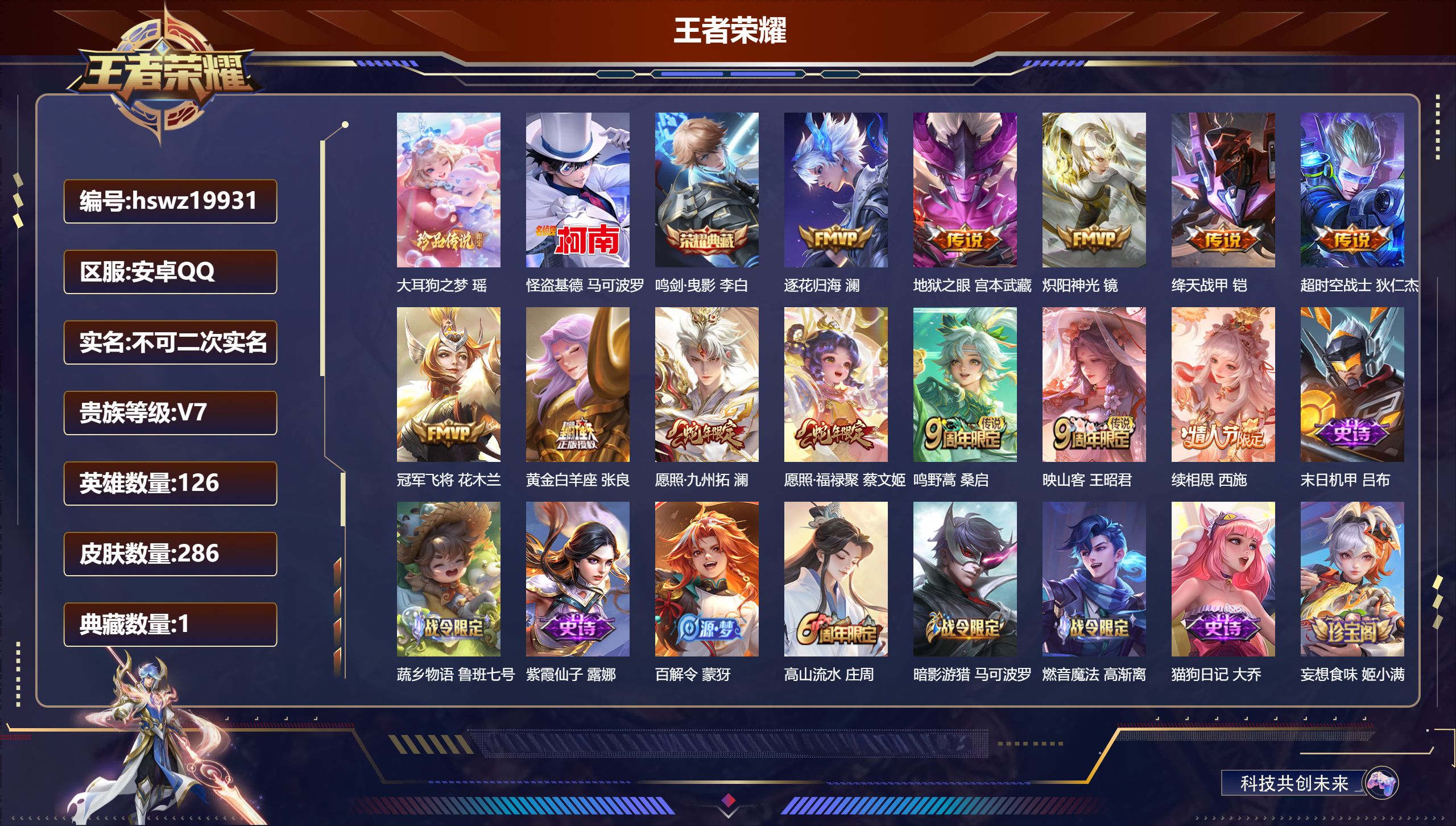 PX_2304870-Q/无双王者/286皮肤/126英雄/1典藏/0珍品无双/0无双/2珍品传说/12传说/74史诗/8稀有英雄 【2,珍品传说】大耳狗之梦,瑶,怪盗基德,马可波罗, 【1,典藏皮肤】鸣剑·曳影,李白, 【12,传说皮肤】逐花归海,澜,地狱之眼,宫本武藏,炽阳神光,镜,绛天战甲,铠,超时空战士,狄仁杰,冠军飞将,花木兰,黄金白羊座,张良,愿照·九州拓,澜,愿照·福禄聚,蔡文姬,鸣野蒿,桑启,映山客,王昭君,续相思,西施, 【74,史诗皮肤】末日机甲,吕布,蔬乡物语,鲁班七号,紫霞仙子,露娜,百解令,蒙犽,高山流水,庄周,暗影游猎,马可波罗,燃音魔法,高渐离,猫狗日记,大乔,妄想食味,姬小满,山海·玄木吟,马可波罗,心灵战警,亚瑟,五谷丰年,鬼谷子,鬼剑武藏,宫本武藏,星夜王子,白起,地狱燃心,司空震,顽趣,梦奇,魅力维加斯,妲己,黄金分割率,诸葛亮,荣光圣徽,蒙恬,女仆咖啡,妲己,赏金猎手,澜,星界游侠,暃,舞动绿茵,蔡文姬,暗夜贵公子,嬴政,鹰眼统帅,狄仁杰,飞衡,韩信,孙行者,孙悟空,李小龙,裴擒虎,纤云弄巧,云中君,龙骑士,墨子,金属风暴,墨子,傲雪梅枪,韩信,特工魅影,百里守约,猫狗日记,孙策,原初追逐者,百里玄策,逐浪之夏,李元芳,未来纪元,赵云,驭风魔法,戈娅,魔术师,狄仁杰,龙之律动,狂铁,顽岩魄,蒙犽,皇家上将,赵云,冰冠公主,雅典娜,涂山红红,少司缘,功夫厨神,程咬金,东方月初,大司命,圣诞恋歌,貂蝉,涂山容容,公孙离,圣诞狂欢,吕布,青焰无极,镜,器灵·浮梦炉,赵怀真,星界战将,牛魔,茶境仙,孙膑,蔷薇恋人,孙尚香,冰雪圆舞曲,甄姬,青蛇,小乔,千年之狐,李白,节奏热浪,阿轲,超时空战士,钟无艳,曙光守护者,铠,万灵启世,女娲,乱世虎臣,张飞,琥珀纪元,伽罗,绅士熊喵,刘禅,星界特工,马可波罗,缤纷独角兽,小乔,陌上桑,艾琳,蓝屏警告,典韦,水果甜心,孙尚香,化蝶舞,阿轲,江河有灵,阿古朵,幽灵船长,曹操,乘风破浪,夏侯惇,暗隐猎兽者,兰陵王, 【137,勇者皮肤】时空谍影,海诺,玲珑珍味,西施,圆桌骑士,盾山,太极少年,赵怀真,沙漠行僧,达摩,大漠名商,沈梦溪,缤纷绘卷,张良,纽约教父,刘备,拳王,达摩,大发明家,达摩,龙舞盛年,沈梦溪,乐园追猎者,白起,功夫炙烤,廉颇,沉稳之力,孙尚香,海盐诗旅,桑启,幻泉雾影,海月,醍醐杖,老夫子,热血海滩,哪吒,白色死神,白起,黑桃队长,鲁班七号,黄金武士,典韦,王牌新星,海月,落雪兰心,甄姬,阴阳师,狄仁杰,次元突破,哪吒,古海寻踪,张良,牛运亨通,牛魔,戏梦巡演,空空儿,功夫老勺,老夫子,西部大镖客,牛魔,鲨炮海盗猫,沈梦溪,虎啸剑宗,刘邦,海滩派对,项羽,完美运算,后羿,万华元夜,狄仁杰,踏浪烽翎,莱西奥,演武夺筹,程咬金,红桃皇后,芈月,野性能量,吕布,哥特玫瑰,露娜,无双福将,程咬金,瓷语鉴心,露娜,原初探秘者,鬼谷子,潮玩探月行,猪八戒,鸿运当头,亚瑟,天穹祈灯,鬼谷子,决胜大满贯,曹操,疑决卦,明世隐,化身博士,扁鹊,阿尔法小队,后羿,无尽旅途,扁鹊,五福同心,张飞,金色潮汐,朵莉亚,幻乐之宴,鬼谷子,虹云星官,明世隐,救世之瞳,扁鹊,死亡骑士,亚瑟,浪漫序章,刘备,敏锐之力,李白,胡桃狂想曲,蒙犽,破局者,亚连,幽兰居士,张良,掌控之力,诸葛亮,海滩丽影,钟无艳,忍·炎影,赵云,雪境奇遇,西施,炽热元素使,姜子牙,坚韧之力,苏烈,唤灵魔甲,刘禅,擒涛扼浪,裴擒虎,乓乓大师,鲁班大师,探海日志,鲁班大师,天使之翼,孙膑,雾都夜雨,干将莫邪,兔女郎,花木兰,龙腾万里,关羽,流音漫舞,艾琳,金庭之子,兰陵王,幻夜行动,兰陵王,未来纪元,宫本武藏,千军破阵,苏烈,零食大作战,姬小满,荣光之誓,亚瑟,花好人间,甄姬,聚星闪耀,钟无艳,潮玩造梦师,刘备,时尚教父,姜子牙,春野之旅,钟无艳,秘密基地,刘禅,教廷特使,韩信,街头霸王,韩信,云中旅人,李元芳,妄想特派,李元芳,西部大镖客,孙悟空,蔬乡物语,李元芳,灵卜魔法,妲己,蔚蓝守将,蒙恬,春野闲踪,苏烈,布丁狗之约,阿古朵,暖冬·兔眠,嫦娥,绒语心约,大乔,命运加冕,露娜,小满鸭,姬小满,幻想奇妙夜,王昭君,灵野札记,张良,驱傩正仪,钟馗,死霸装,白起,特工战影,狂铁,虚灵犬护,钟馗,漠中幻影,嫦娥,白执事,赵云,劲辣红锅,太乙真人,剑破天穹,刘邦,异域游侠,刘备,苍威无极,项羽,铁骨偃魂,典韦,熔金海岸,周瑜,苍林狼骑,苍,天穹之誓,姜子牙,魅影绮裳,影,长夏之忆,貂蝉,访茗客,马超,星梦巡礼,姜子牙,破阵·退雄兵,杨戬,谧流熔炉,太乙真人,金福满堂,东皇太一,群星魔术团,程咬金,经纬探寻者,盘古,暗都幽影,大司命,鹤鸣心笺,艾琳,锦麟游梦,庄周,逆浪荇歌,甄姬,噬灭天穹,东皇太一,灵卦秘语,少司缘,敬我三分,盘古,玫蓝誓约,戈娅,景韶洛都,明世隐, 【62,其他皮肤】伊势巫女,大乔,金属狂潮,高渐离,前尘,金蝉,战争骑士,夏侯惇,圣殿之光,刘邦,潮流仙人,老夫子,三太子,哪吒,棒球奇才,沈梦溪,龙域领主,铠,生化警戒,钟无艳,花见巫女,伽罗,爱与和平,苏烈,万圣前夜,小乔,灼热之刃,李信,熊喵少女,阿古朵,海之征途,孙策,木偶奇遇记,鲁班七号,福禄兄弟,鲁班七号,绯红之刃,露娜,冰刃幻境,镜,碧珀绯影,暃,魇语军师,司马懿,英喵野望,刘禅,午夜歌剧院,元歌,启蛰,司空震,隐刃,兰陵王,霓裳曲,杨玉环,花间舞,公孙离,归虚梦演,鲁班大师,东海龙王,东皇太一,修竹墨客,上官婉儿,范海辛,李白,维京掠夺者,苍,占星师,明世隐,归虚梦演,蒙犽,激情绿茵,马可波罗,埃及法老,杨戬,归虚梦演,西施,阿摩司公爵,鬼谷子,年年有余,猪八戒,尼罗河女神,女娲,锦衣卫,狄仁杰,一千零一夜,张良,