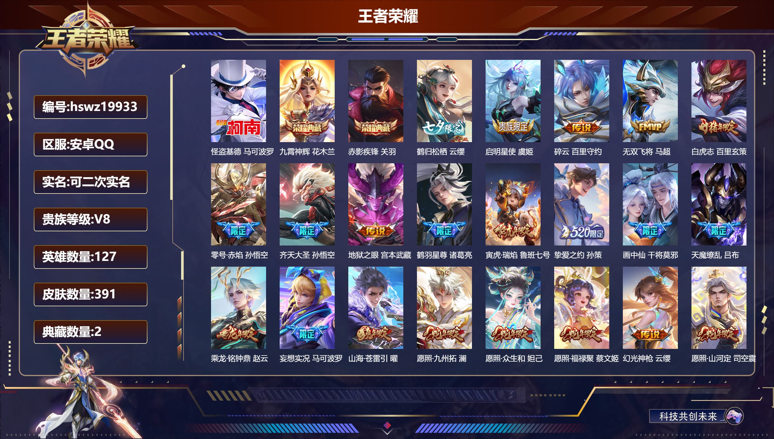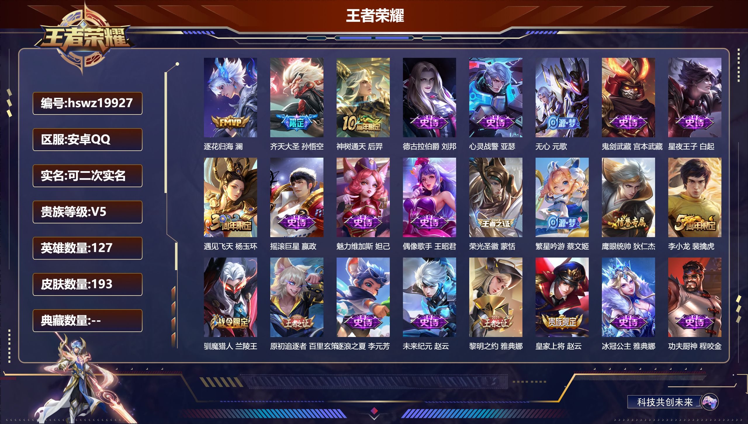 PX_2304862-Q/绝世王者/193皮肤/127英雄/0典藏/0珍品无双/0无双/0珍品传说/3传说/34史诗/9稀有英雄 【3,传说皮肤】逐花归海,澜,齐天大圣,孙悟空,神树通天,后羿, 【34,史诗皮肤】德古拉伯爵,刘邦,心灵战警,亚瑟,无心,元歌,鬼剑武藏,宫本武藏,星夜王子,白起,遇见飞天,杨玉环,摇滚巨星,嬴政,魅力维加斯,妲己,偶像歌手,王昭君,荣光圣徽,蒙恬,繁星吟游,蔡文姬,鹰眼统帅,狄仁杰,李小龙,裴擒虎,驯魔猎人,兰陵王,原初追逐者,百里玄策,逐浪之夏,李元芳,未来纪元,赵云,黎明之约,雅典娜,皇家上将,赵云,冰冠公主,雅典娜,功夫厨神,程咬金,梁祝,上官婉儿,圣诞恋歌,貂蝉,圣诞狂欢,吕布,青焰无极,镜,蔷薇恋人,孙尚香,冰雪圆舞曲,甄姬,万灵启世,女娲,乱世虎臣,张飞,绅士熊喵,刘禅,缤纷独角兽,小乔,水果甜心,孙尚香,江河有灵,阿古朵,乘风破浪,夏侯惇, 【108,勇者皮肤】胡桃夹子,干将莫邪,圆桌骑士,盾山,烛龙,曹操,爱心护理,阿轲,大漠名商,沈梦溪,缤纷绘卷,张良,纽约教父,刘备,拳王,达摩,大发明家,达摩,龙舞盛年,沈梦溪,丁香结,小乔,功夫炙烤,廉颇,沉稳之力,孙尚香,海盐诗旅,桑启,朔风刀,夏侯惇,醍醐杖,老夫子,归虚梦演,孙膑,汉昭烈帝,刘备,白色死神,白起,黑桃队长,鲁班七号,黄金武士,典韦,御旌,牛魔,阴阳师,狄仁杰,炼金王,扁鹊,致命风华,阿轲,次元突破,哪吒,古海寻踪,张良,功夫老勺,老夫子,鲨炮海盗猫,沈梦溪,鲤鱼之梦,庄周,海滩派对,项羽,完美运算,后羿,万华元夜,狄仁杰,演武夺筹,程咬金,蜃楼王,庄周,野性能量,吕布,哥特玫瑰,露娜,守护之力,大乔,无双福将,程咬金,原初探秘者,鬼谷子,潮玩探月行,猪八戒,天穹祈灯,鬼谷子,疑决卦,明世隐,化身博士,扁鹊,五福同心,张飞,次元傲视,杨戬,幻乐之宴,鬼谷子,霸王丸,宫本武藏,虹云星官,明世隐,赤莲之焰,周瑜,死亡骑士,亚瑟,敏锐之力,李白,玩偶对对碰,安琪拉,掌控之力,诸葛亮,海滩丽影,钟无艳,忍·炎影,赵云,狰,白起,重明,芈月,炽热元素使,姜子牙,坚韧之力,苏烈,唤灵魔甲,刘禅,万事如意,刘备,擒涛扼浪,裴擒虎,乓乓大师,鲁班大师,死亡摇滚,高渐离,妖精王,孙膑,探海日志,鲁班大师,兔女郎,花木兰,龙腾万里,关羽,金庭之子,兰陵王,未来纪元,宫本武藏,千军破阵,苏烈,荣光之誓,亚瑟,花好人间,甄姬,万象初新,宫本武藏,聚星闪耀,钟无艳,御銮,盾山,春野之旅,钟无艳,秘密基地,刘禅,穷奇,典韦,教廷特使,韩信,街头霸王,韩信,云中旅人,李元芳,妄想特派,李元芳,西部大镖客,孙悟空,紫罗兰之誓,妲己,凯尔特女王,虞姬,少女阿狸,妲己,混沌棋,弈星,御霄,米莱狄,蔚蓝守将,蒙恬,幻想奇妙夜,王昭君,驱傩正仪,钟馗,特工战影,狂铁,御狮,狂铁,白执事,赵云,饕餮,太乙真人,华丽摇滚,太乙真人,劲辣红锅,太乙真人,剑破天穹,刘邦,苍威无极,项羽,熔金海岸,周瑜,天穹之誓,姜子牙,魅影绮裳,影,星梦巡礼,姜子牙,群星魔术团,程咬金,鹤鸣心笺,艾琳,逆浪荇歌,甄姬, 【48,其他皮肤】伊势巫女,大乔,芝加哥教父,黄忠,潮流仙人,老夫子,棒球奇才,沈梦溪,龙域领主,铠,死神来了,曹操,超能战警,曹操,花见巫女,伽罗,第七人偶,干将莫邪,万圣前夜,小乔,灼热之刃,李信,熊喵少女,阿古朵,福禄兄弟,鲁班七号,精灵王,后羿,绯红之刃,露娜,冰刃幻境,镜,碧珀绯影,暃,魇语军师,司马懿,午夜歌剧院,元歌,启蛰,司空震,花间舞,公孙离,异域舞娘,貂蝉,街头旋风,裴擒虎,修竹墨客,上官婉儿,剑舞者,花木兰,范海辛,李白,维京掠夺者,苍,归虚梦演,蒙犽,激情绿茵,马可波罗,阿摩司公爵,鬼谷子,画中游,桑启,年年有余,猪八戒,尼罗河女神,女娲,归虚梦演,曜,幸存者,马超,战争女神,雅典娜,荷鲁斯之眼,云中君,创世神祝,盘古,特种部队,李元芳,绝影神枪,百里守约,森,瑶,孤猎,澜,加勒比小姐,虞姬,踏雪寻梅,弈星,精灵公主,王昭君,赤焰之缨,云缨,美梦成真,梦奇,西部大镖客,孙悟空, 【9,稀有英雄】敖隐,嬴政,不知火舞,橘右京,夏洛特,娜可露露,韩信,艾琳,赵云, 营地ID:,