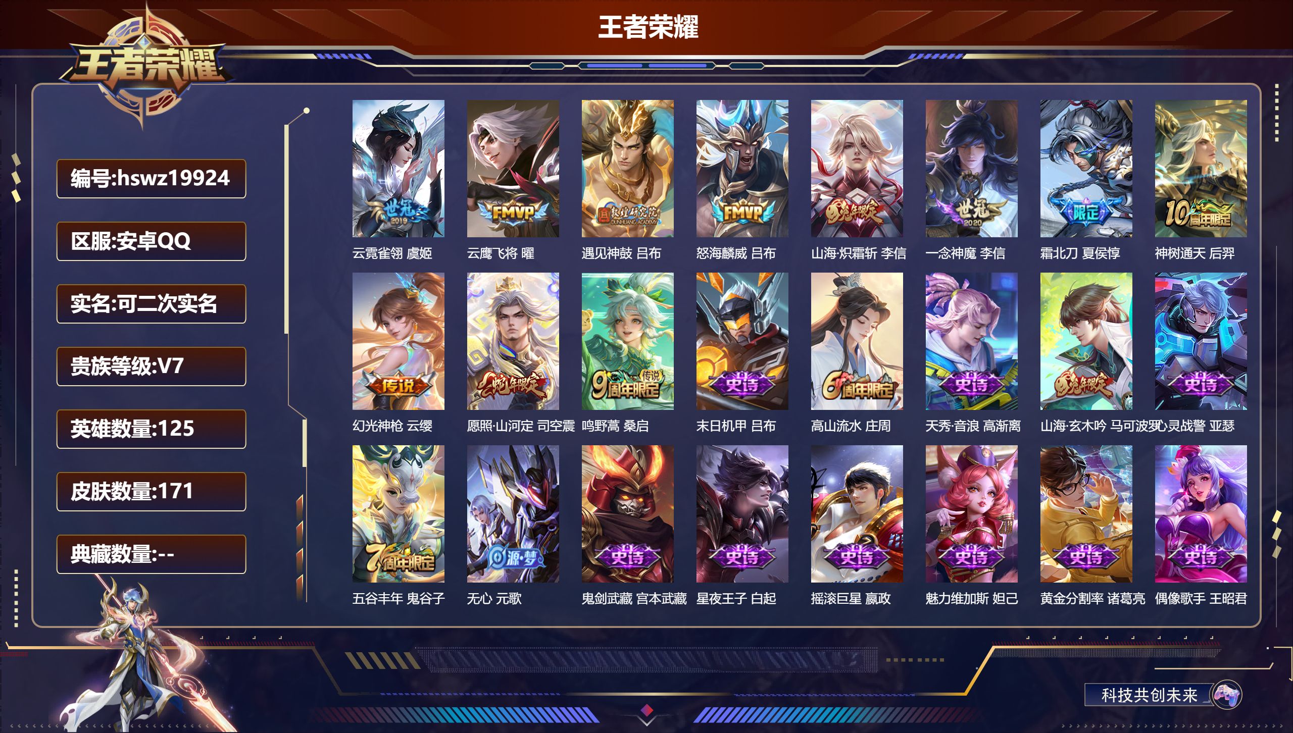 PX_2304857-Q/非凡王者/171皮肤/125英雄/0典藏/0珍品无双/0无双/0珍品传说/11传说/51史诗/7稀有英雄 【11,传说皮肤】云霓雀翎,虞姬,云鹰飞将,曜,遇见神鼓,吕布,怒海麟威,吕布,山海·炽霜斩,李信,一念神魔,李信,霜北刀,夏侯惇,神树通天,后羿,幻光神枪,云缨,愿照·山河定,司空震,鸣野蒿,桑启, 【51,史诗皮肤】末日机甲,吕布,高山流水,庄周,天秀·音浪,高渐离,山海·玄木吟,马可波罗,心灵战警,亚瑟,五谷丰年,鬼谷子,无心,元歌,鬼剑武藏,宫本武藏,星夜王子,白起,摇滚巨星,嬴政,魅力维加斯,妲己,黄金分割率,诸葛亮,偶像歌手,王昭君,赏金猎手,澜,星界游侠,暃,鹰眼统帅,狄仁杰,李小龙,裴擒虎,龙骑士,墨子,金属风暴,墨子,猫狗日记,孙策,逐浪之夏,李元芳,未来纪元,赵云,魔术师,狄仁杰,热力回旋,百里玄策,龙之律动,狂铁,顽岩魄,蒙犽,皇家上将,赵云,冰冠公主,雅典娜,撼地雄心,廉颇,破空之剑,亚连,圣诞狂欢,吕布,群星魔术团,上官婉儿,夏日便利店,蔡文姬,百相守梦,刘备,永昼,夏洛特,茶境仙,孙膑,冰雪圆舞曲,甄姬,青蛇,小乔,节奏热浪,阿轲,曙光守护者,铠,乱世虎臣,张飞,龙胆,赵云,谪仙醉月,李白,绅士熊喵,刘禅,缤纷独角兽,小乔,水果甜心,孙尚香,化蝶舞,阿轲,江河有灵,阿古朵,幽灵船长,曹操,乘风破浪,夏侯惇,暗隐猎兽者,兰陵王, 【81,勇者皮肤】爱心护理,阿轲,大漠名商,沈梦溪,缤纷绘卷,张良,大发明家,达摩,龙舞盛年,沈梦溪,海盐诗旅,桑启,幻泉雾影,海月,白色死神,白起,黑桃队长,鲁班七号,黄金武士,典韦,阴阳师,狄仁杰,古海寻踪,张良,牛运亨通,牛魔,功夫老勺,老夫子,海滩派对,项羽,红桃皇后,芈月,野性能量,吕布,哥特玫瑰,露娜,守护之力,大乔,无双福将,程咬金,潮玩探月行,猪八戒,天穹祈灯,鬼谷子,星际陆战队,程咬金,虹云星官,明世隐,救世之瞳,扁鹊,死亡骑士,亚瑟,浪漫序章,刘备,玩偶对对碰,安琪拉,掌控之力,诸葛亮,海滩丽影,钟无艳,忍·炎影,赵云,雪境奇遇,西施,万事如意,刘备,擒涛扼浪,裴擒虎,乓乓大师,鲁班大师,探海日志,鲁班大师,天使之翼,孙膑,雾都夜雨,干将莫邪,玩趣恶龙,高渐离,兔女郎,花木兰,龙腾万里,关羽,未来纪元,宫本武藏,荣光之誓,亚瑟,花好人间,甄姬,时尚教父,姜子牙,秘密基地,刘禅,教廷特使,韩信,街头霸王,韩信,云中旅人,李元芳,妄想特派,李元芳,西部大镖客,孙悟空,少女阿狸,妲己,布丁狗之约,阿古朵,暖冬·兔眠,嫦娥,绒语心约,大乔,幻想奇妙夜,王昭君,灵野札记,张良,命运角斗场,狂铁,特工战影,狂铁,虚灵犬护,钟馗,劲辣红锅,太乙真人,神迹守卫,孙悟空,剑破天穹,刘邦,铁骨偃魂,典韦,熔金海岸,周瑜,苍林狼骑,苍,天穹之誓,姜子牙,访茗客,马超,星梦巡礼,姜子牙,谧流熔炉,太乙真人,金福满堂,东皇太一,暗都幽影,大司命,夏日便利店,虞姬,鹤鸣心笺,艾琳,噬灭天穹,东皇太一,灵卦秘语,少司缘,敬我三分,盘古,怪诞之夜,米莱狄,爆裂喵拳,达摩,玫蓝誓约,戈娅,景韶洛都,明世隐, 【29,其他皮肤】潮流仙人,老夫子,三太子,哪吒,棒球奇才,沈梦溪,龙域领主,铠,花见巫女,伽罗,灼热之刃,李信,熊喵少女,阿古朵,海之征途,孙策,精灵王,后羿,海军大将,周瑜,魇语军师,司马懿,隐刃,兰陵王,霓裳曲,杨玉环,归虚梦演,鲁班大师,剑舞者,花木兰,埃及法老,杨戬,归虚梦演,西施,年年有余,猪八戒,尼罗河女神,女娲,归虚梦演,曜,威尼斯狂欢,百里玄策,幸存者,马超,绝影神枪,百里守约,孤猎,澜,踏雪寻梅,弈星,精准探案法,米莱狄,赤焰之缨,云缨,天启骑士,关羽,西部大镖客,孙悟空, 【7,稀有英雄】不知火舞,橘右京,夏洛特,娜可露露,韩信,艾琳,赵云, 营地ID:,