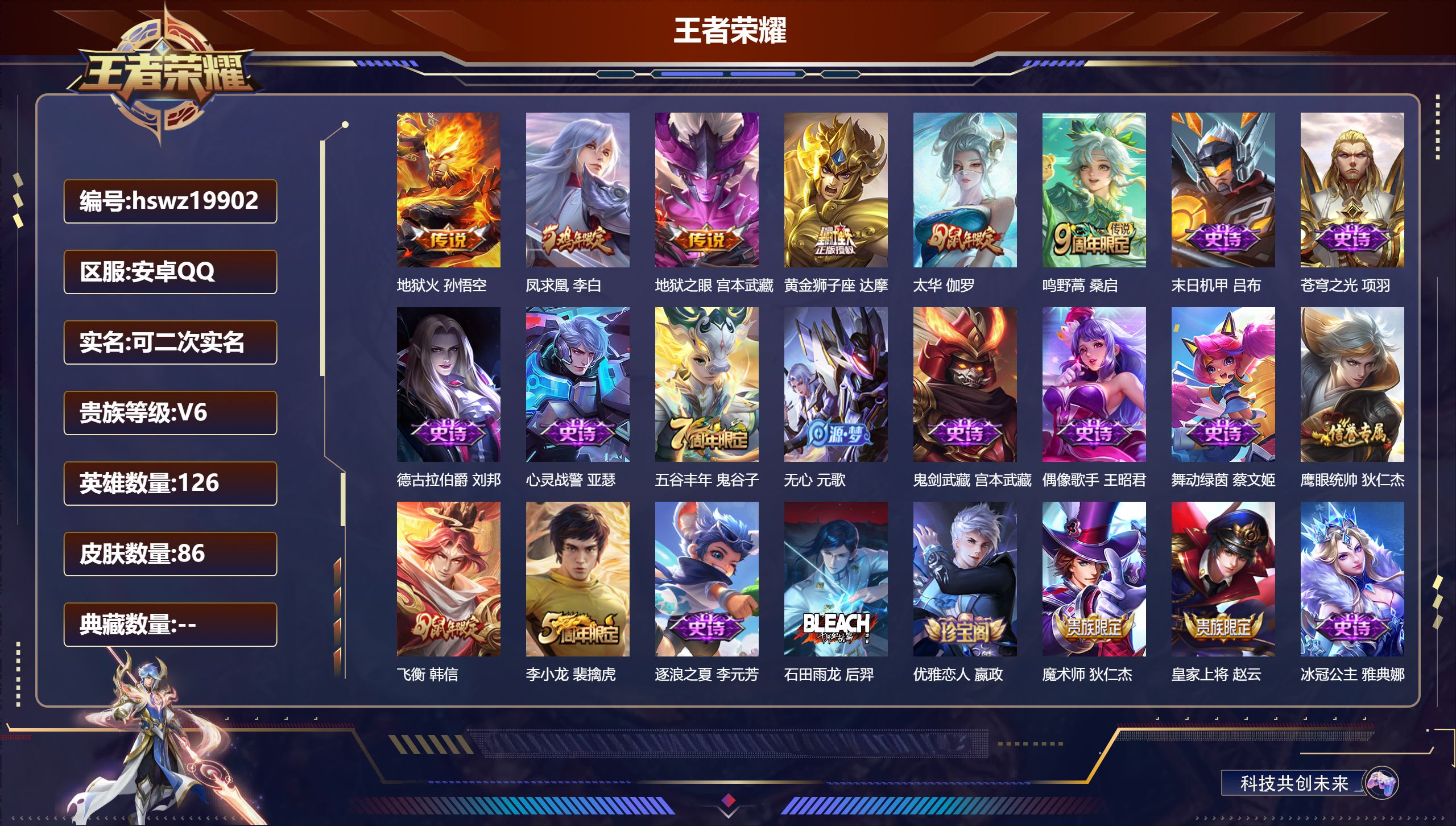 PX_2304810-Q/尊贵铂金/86皮肤/126英雄/0典藏/0珍品无双/0无双/0珍品传说/6传说/25史诗/8稀有英雄 【6,传说皮肤】地狱火,孙悟空,凤求凰,李白,地狱之眼,宫本武藏,黄金狮子座,达摩,太华,伽罗,鸣野蒿,桑启, 【25,史诗皮肤】末日机甲,吕布,苍穹之光,项羽,德古拉伯爵,刘邦,心灵战警,亚瑟,五谷丰年,鬼谷子,无心,元歌,鬼剑武藏,宫本武藏,偶像歌手,王昭君,舞动绿茵,蔡文姬,鹰眼统帅,狄仁杰,飞衡,韩信,李小龙,裴擒虎,逐浪之夏,李元芳,石田雨龙,后羿,优雅恋人,嬴政,魔术师,狄仁杰,皇家上将,赵云,冰冠公主,雅典娜,功夫厨神,程咬金,青焰无极,镜,节奏热浪,阿轲,心灵骇客,安琪拉,绅士熊喵,刘禅,水果甜心,孙尚香,幽灵船长,曹操, 【48,勇者皮肤】沙漠行僧,达摩,大漠名商,沈梦溪,拳王,达摩,龙舞盛年,沈梦溪,沉稳之力,孙尚香,海盐诗旅,桑启,幻泉雾影,海月,朔风刀,夏侯惇,醍醐杖,老夫子,汉昭烈帝,刘备,阴阳师,狄仁杰,牛运亨通,牛魔,海滩派对,项羽,西部游侠,莱西奥,野性能量,吕布,潮玩探月行,猪八戒,死亡骑士,亚瑟,幽兰居士,张良,忍·炎影,赵云,逐霄战戟,吕布,乓乓大师,鲁班大师,探海日志,鲁班大师,雾都夜雨,干将莫邪,兔女郎,花木兰,龙腾万里,关羽,金庭之子,兰陵王,千军破阵,苏烈,花好人间,甄姬,潮玩造梦师,刘备,教廷特使,韩信,云中旅人,李元芳,少女阿狸,妲己,混沌棋,弈星,命运加冕,露娜,幻想奇妙夜,王昭君,劲辣红锅,太乙真人,剑破天穹,刘邦,异域游侠,刘备,苍威无极,项羽,熔金海岸,周瑜,天穹之誓,姜子牙,长夏之忆,貂蝉,破阵·退雄兵,杨戬,群星魔术团,程咬金,经纬探寻者,盘古,暗都幽影,大司命,鹤鸣心笺,艾琳,噬灭天穹,东皇太一, 【7,其他皮肤】灼热之刃,李信,精灵王,后羿,归虚梦演,蒙犽,激情绿茵,马可波罗,归虚梦演,曜,威尼斯狂欢,百里玄策,地府判官,钟馗, 【8,稀有英雄】嬴政,不知火舞,橘右京,夏洛特,娜可露露,韩信,艾琳,赵云, 营地ID:,