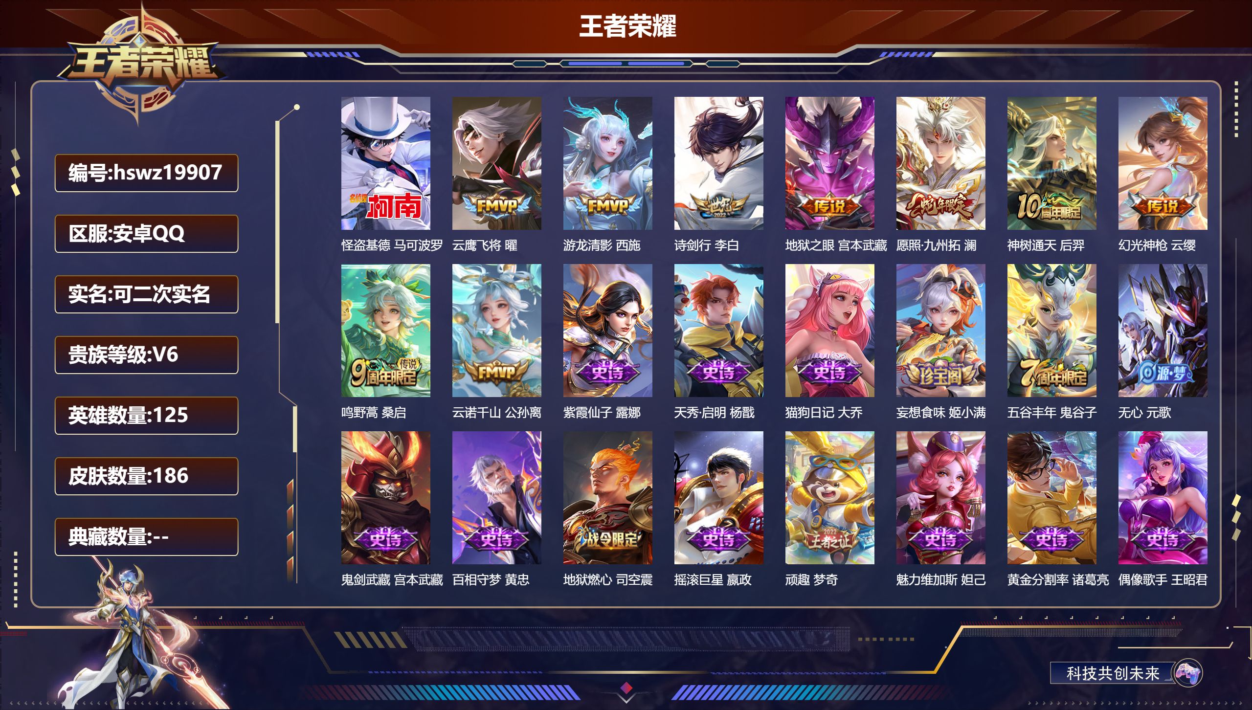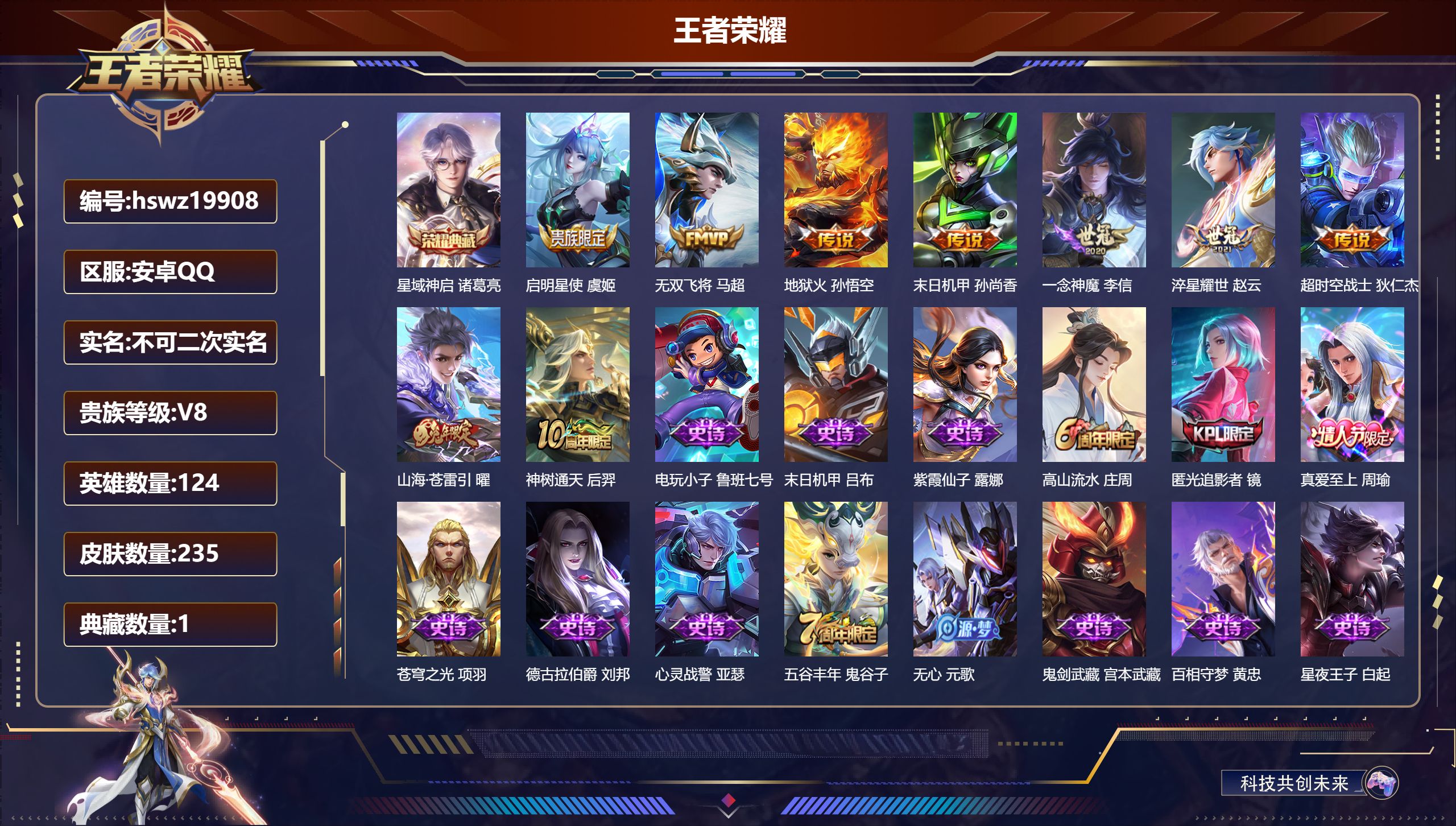 PX_2304820-Q/荣耀王者/235皮肤/124英雄/1典藏/0珍品无双/0无双/0珍品传说/9传说/59史诗/8稀有英雄 【1,典藏皮肤】星域神启,诸葛亮, 【9,传说皮肤】启明星使,虞姬,无双飞将,马超,地狱火,孙悟空,末日机甲,孙尚香,一念神魔,李信,淬星耀世,赵云,超时空战士,狄仁杰,山海·苍雷引,曜,神树通天,后羿, 【59,史诗皮肤】电玩小子,鲁班七号,末日机甲,吕布,紫霞仙子,露娜,高山流水,庄周,匿光追影者,镜,真爱至上,周瑜,苍穹之光,项羽,德古拉伯爵,刘邦,心灵战警,亚瑟,五谷丰年,鬼谷子,无心,元歌,鬼剑武藏,宫本武藏,百相守梦,黄忠,星夜王子,白起,遇见飞天,杨玉环,摇滚巨星,嬴政,顽趣,梦奇,魅力维加斯,妲己,黄金分割率,诸葛亮,荣光圣徽,蒙恬,鹰眼统帅,狄仁杰,孙行者,孙悟空,龙骑士,墨子,金属风暴,墨子,傲雪梅枪,韩信,特工魅影,百里守约,猫狗日记,孙策,原初追逐者,百里玄策,逐浪之夏,李元芳,未来纪元,赵云,灵蛊蚀心,扁鹊,黎明之约,雅典娜,魔术师,狄仁杰,皇家上将,赵云,冰冠公主,雅典娜,辉光之辰,后羿,功夫厨神,程咬金,梁祝,上官婉儿,圣诞恋歌,貂蝉,云间偶戏,元歌,水晶猎龙者,花木兰,圣诞狂欢,吕布,星界战将,牛魔,火炮绅士,黄忠,千年之狐,李白,节奏热浪,阿轲,曙光守护者,铠,万灵启世,女娲,心灵骇客,安琪拉,箭羽风息,伽罗,乱世虎臣,张飞,绅士熊喵,刘禅,星界特工,马可波罗,百相守梦,百里守约,水果甜心,孙尚香,江河有灵,阿古朵,幽灵船长,曹操,乘风破浪,夏侯惇,暗隐猎兽者,兰陵王, 【103,勇者皮肤】胡桃夹子,干将莫邪,圆桌骑士,盾山,烛龙,曹操,爱心护理,阿轲,沙漠行僧,达摩,大漠名商,沈梦溪,缤纷绘卷,张良,纽约教父,刘备,拳王,达摩,龙舞盛年,沈梦溪,丁香结,小乔,功夫炙烤,廉颇,幻夜卜梦,芈月,海盐诗旅,桑启,朔风刀,夏侯惇,醍醐杖,老夫子,归虚梦演,孙膑,汉昭烈帝,刘备,白色死神,白起,黄金武士,典韦,御旌,牛魔,阴阳师,狄仁杰,致命风华,阿轲,次元突破,哪吒,古海寻踪,张良,功夫老勺,老夫子,鲨炮海盗猫,沈梦溪,海滩派对,项羽,完美运算,后羿,万华元夜,狄仁杰,红桃皇后,芈月,西部游侠,莱西奥,哥特玫瑰,露娜,无双福将,程咬金,潮玩探月行,猪八戒,天穹祈灯,鬼谷子,疑决卦,明世隐,化身博士,扁鹊,星际陆战队,程咬金,幻乐之宴,鬼谷子,霸王丸,宫本武藏,虹云星官,明世隐,死亡骑士,亚瑟,敏锐之力,李白,玩偶对对碰,安琪拉,掌控之力,诸葛亮,海滩丽影,钟无艳,狰,白起,雪境奇遇,西施,重明,芈月,炽热元素使,姜子牙,坚韧之力,苏烈,唤灵魔甲,刘禅,万事如意,刘备,擒涛扼浪,裴擒虎,乓乓大师,鲁班大师,探海日志,鲁班大师,天使之翼,孙膑,玩趣恶龙,高渐离,兔女郎,花木兰,龙腾万里,关羽,金庭之子,兰陵王,未来纪元,宫本武藏,千军破阵,苏烈,荣光之誓,亚瑟,花好人间,甄姬,万象初新,宫本武藏,聚星闪耀,钟无艳,御銮,盾山,时尚教父,姜子牙,春野之旅,钟无艳,秘密基地,刘禅,穷奇,典韦,教廷特使,韩信,街头霸王,韩信,云中旅人,李元芳,妄想特派,李元芳,西部大镖客,孙悟空,少女阿狸,妲己,混沌棋,弈星,御霄,米莱狄,蔚蓝守将,蒙恬,驱傩正仪,钟馗,命运角斗场,狂铁,特工战影,狂铁,御狮,狂铁,漠中幻影,嫦娥,白执事,赵云,饕餮,太乙真人,劲辣红锅,太乙真人,剑破天穹,刘邦,铁骨偃魂,典韦,熔金海岸,周瑜,苍林狼骑,苍,魅影绮裳,影,星梦巡礼,姜子牙,谧流熔炉,太乙真人,群星魔术团,程咬金,鹤鸣心笺,艾琳,百相守梦,老夫子,噬灭天穹,东皇太一,玫蓝誓约,戈娅,景韶洛都,明世隐, 【64,其他皮肤】伊势巫女,大乔,金属狂潮,高渐离,前尘,金蝉,圣殿之光,刘邦,芝加哥教父,黄忠,潮流仙人,老夫子,三太子,哪吒,棒球奇才,沈梦溪,龙域领主,铠,生化警戒,钟无艳,超能战警,曹操,爱与和平,苏烈,第七人偶,干将莫邪,灼热之刃,李信,木偶奇遇记,鲁班七号,福禄兄弟,鲁班七号,帝国元帅,项羽,精灵王,后羿,绯红之刃,露娜,冰刃幻境,镜,碧珀绯影,暃,海军大将,周瑜,魇语军师,司马懿,午夜歌剧院,元歌,隐刃,兰陵王,霓裳曲,杨玉环,花间舞,公孙离,异域舞娘,貂蝉,街头旋风,裴擒虎,东海龙王,东皇太一,修竹墨客,上官婉儿,剑舞者,花木兰,范海辛,李白,维京掠夺者,苍,激情绿茵,马可波罗,埃及法老,杨戬,归虚梦演,西施,阿摩司公爵,鬼谷子,画中游,桑启,年年有余,猪八戒,尼罗河女神,女娲,锦衣卫,狄仁杰,一千零一夜,张良,归虚梦演,曜,威尼斯狂欢,百里玄策,幸存者,马超,战争女神,雅典娜,荷鲁斯之眼,云中君,创世神祝,盘古,特种部队,李元芳,绝影神枪,百里守约,蔷薇王座,蔡文姬,森,瑶,孤猎,澜,加勒比小姐,虞姬,精准探案法,米莱狄,精灵公主,王昭君,赤焰之缨,云缨,露花倒影,嫦娥,地府判官,钟馗,美梦成真,梦奇,天启骑士,关羽,圆桌骑士,太乙真人,西部大镖客,孙悟空, 【8,稀有英雄】敖隐,不知火舞,橘右京,夏洛特,娜可露露,韩信,艾琳,赵云, 营地ID:,