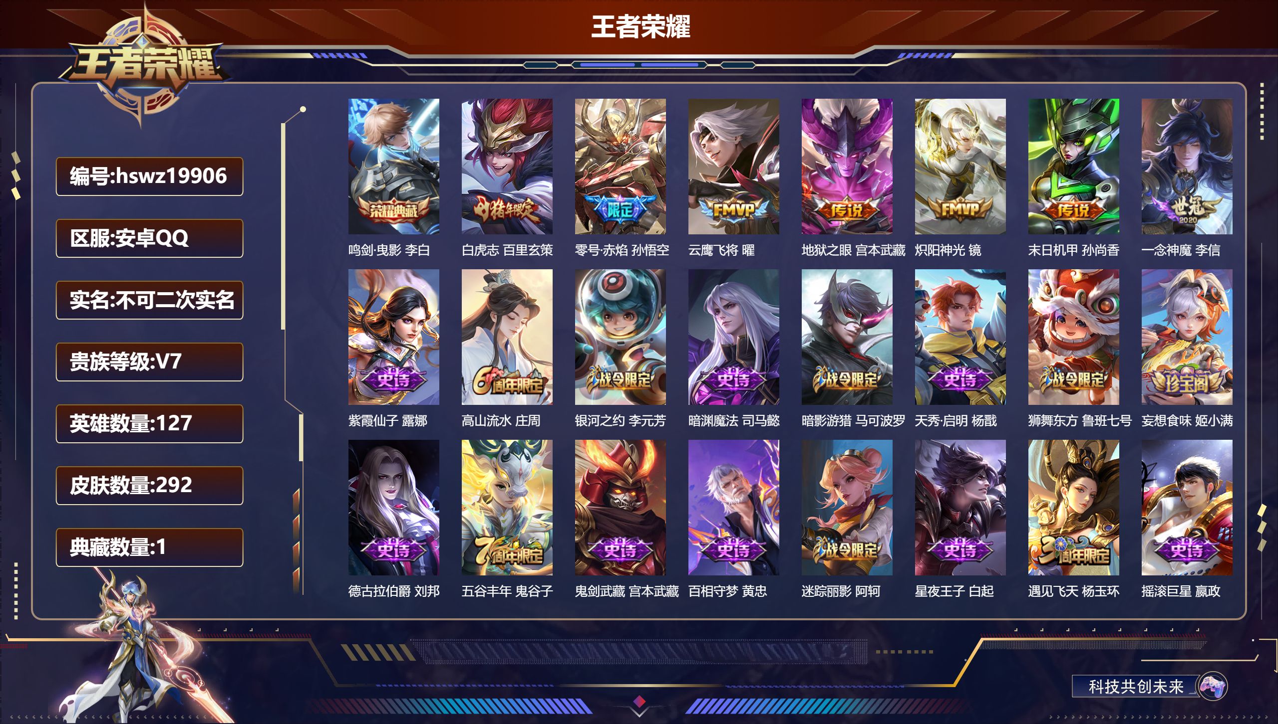 PX_2304819-Q/无双王者/292皮肤/127英雄/1典藏/0珍品无双/0无双/0珍品传说/7传说/82史诗/9稀有英雄 【1,典藏皮肤】鸣剑·曳影,李白, 【7,传说皮肤】白虎志,百里玄策,零号·赤焰,孙悟空,云鹰飞将,曜,地狱之眼,宫本武藏,炽阳神光,镜,末日机甲,孙尚香,一念神魔,李信, 【82,史诗皮肤】紫霞仙子,露娜,高山流水,庄周,银河之约,李元芳,暗渊魔法,司马懿,暗影游猎,马可波罗,天秀·启明,杨戬,狮舞东方,鲁班七号,妄想食味,姬小满,德古拉伯爵,刘邦,五谷丰年,鬼谷子,鬼剑武藏,宫本武藏,百相守梦,黄忠,迷踪丽影,阿轲,星夜王子,白起,遇见飞天,杨玉环,摇滚巨星,嬴政,顽趣,梦奇,修罗,橘右京,拒霜思,嫦娥,魅力维加斯,妲己,黄金分割率,诸葛亮,偶像歌手,王昭君,荣光圣徽,蒙恬,女仆咖啡,妲己,赏金猎手,澜,晚萤,娜可露露,舞动绿茵,蔡文姬,繁星吟游,蔡文姬,暗夜贵公子,嬴政,鹰眼统帅,狄仁杰,胡桃异想国,米莱狄,飞衡,韩信,李小龙,裴擒虎,纤云弄巧,云中君,驯魔猎人,兰陵王,龙骑士,墨子,金属风暴,墨子,特工魅影,百里守约,猫狗日记,孙策,原初追逐者,百里玄策,逐浪之夏,李元芳,未来纪元,赵云,黎明之约,雅典娜,优雅恋人,嬴政,魔术师,狄仁杰,热力回旋,百里玄策,龙之律动,狂铁,神威,马超,皇家上将,赵云,冰冠公主,雅典娜,至尊宝,孙悟空,功夫厨神,程咬金,梁祝,上官婉儿,电玩·爆裂旋风,刘禅,天才门将,刘禅,圣诞恋歌,貂蝉,云间偶戏,元歌,水晶猎龙者,花木兰,涂山容容,公孙离,御风骁将,吕布,圣诞狂欢,吕布,天狼绘梦者,上官婉儿,星界战将,牛魔,天狼溯光者,伽罗,地狱岩魂,廉颇,冰雪圆舞曲,甄姬,航海奇遇记,老夫子,千年之狐,李白,游园惊梦,甄姬,万灵启世,女娲,心灵骇客,安琪拉,乱世虎臣,张飞,龙胆,赵云,缤纷独角兽,小乔,蓝屏警告,典韦,真爱魔法,干将莫邪,水果甜心,孙尚香,狂想玩偶喵,蒙犽,江河有灵,阿古朵,幽灵船长,曹操,乘风破浪,夏侯惇,暗隐猎兽者,兰陵王, 【148,勇者皮肤】时空谍影,海诺,圆桌骑士,盾山,爱心护理,阿轲,星际陆战队,达摩,沙漠行僧,达摩,大漠名商,沈梦溪,缤纷绘卷,张良,纽约教父,刘备,拳王,达摩,大发明家,达摩,龙舞盛年,沈梦溪,乐园追猎者,白起,丁香结,小乔,功夫炙烤,廉颇,铁甲之心,典韦,沉稳之力,孙尚香,爱与正义,程咬金,海盐诗旅,桑启,幻泉雾影,海月,朔风刀,夏侯惇,醍醐杖,老夫子,朔望之晖,女娲,归虚梦演,孙膑,汉昭烈帝,刘备,白色死神,白起,黑桃队长,鲁班七号,黄金武士,典韦,夺宝奇兵,刘邦,御旌,牛魔,阴阳师,狄仁杰,径山谋武,孙权,次元突破,哪吒,古海寻踪,张良,牛运亨通,牛魔,科学大爆炸,项羽,功夫老勺,老夫子,西部大镖客,牛魔,鲨炮海盗猫,沈梦溪,虎啸剑宗,刘邦,海滩派对,项羽,万华元夜,狄仁杰,无尽征程,廉颇,克喵,鬼谷子,制霸全明星,牛魔,踏浪烽翎,莱西奥,演武夺筹,程咬金,红桃皇后,芈月,奇妙博物学,庄周,西部游侠,莱西奥,野性能量,吕布,哥特玫瑰,露娜,守护之力,大乔,无双福将,程咬金,瓷语鉴心,露娜,原初探秘者,鬼谷子,星空之诺,沈梦溪,潮玩探月行,猪八戒,天穹祈灯,鬼谷子,西部大镖客,猪八戒,疑决卦,明世隐,如懿,安琪拉,化身博士,扁鹊,潮玩骑士王,亚瑟,阿尔法小队,后羿,五福同心,张飞,次元傲视,杨戬,星际陆战队,程咬金,幻乐之宴,鬼谷子,霸王丸,宫本武藏,虹云星官,明世隐,潮玩牛仔,马可波罗,救世之瞳,扁鹊,赤莲之焰,周瑜,死亡骑士,亚瑟,敏锐之力,李白,幽兰居士,张良,玩偶对对碰,安琪拉,掌控之力,诸葛亮,海滩丽影,钟无艳,圣弓游侠,后羿,落日弦歌,高渐离,忍·炎影,赵云,重明,芈月,炽热元素使,姜子牙,坚韧之力,苏烈,万事如意,刘备,擒涛扼浪,裴擒虎,乓乓大师,鲁班大师,探海日志,鲁班大师,天使之翼,孙膑,玩趣恶龙,高渐离,兔女郎,花木兰,龙腾万里,关羽,金庭之子,兰陵王,未来纪元,宫本武藏,罗小黑战记,哪吒,千军破阵,苏烈,零食大作战,姬小满,荣光之誓,亚瑟,花好人间,甄姬,万象初新,宫本武藏,聚星闪耀,钟无艳,御銮,盾山,单词大作战,雅典娜,时尚教父,姜子牙,秘密基地,刘禅,穷奇,典韦,教廷特使,韩信,街头霸王,韩信,云中旅人,李元芳,西部大镖客,孙悟空,紫罗兰之誓,妲己,神迹守卫,墨子,重装意志,盘古,少女阿狸,妲己,混沌棋,弈星,御霄,米莱狄,蔚蓝守将,蒙恬,春野闲踪,苏烈,契约魔法,米莱狄,布丁狗之约,阿古朵,命运加冕,露娜,小满鸭,姬小满,幻想奇妙夜,王昭君,灵野札记,张良,驱傩正仪,钟馗,神迹守卫,钟馗,死霸装,白起,特工战影,狂铁,虚灵犬护,钟馗,御狮,狂铁,白执事,赵云,华丽摇滚,太乙真人,劲辣红锅,太乙真人,剑破天穹,刘邦,铁骨偃魂,典韦,熔金海岸,周瑜,苍林狼骑,苍,星梦巡礼,姜子牙,破阵·退雄兵,杨戬,谧流熔炉,太乙真人,群星魔术团,程咬金,暗都幽影,大司命,鹤鸣心笺,艾琳,锦麟游梦,庄周,云械蓝图,云中君,逆浪荇歌,甄姬,玫蓝誓约,戈娅, 【54,其他皮肤】金属狂潮,高渐离,前尘,金蝉,圣殿之光,刘邦,芝加哥教父,黄忠,潮流仙人,老夫子,极冰防御线,盾山,龙域领主,铠,超能战警,曹操,花见巫女,伽罗,爱与和平,苏烈,灼热之刃,李信,木偶奇遇记,鲁班七号,福禄兄弟,鲁班七号,精灵王,后羿,绯红之刃,露娜,冰刃幻境,镜,碧珀绯影,暃,海军大将,周瑜,魇语军师,司马懿,英喵野望,刘禅,启蛰,司空震,霓裳曲,杨玉环,花间舞,公孙离,异域舞娘,貂蝉,街头旋风,裴擒虎,修竹墨客,上官婉儿,维京掠夺者,苍,占星师,明世隐,激情绿茵,马可波罗,埃及法老,杨戬,归虚梦演,西施,阿摩司公爵,鬼谷子