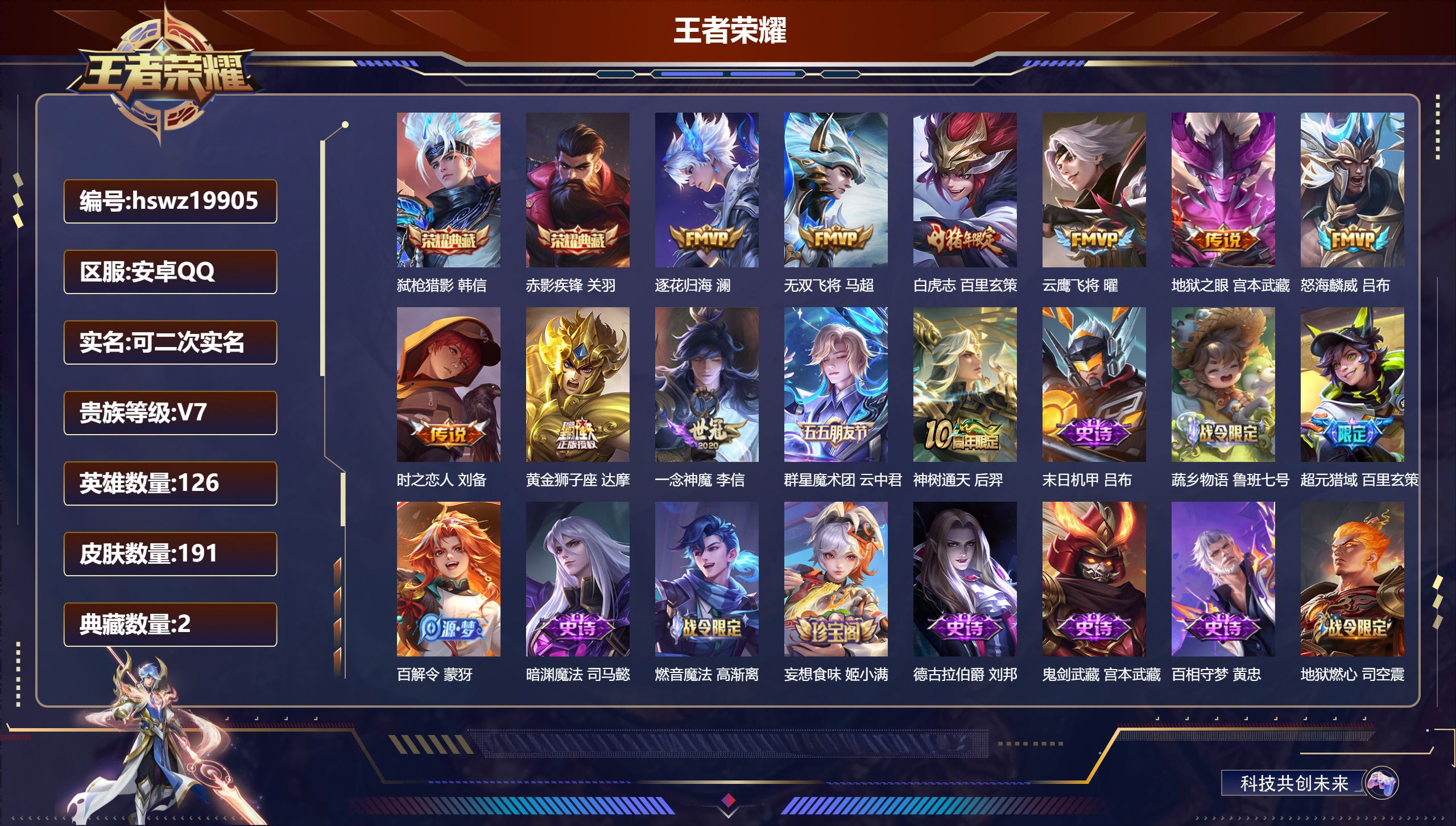 PX_2304814-Q/荣耀王者/191皮肤/126英雄/2典藏/0珍品无双/0无双/0珍品传说/11传说/57史诗/8稀有英雄 【2,典藏皮肤】弑枪猎影,韩信,赤影疾锋,关羽, 【11,传说皮肤】逐花归海,澜,无双飞将,马超,白虎志,百里玄策,云鹰飞将,曜,地狱之眼,宫本武藏,怒海麟威,吕布,时之恋人,刘备,黄金狮子座,达摩,一念神魔,李信,群星魔术团,云中君,神树通天,后羿, 【57,史诗皮肤】末日机甲,吕布,蔬乡物语,鲁班七号,超元猎域,百里玄策,百解令,蒙犽,暗渊魔法,司马懿,燃音魔法,高渐离,妄想食味,姬小满,德古拉伯爵,刘邦,鬼剑武藏,宫本武藏,百相守梦,黄忠,地狱燃心,司空震,拒霜思,嫦娥,魅力维加斯,妲己,黄金分割率,诸葛亮,猪悟能,猪八戒,舞动绿茵,蔡文姬,暗夜贵公子,嬴政,鹰眼统帅,狄仁杰,孙行者,孙悟空,李小龙,裴擒虎,纤云弄巧,云中君,金属风暴,墨子,猫狗日记,孙策,原初追逐者,百里玄策,驭风魔法,戈娅,魔术师,狄仁杰,龙之律动,狂铁,皇家上将,赵云,冰冠公主,雅典娜,功夫厨神,程咬金,梁祝,上官婉儿,云间偶戏,元歌,水晶猎龙者,花木兰,涂山容容,公孙离,决胜骁骑,关羽,心动手记,海诺,怒海争锋,黄忠,青焰无极,镜,群星魔术团,上官婉儿,浮光幕影,芈月,罗小黑战记,百里玄策,夏日便利店,蔡文姬,星界战将,牛魔,地狱岩魂,廉颇,冰雪圆舞曲,甄姬,月团寄思,沈梦溪,千年之狐,李白,暗夜猫娘,阿轲,织梦人,西施,曙光守护者,铠,百相守梦,周瑜,蓝屏警告,典韦,水果甜心,孙尚香,江河有灵,阿古朵,幽灵船长,曹操,乘风破浪,夏侯惇,暗隐猎兽者,兰陵王, 【90,勇者皮肤】时空谍影,海诺,玲珑珍味,西施,沙漠行僧,达摩,暖冬絮语,程咬金,缤纷绘卷,张良,纽约教父,刘备,大发明家,达摩,沉稳之力,孙尚香,海盐诗旅,桑启,汉昭烈帝,刘备,热血海滩,哪吒,白色死神,白起,黄金武士,典韦,王牌新星,海月,阴阳师,狄仁杰,次元突破,哪吒,古海寻踪,张良,功夫老勺,老夫子,西部大镖客,牛魔,鲨炮海盗猫,沈梦溪,海滩派对,项羽,完美运算,后羿,克喵,鬼谷子,踏浪烽翎,莱西奥,红桃皇后,芈月,野性能量,吕布,守护之力,大乔,瓷语鉴心,露娜,潮玩探月行,猪八戒,鸿运当头,亚瑟,天穹祈灯,鬼谷子,决胜大满贯,曹操,阿尔法小队,后羿,五福同心,张飞,夜都怪侠,白起,金色潮汐,朵莉亚,虹云星官,明世隐,死亡骑士,亚瑟,破局者,亚连,幽兰居士,张良,玩偶对对碰,安琪拉,忍·炎影,赵云,炽热元素使,姜子牙,擒涛扼浪,裴擒虎,乓乓大师,鲁班大师,探海日志,鲁班大师,天使之翼,孙膑,兔女郎,花木兰,龙腾万里,关羽,流音漫舞,艾琳,金庭之子,兰陵王,幻夜行动,兰陵王,未来纪元,宫本武藏,罗小黑战记,哪吒,千军破阵,苏烈,荣光之誓,亚瑟,花好人间,甄姬,聚星闪耀,钟无艳,时尚教父,姜子牙,秘密基地,刘禅,教廷特使,韩信,街头霸王,韩信,云中旅人,李元芳,妄想特派,李元芳,西部大镖客,孙悟空,进击墨子号,墨子,蔬乡物语,李元芳,少女阿狸,妲己,灵卜魔法,妲己,蔚蓝守将,蒙恬,春野闲踪,苏烈,幻想奇妙夜,王昭君,驱傩正仪,钟馗,命运角斗场,狂铁,特工战影,狂铁,劲辣红锅,太乙真人,剑破天穹,刘邦,苍威无极,项羽,熔金海岸,周瑜,天穹之誓,姜子牙,长夏之忆,貂蝉,破阵·退雄兵,杨戬,群星魔术团,程咬金,夏日便利店,虞姬,鹤鸣心笺,艾琳,云械蓝图,云中君,逆浪荇歌,甄姬,百相守梦,孙策,噬灭天穹,东皇太一,敬我三分,盘古, 【33,其他皮肤】潮流仙人,老夫子,爱与和平,苏烈,未来旅行,孙膑,灼热之刃,李信,木偶奇遇记,鲁班七号,精灵王,后羿,绯红之刃,露娜,魇语军师,司马懿,英喵野望,刘禅,午夜歌剧院,元歌,启蛰,司空震,街头旋风,裴擒虎,东海龙王,东皇太一,范海辛,李白,维京掠夺者,苍,占星师,明世隐,激情绿茵,马可波罗,埃及法老,杨戬,尼罗河女神,女娲,锦衣卫,狄仁杰,威尼斯狂欢,百里玄策,决胜骁骑,关羽,荷鲁斯之眼,云中君,创世神祝,盘古,绝影神枪,百里守约,蔷薇王座,蔡文姬,孤猎,澜,秩序猎龙将,蒙恬,精准探案法,米莱狄,赤焰之缨,云缨,地府判官,钟馗,圆桌骑士,太乙真人,西部大镖客,孙悟空, 【8,稀有英雄】嬴政,不知火舞,橘右京,夏洛特,娜可露露,韩信,艾琳,赵云, 营地ID:,,