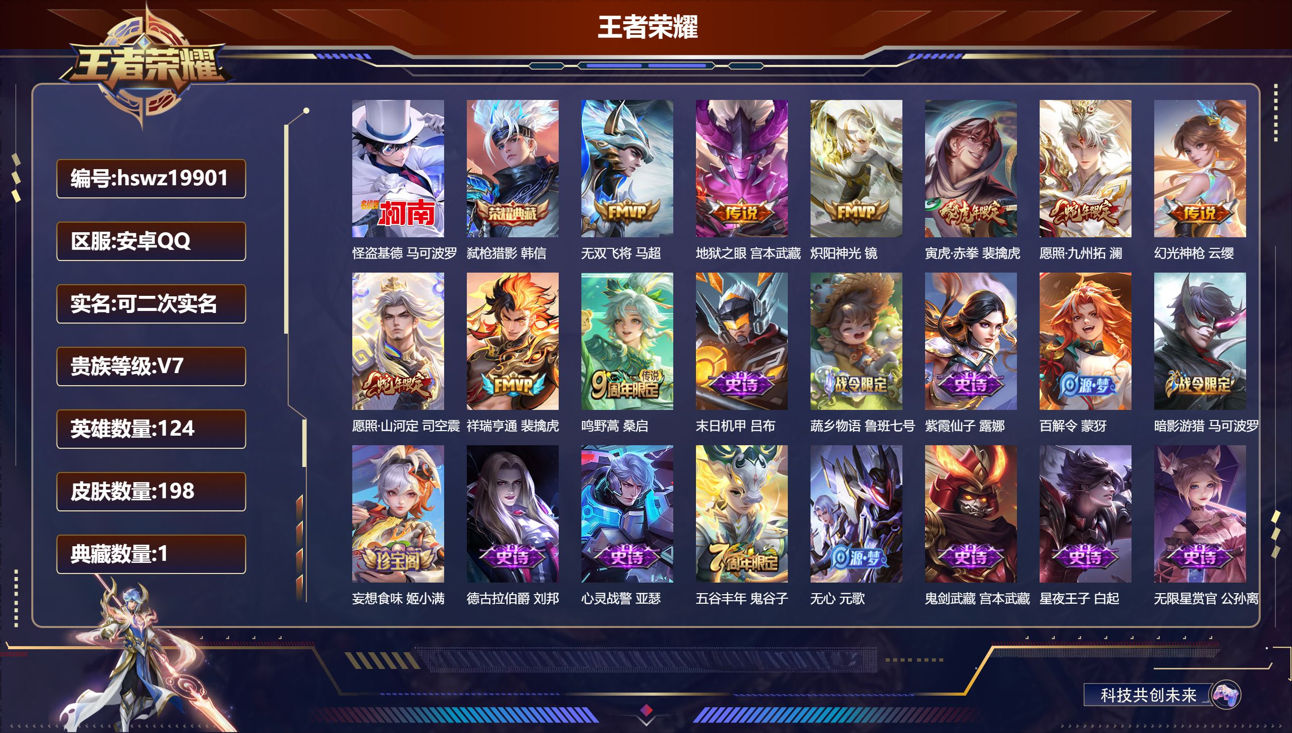 PX_2304808-Q/最强王者/198皮肤/124英雄/1典藏/0珍品无双/0无双/1珍品传说/9传说/61史诗/8稀有英雄 【1,珍品传说】怪盗基德,马可波罗, 【1,典藏皮肤】弑枪猎影,韩信, 【9,传说皮肤】无双飞将,马超,地狱之眼,宫本武藏,炽阳神光,镜,寅虎·赤拳,裴擒虎,愿照·九州拓,澜,幻光神枪,云缨,愿照·山河定,司空震,祥瑞亨通,裴擒虎,鸣野蒿,桑启, 【61,史诗皮肤】末日机甲,吕布,蔬乡物语,鲁班七号,紫霞仙子,露娜,百解令,蒙犽,暗影游猎,马可波罗,妄想食味,姬小满,德古拉伯爵,刘邦,心灵战警,亚瑟,五谷丰年,鬼谷子,无心,元歌,鬼剑武藏,宫本武藏,星夜王子,白起,无限星赏官,公孙离,地狱燃心,司空震,顽趣,梦奇,魅力维加斯,妲己,黄金分割率,诸葛亮,荣光圣徽,蒙恬,白蛇,大乔,赏金猎手,澜,星界游侠,暃,晚萤,娜可露露,鹰眼统帅,狄仁杰,孙行者,孙悟空,李小龙,裴擒虎,金属风暴,墨子,特工魅影,百里守约,猫狗日记,孙策,原初追逐者,百里玄策,逐浪之夏,李元芳,未来纪元,赵云,黎明之约,雅典娜,驭风魔法,戈娅,魔术师,狄仁杰,埋骨钱,暃,顽岩魄,蒙犽,皇家上将,赵云,梁祝,上官婉儿,电玩·爆裂旋风,刘禅,天才门将,刘禅,圣诞恋歌,貂蝉,水晶猎龙者,花木兰,破空之剑,亚连,怒海争锋,黄忠,青焰无极,镜,魅语,不知火舞,器灵·浮梦炉,赵怀真,星界战将,牛魔,地狱岩魂,廉颇,冰雪圆舞曲,甄姬,月团寄思,沈梦溪,千年之狐,李白,节奏热浪,阿轲,曙光守护者,铠,箭羽风息,伽罗,缤纷独角兽,小乔,水果甜心,孙尚香,化蝶舞,阿轲,江河有灵,阿古朵,乘风破浪,夏侯惇,暗隐猎兽者,兰陵王, 【85,勇者皮肤】时空谍影,海诺,玲珑珍味,西施,圆桌骑士,盾山,太极少年,赵怀真,沙漠行僧,达摩,大漠名商,沈梦溪,缤纷绘卷,张良,拳王,达摩,龙舞盛年,沈梦溪,乐园追猎者,白起,丁香结,小乔,功夫炙烤,廉颇,沉稳之力,孙尚香,海盐诗旅,桑启,幻泉雾影,海月,归虚梦演,孙膑,热血海滩,哪吒,黄金武士,典韦,王牌新星,海月,阴阳师,狄仁杰,古海寻踪,张良,功夫老勺,老夫子,西部大镖客,牛魔,鲤鱼之梦,庄周,海滩派对,项羽,完美运算,后羿,哥特玫瑰,露娜,守护之力,大乔,瓷语鉴心,露娜,潮玩探月行,猪八戒,鸿运当头,亚瑟,天穹祈灯,鬼谷子,决胜大满贯,曹操,化身博士,扁鹊,无尽旅途,扁鹊,五福同心,张飞,幻乐之宴,鬼谷子,东方不败,武则天,救世之瞳,扁鹊,死亡骑士,亚瑟,浪漫序章,刘备,危途狂花,戈娅,胡桃狂想曲,蒙犽,破局者,亚连,玩偶对对碰,安琪拉,雪境奇遇,西施,炽热元素使,姜子牙,唤灵魔甲,刘禅,逐霄战戟,吕布,擒涛扼浪,裴擒虎,乓乓大师,鲁班大师,探海日志,鲁班大师,雾都夜雨,干将莫邪,兔女郎,花木兰,龙腾万里,关羽,流音漫舞,艾琳,未来纪元,宫本武藏,聚星闪耀,钟无艳,潮玩造梦师,刘备,街头霸王,韩信,云中旅人,李元芳,妄想特派,李元芳,蔬乡物语,李元芳,蔚蓝守将,蒙恬,暖冬·兔眠,嫦娥,幻想奇妙夜,王昭君,特工战影,狂铁,劲辣红锅,太乙真人,神迹守卫,孙悟空,剑破天穹,刘邦,异域游侠,刘备,苍威无极,项羽,铁骨偃魂,典韦,熔金海岸,周瑜,苍林狼骑,苍,天穹之誓,姜子牙,魅影绮裳,影,谧流熔炉,太乙真人,群星魔术团,程咬金,经纬探寻者,盘古,暗都幽影,大司命,噬灭天穹,东皇太一,敬我三分,盘古,玫蓝誓约,戈娅,景韶洛都,明世隐, 【41,其他皮肤】芝加哥教父,黄忠,极冰防御线,盾山,第七人偶,干将莫邪,灼热之刃,李信,熊喵少女,阿古朵,绯红之刃,露娜,冰刃幻境,镜,碧珀绯影,暃,星航指挥官,诸葛亮,魇语军师,司马懿,午夜歌剧院,元歌,启蛰,司空震,霓裳曲,杨玉环,花间舞,公孙离,异域舞娘,貂蝉,街头旋风,裴擒虎,东海龙王,东皇太一,修竹墨客,上官婉儿,维京掠夺者,苍,占星师,明世隐,归虚梦演,蒙犽,激情绿茵,马可波罗,阿摩司公爵,鬼谷子,画中游,桑启,年年有余,猪八戒,天堂福音,张良,锦衣卫,狄仁杰,一千零一夜,张良,归虚梦演,曜,华尔街大亨,程咬金,幸存者,马超,荷鲁斯之眼,云中君,绝影神枪,百里守约,蔷薇王座,蔡文姬,孤猎,澜,踏雪寻梅,弈星,秩序猎龙将,蒙恬,赤焰之缨,云缨,地府判官,钟馗,圆桌骑士,太乙真人,怪盗基德,马可波罗, 【8,稀有英雄】敖隐,不知火舞,橘右京,夏洛特,娜可露露,韩信,艾琳,赵云, 营地ID:,,