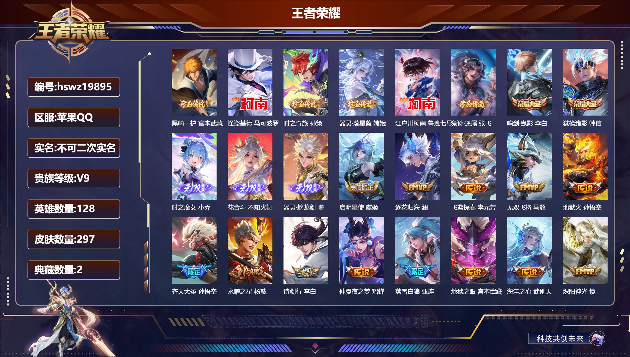 PX_2304805-Q/荣耀王者/297皮肤/128英雄/2典藏/0珍品无双/3无双/6珍品传说/27传说/74史诗/10稀有英雄 【6,珍品传说】黑崎一护,宫本武藏,怪盗基德,马可波罗,时之奇旅,孙策,器灵·落星盏,嫦娥,江户川柯南,鲁班七号,兔狲·蓬尾,张飞, 【2,典藏皮肤】鸣剑·曳影,李白,弑枪猎影,韩信, 【3,无双皮肤】时之魔女,小乔,花合斗,不知火舞,器灵·螭龙剑,曜, 【27,传说皮肤】启明星使,虞姬,逐花归海,澜,飞鸢探春,李元芳,无双飞将,马超,地狱火,孙悟空,齐天大圣,孙悟空,永曜之星,杨戬,诗剑行,李白,仲夏夜之梦,貂蝉,落雪白狼,亚连,地狱之眼,宫本武藏,海洋之心,武则天,炽阳神光,镜,怒海麟威,吕布,乘龙·问璇玑,孙尚香,黄金狮子座,达摩,久胜战神,干将莫邪,乘龙·淬吴钩,孙策,山海·炽霜斩,李信,一念神魔,李信,霜北刀,夏侯惇,玄雷天君,嬴政,神树通天,后羿,愿照·山河定,司空震,愿照·岁时盈,虞姬,鸣野蒿,桑启,云诺千山,公孙离, 【74,史诗皮肤】末日机甲,吕布,白昼王子,嬴政,蔬乡物语,鲁班七号,燃音魔法,高渐离,猫狗日记,大乔,心灵战警,亚瑟,诗语江南,西施,巫礼祀神,少司缘,鬼剑武藏,宫本武藏,百相守梦,黄忠,星夜王子,白起,无限星赏官,公孙离,遇见飞天,杨玉环,摇滚巨星,嬴政,偶像歌手,王昭君,梅西,裴擒虎,舞动绿茵,蔡文姬,鹰眼统帅,狄仁杰,飞衡,韩信,孙行者,孙悟空,金属风暴,墨子,特工魅影,百里守约,原初追逐者,百里玄策,逐浪之夏,李元芳,藏狐·褐绒,老夫子,灵蛊蚀心,扁鹊,雪豹·霜爪,百里守约,石田雨龙,后羿,鸭鸭历险记,刘禅,魔术师,狄仁杰,埋骨钱,暃,龙之律动,狂铁,顽岩魄,蒙犽,皇家上将,赵云,战舞者,姬小满,功夫厨神,程咬金,天才门将,刘禅,圣诞恋歌,貂蝉,水晶猎龙者,花木兰,决胜骁骑,关羽,破空之剑,亚连,一生所爱,露娜,心动手记,海诺,怒海争锋,黄忠,圣诞狂欢,吕布,青焰无极,镜,魅语,不知火舞,群星魔术团,上官婉儿,器灵·浮梦炉,赵怀真,白龙吟,韩信,夏日便利店,蔡文姬,岱宗,典韦,百相守梦,刘备,星界战将,牛魔,地狱岩魂,廉颇,茶境仙,孙膑,冰雪圆舞曲,甄姬,雪上飞焰,哪吒,千年之狐,李白,万灵启世,女娲,心灵骇客,安琪拉,箭羽风息,伽罗,乱世虎臣,张飞,琥珀纪元,伽罗,万物之道,弈星,谪仙醉月,李白,绅士熊喵,刘禅,百相守梦,百里守约,水果甜心,孙尚香,瑰影绮梦,芈月,化蝶舞,阿轲,绮世丹青,狄仁杰,幽灵船长,曹操,暗隐猎兽者,兰陵王, 【118,勇者皮肤】圆桌骑士,盾山,烛龙,曹操,太极少年,赵怀真,缤纷绘卷,张良,纽约教父,刘备,拳王,达摩,大发明家,达摩,龙舞盛年,沈梦溪,丁香结,小乔,功夫炙烤,廉颇,沉稳之力,孙尚香,朔风刀,夏侯惇,醍醐杖,老夫子,汉昭烈帝,刘备,白色死神,白起,黑桃队长,鲁班七号,黄金武士,典韦,御旌,牛魔,阴阳师,狄仁杰,径山谋武,孙权,致命风华,阿轲,次元突破,哪吒,古海寻踪,张良,戏梦巡演,空空儿,功夫老勺,老夫子,鲨炮海盗猫,沈梦溪,海滩派对,项羽,完美运算,后羿,踏浪烽翎,莱西奥,奇妙博物学,庄周,西部游侠,莱西奥,猎兽之王,吕布,哥特玫瑰,露娜,守护之力,大乔,无双福将,程咬金,潮玩探月行,猪八戒,天穹祈灯,鬼谷子,疑决卦,明世隐,化身博士,扁鹊,阿尔法小队,后羿,无尽旅途,扁鹊,五福同心,张飞,幻乐之宴,鬼谷子,虹云星官,明世隐,死亡骑士,亚瑟,浪漫序章,刘备,敏锐之力,李白,破局者,亚连,幽兰居士,张良,掌控之力,诸葛亮,海滩丽影,钟无艳,忍·炎影,赵云,狰,白起,雪境奇遇,西施,重明,芈月,炽热元素使,姜子牙,唤灵魔甲,刘禅,万事如意,刘备,乓乓大师,鲁班大师,雾都夜雨,干将莫邪,兔女郎,花木兰,龙腾万里,关羽,未来纪元,宫本武藏,零食大作战,姬小满,荣光之誓,亚瑟,花好人间,甄姬,万象初新,宫本武藏,御銮,盾山,春野之旅,钟无艳,秘密基地,刘禅,穷奇,典韦,教廷特使,韩信,街头霸王,韩信,妄想特派,李元芳,西部大镖客,孙悟空,进击墨子号,墨子,蔬乡物语,李元芳,少女阿狸,妲己,灵卜魔法,妲己,混沌棋,弈星,御霄,米莱狄,秘证寻踪,小乔,春野闲踪,苏烈,契约魔法,米莱狄,幻想奇妙夜,王昭君,灵野札记,张良,鸭鸭历险记,沈梦溪,命运角斗场,狂铁,御狮,狂铁,漠中幻影,嫦娥,白执事,赵云,饕餮,太乙真人,劲辣红锅,太乙真人,神迹守卫,孙悟空,剑破天穹,刘邦,异域游侠,刘备,苍威无极,项羽,铁骨偃魂,典韦,熔金海岸,周瑜,苍林狼骑,苍,天穹之誓,姜子牙,魅影绮裳,影,访茗客,马超,星梦巡礼,姜子牙,破阵·退雄兵,杨戬,谧流熔炉,太乙真人,群星魔术团,程咬金,经纬探寻者,盘古,暗都幽影,大司命,夏日便利店,虞姬,鹤鸣心笺,艾琳,百相守梦,老夫子,噬灭天穹,东皇太一,动物派对,亚瑟,敬我三分,盘古,爆裂喵拳,达摩,玫蓝誓约,戈娅,景韶洛都,明世隐, 【74,其他皮肤】伊势巫女,大乔,金属狂潮,高渐离,前尘,金蝉,圣殿之光,刘邦,芝加哥教父,黄忠,潮流仙人,老夫子,三太子,哪吒,棒球奇才,沈梦溪,极冰防御线,盾山,龙域领主,铠,花见巫女,伽罗,爱与和平,苏烈,未来旅行,孙膑,第七人偶,干将莫邪,灼热之刃,李信,海之征途,孙策,福禄兄弟,鲁班七号,帝国元帅,项羽,精灵王,后羿,绯红之刃,露娜,冰刃幻境,镜,碧珀绯影,暃,海军大将,周瑜,星航指挥官,诸葛亮,魇语军师,司马懿,英喵野望,刘禅,午夜歌剧院,元歌,启蛰,司空震,霓裳曲,杨玉环,花间舞,公孙离,街头旋风,裴擒虎,东海龙王,东皇太一,修竹墨客,上官婉儿,剑舞者,花木兰,范海辛,李白,维京掠夺者,苍,归虚梦演,蒙犽,激情绿茵,马可波罗,埃及法老,杨戬,归虚梦演,西施,画中
