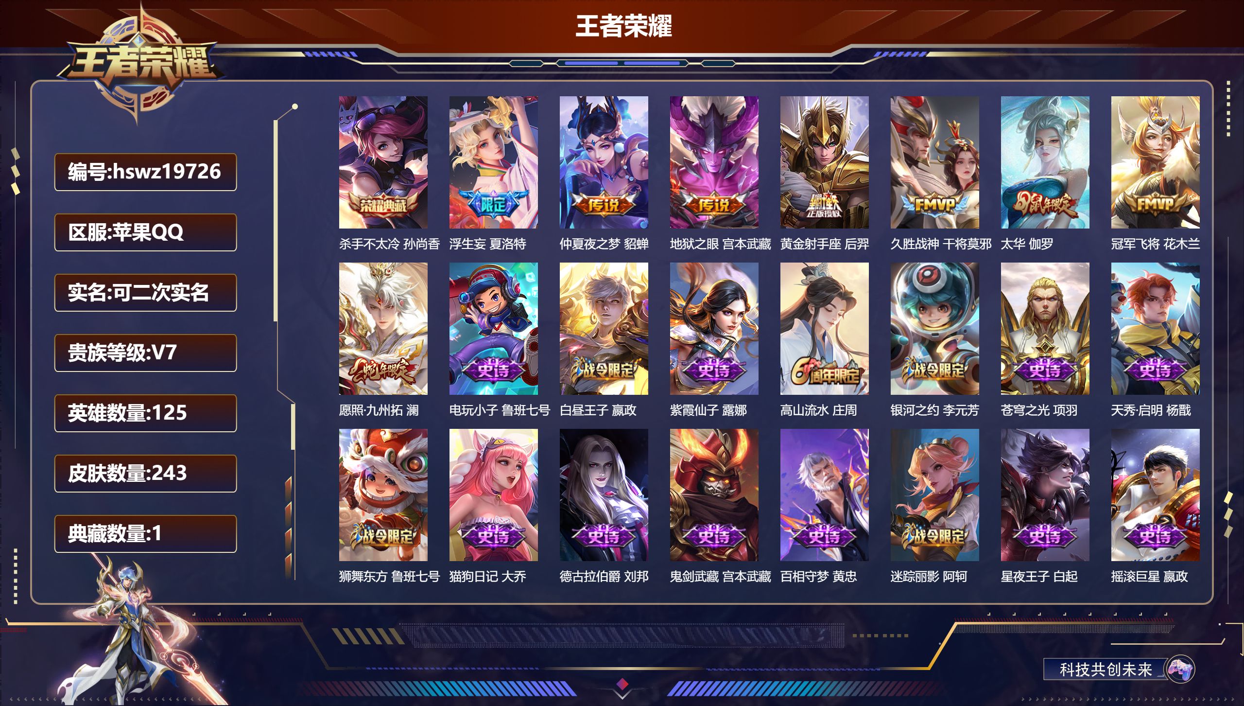 PX_2300178-Q/绝世王者/243皮肤/125英雄/1典藏/0珍品无双/0无双/0珍品传说/8传说/68史诗/9稀有英雄 【1,典藏皮肤】杀手不太冷,孙尚香, 【8,传说皮肤】浮生妄,夏洛特,仲夏夜之梦,貂蝉,地狱之眼,宫本武藏,黄金射手座,后羿,久胜战神,干将莫邪,太华,伽罗,冠军飞将,花木兰,愿照·九州拓,澜, 【68,史诗皮肤】电玩小子,鲁班七号,白昼王子,嬴政,紫霞仙子,露娜,高山流水,庄周,银河之约,李元芳,苍穹之光,项羽,天秀·启明,杨戬,狮舞东方,鲁班七号,猫狗日记,大乔,德古拉伯爵,刘邦,鬼剑武藏,宫本武藏,百相守梦,黄忠,迷踪丽影,阿轲,星夜王子,白起,摇滚巨星,嬴政,蜜橘之夏,公孙离,魅力维加斯,妲己,黄金分割率,诸葛亮,偶像歌手,王昭君,霸王别姬,虞姬,女仆咖啡,妲己,星界游侠,暃,繁星吟游,蔡文姬,暗夜贵公子,嬴政,鹰眼统帅,狄仁杰,白晶晶,芈月,大圣娶亲,孙悟空,李小龙,裴擒虎,纤云弄巧,云中君,龙骑士,墨子,金属风暴,墨子,特工魅影,百里守约,猫狗日记,孙策,原初追逐者,百里玄策,逐浪之夏,李元芳,未来纪元,赵云,魔术师,狄仁杰,顽岩魄,蒙犽,皇家上将,赵云,冰冠公主,雅典娜,功夫厨神,程咬金,梁祝,上官婉儿,圣诞恋歌,貂蝉,云间偶戏,元歌,水晶猎龙者,花木兰,涂山容容,公孙离,圣诞狂欢,吕布,青焰无极,镜,魅语,不知火舞,浮光幕影,芈月,星界战将,牛魔,地狱岩魂,廉颇,茶境仙,孙膑,蔷薇恋人,孙尚香,冰雪圆舞曲,甄姬,默契交锋,花木兰,节奏热浪,阿轲,暗夜猫娘,阿轲,曙光守护者,铠,万灵启世,女娲,乱世虎臣,张飞,缤纷独角兽,小乔,水果甜心,孙尚香,狂想玩偶喵,蒙犽,化蝶舞,阿轲,幽灵船长,曹操,乘风破浪,夏侯惇,暗隐猎兽者,兰陵王, 【129,勇者皮肤】烛龙,曹操,爱心护理,阿轲,缤纷绘卷,张良,纽约教父,刘备,拳王,达摩,大发明家,达摩,龙舞盛年,沈梦溪,丁香结,小乔,功夫炙烤,廉颇,沉稳之力,孙尚香,朔风刀,夏侯惇,醍醐杖,老夫子,归虚梦演,孙膑,汉昭烈帝,刘备,热血海滩,哪吒,黑桃队长,鲁班七号,黄金武士,典韦,夺宝奇兵,刘邦,御旌,牛魔,阴阳师,狄仁杰,炼金王,扁鹊,径山谋武,孙权,致命风华,阿轲,次元突破,哪吒,古海寻踪,张良,科学大爆炸,项羽,功夫老勺,老夫子,西部大镖客,牛魔,鲨炮海盗猫,沈梦溪,海滩派对,项羽,完美运算,后羿,万华元夜,狄仁杰,无尽征程,廉颇,踏浪烽翎,莱西奥,演武夺筹,程咬金,红桃皇后,芈月,奇妙博物学,庄周,猎兽之王,吕布,野性能量,吕布,哥特玫瑰,露娜,守护之力,大乔,无双福将,程咬金,瓷语鉴心,露娜,原初探秘者,鬼谷子,星空之诺,沈梦溪,潮玩探月行,猪八戒,天穹祈灯,鬼谷子,西部大镖客,猪八戒,疑决卦,明世隐,如懿,安琪拉,化身博士,扁鹊,潮玩骑士王,亚瑟,阿尔法小队,后羿,五福同心,张飞,次元傲视,杨戬,幻乐之宴,鬼谷子,东方不败,武则天,霸王丸,宫本武藏,虹云星官,明世隐,救世之瞳,扁鹊,赤莲之焰,周瑜,死亡骑士,亚瑟,浪漫序章,刘备,危途狂花,戈娅,幽兰居士,张良,海滩丽影,钟无艳,忍·炎影,赵云,狰,白起,雪境奇遇,西施,重明,芈月,坚韧之力,苏烈,唤灵魔甲,刘禅,万事如意,刘备,乓乓大师,鲁班大师,妖精王,孙膑,探海日志,鲁班大师,天使之翼,孙膑,雾都夜雨,干将莫邪,兔女郎,花木兰,龙腾万里,关羽,罗小黑战记,哪吒,荣光之誓,亚瑟,花好人间,甄姬,万象初新,宫本武藏,御銮,盾山,单词大作战,雅典娜,春野之旅,钟无艳,秘密基地,刘禅,穷奇,典韦,教廷特使,韩信,黑猫爱糖果,李元芳,街头霸王,韩信,妄想特派,李元芳,西部大镖客,孙悟空,紫罗兰之誓,妲己,凯尔特女王,虞姬,进击墨子号,墨子,少女阿狸,妲己,混沌棋,弈星,御霄,米莱狄,蔚蓝守将,蒙恬,布丁狗之约,阿古朵,命运加冕,露娜,幻想奇妙夜,王昭君,灵野札记,张良,驱傩正仪,钟馗,神迹守卫,钟馗,命运角斗场,狂铁,虚灵犬护,钟馗,御狮,狂铁,白执事,赵云,饕餮,太乙真人,罗小黑战记,张良,剑破天穹,刘邦,苍威无极,项羽,铁骨偃魂,典韦,熔金海岸,周瑜,苍林狼骑,苍,天穹之誓,姜子牙,魅影绮裳,影,访茗客,马超,星梦巡礼,姜子牙,谧流熔炉,太乙真人,群星魔术团,程咬金,暗都幽影,大司命,鹤鸣心笺,艾琳,噬灭天穹,东皇太一,玫蓝誓约,戈娅,景韶洛都,明世隐, 【38,其他皮肤】伊势巫女,大乔,金属狂潮,高渐离,前尘,金蝉,芝加哥教父,黄忠,三太子,哪吒,棒球奇才,沈梦溪,极冰防御线,盾山,死神来了,曹操,花见巫女,伽罗,万圣前夜,小乔,灼热之刃,李信,木偶奇遇记,鲁班七号,精灵王,后羿,冰刃幻境,镜,魇语军师,司马懿,启蛰,司空震,隐刃,兰陵王,花间舞,公孙离,街头旋风,裴擒虎,剑舞者,花木兰,范海辛,李白,维京掠夺者,苍,占星师,明世隐,激情绿茵,马可波罗,埃及法老,杨戬,锦衣卫,狄仁杰,威尼斯狂欢,百里玄策,幸存者,马超,战争女神,雅典娜,特种部队,李元芳,孤猎,澜,秩序猎龙将,蒙恬,精灵公主,王昭君,赤焰之缨,云缨,地府判官,钟馗,美梦成真,梦奇,圆桌骑士,太乙真人,西部大镖客,孙悟空, 【9,稀有英雄】敖隐,嬴政,不知火舞,橘右京,夏洛特,娜可露露,韩信,艾琳,赵云, 营地ID:,