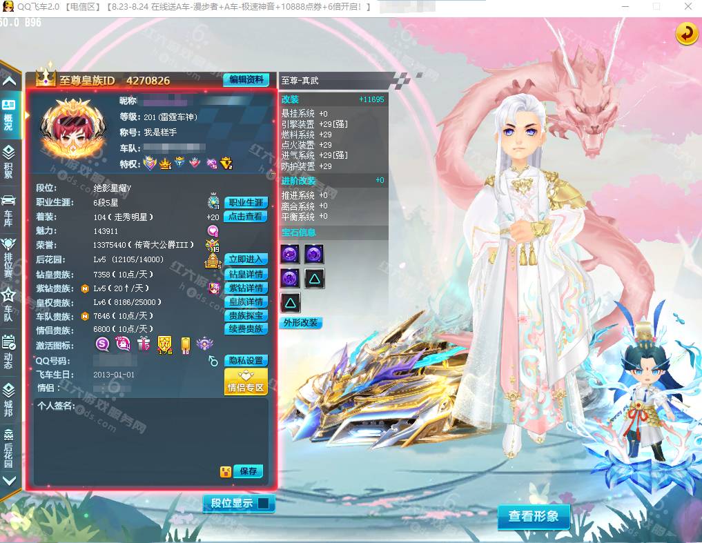 F15891,红六更号裙762771576【电信一区】红六自营,魅力6.8W,荣誉270W,10S车:三四至尊影龙/X次元青龙+29,单四至尊爆天甲/神奥丁+29,至尊盘龙,至尊帝王,雪域冰魄,风行者Reamake,黑域电魔,终极银天使,终极猛兽,地狱火,3T2:孙悟空,凌霜圣使,擎天战神,25A车:单四雷诺千机变+29/战争雷诺/电玩雷诺/飓风雷诺,6T1,17骑宠:梅灵婉香+10,艾丽莎+4,霹雳天使+10,焰火朱雀+8,九霄龙王,5坐骑,套装男13页:天降良缘,套装女40页:X次元青龙套装/夜月流星/晚星甜梦,8999R