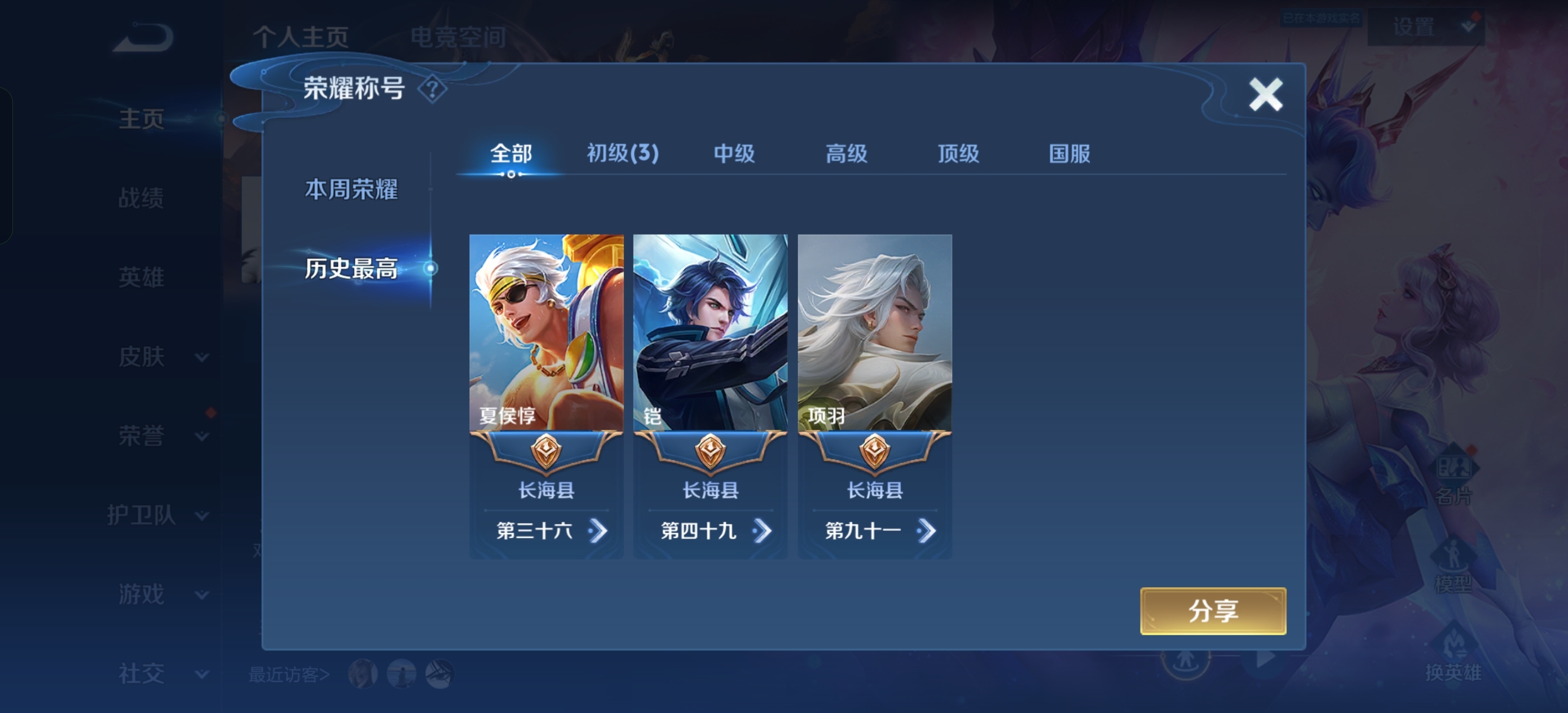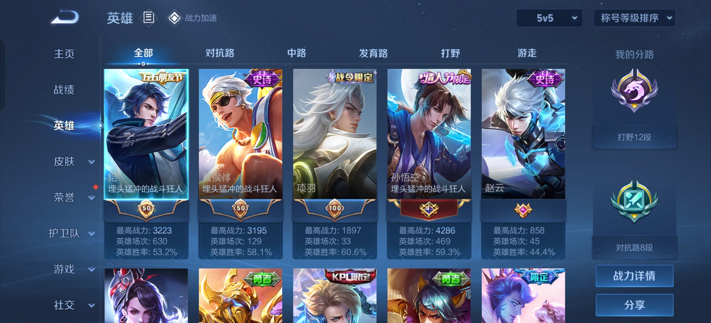 W10022【安卓区V8】可二次实名,英雄104,皮肤161,典藏:李白鸣剑.曳