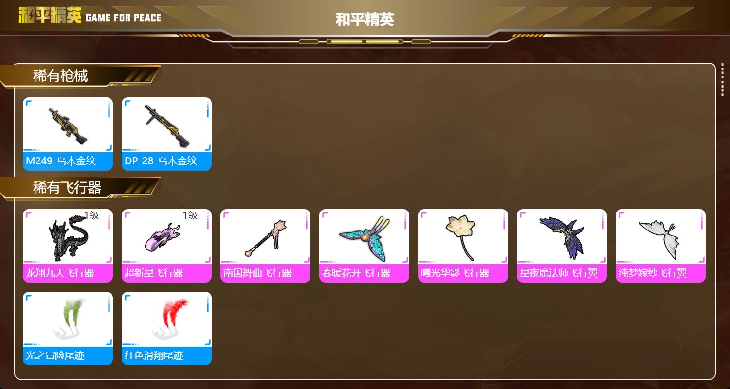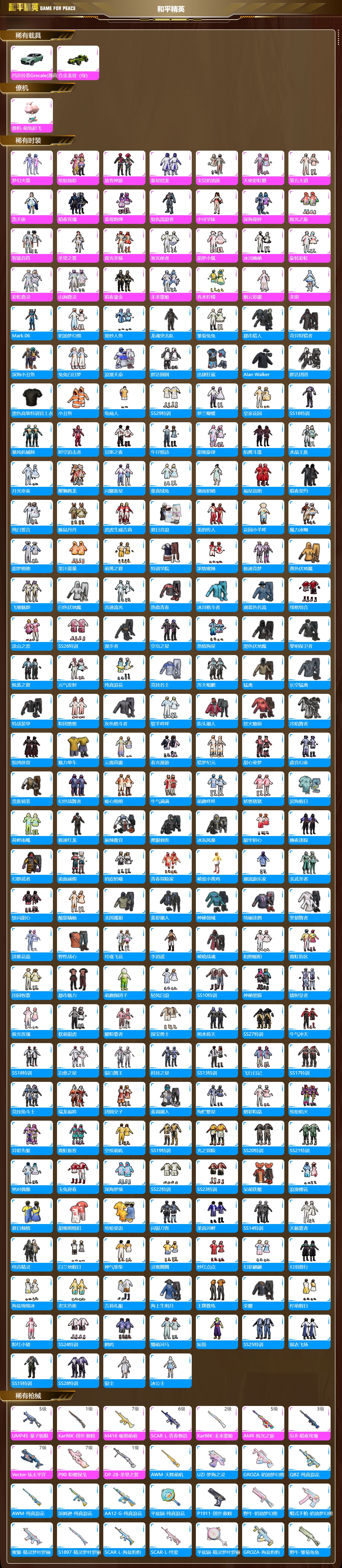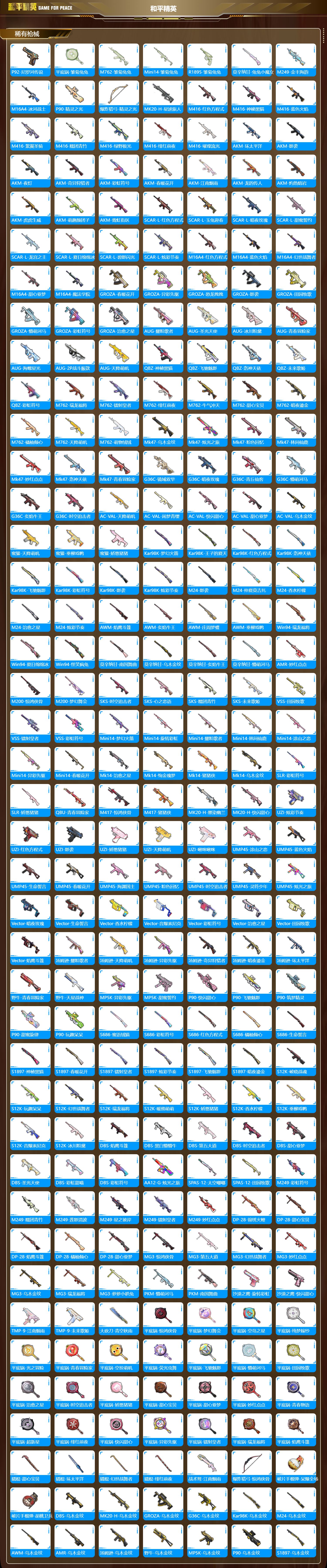 【317稀有枪械】,AWM-天降萌叽,UZI-梦海之灵,GROZA-奶油梦幻熊,UMP45-量子极限,QBZ-纯真浪花,AWM-纯真浪花,汤姆逊-纯真浪花,DBS-乌木金纹,AA12-G-纯真浪花,平底锅-纯真浪花,P1911-创世·救赎,野牛-奶油梦幻熊,蝎式手枪-奶油梦幻熊,Kar98K-创世·救赎,蜜獾-精灵梦叶罗丽,S1897-精灵梦叶罗丽,SCAR-L-海盐豹豹,SCAR-L-绊爱,平底锅-精灵梦叶罗丽,GROZA-海盐豹豹,野牛-雏菊兔兔,P92-尼罗河传说,平底锅-雏菊兔兔,M762-雏菊兔兔,Mini14-雏菊兔兔,R1895-雏菊兔兔,莫辛纳甘-兔兔小魔女,M249-金丰海韵,M16A4-冰河战士,MK20-H-乌木金纹,M416-暖熊萌萌,SCAR-L-青春物语,Kar98K-未来歌姬,AMR-炫光之旅,SLR-暗夜玫瑰,Vector-环太平洋,P90-粉樱探戈,DP-28-圣堂之誓,P90-精灵之光,爆炸猎弓-精灵之光,MK20-H-星途旅人,M416-红色方程式,M416-神秘黑猫,M416-蓝色火焰,M416-紫翼圣骑,M416-糯团青竹,M416-绿野极光,M416-绯红前夜,M416-璀璨流光,AKM-环太平洋,AKM-影袭,AKM-夜灯,AKM-奇异狩猎者,AKM-彩虹符号,AKM-春暖花开,AKM-江南烟雨,AKM-龙的传人,AKM-灼热熔岩,AKM-虎虎生威,AKM-萌趣颜团子,AKM-霓虹街区,SCAR-L-红色方程式,SCAR-L-玉兔迎春,SCAR-L-暗夜玫瑰,SCAR-L-甜蜜誓约,SCAR-L-龙宫之主,SCAR-L-夏日绵绵冰,SCAR-L-碧影闪光,SCAR-L-炫彩节奏,M16A4-红色方程式,M16A4-蓝色火焰,M16A4-幻世战舞者,M16A4-甜心亚梦,M16A4-魔法学院,GROZA-乌木金纹,GROZA-春暖花开,GROZA-异彩先驱,GROZA-恐龙拽拽,GROZA-影袭,GROZA-田园牧歌,GROZA-懵萌河马,GROZA-彩虹符号,GROZA-治愈之星,AUG-耀粉歌者,AUG-圣光天使,AUG-冰川粉黛,AUG-青春冒险家,AUG-海螺星光,AUG-2P战斗服款,AUG-天降萌叽,QBZ-神秘黑猫,QBZ-飞驰魅影,QBZ-洛神天依,QBZ-未来歌姬,QBZ-彩虹符号,M762-瑞龙福将,M762-镭射皇者,M762-绯红前夜,M762-牛气冲天,M762-甜心宝贝,M762-暗夜鎏金,M762-橘柚倾心,M762-天降萌叽,M762-萌物绒绒,Mk47-乌木金纹,Mk47-炫光之旅,Mk47-粉色回忆,Mk47-林间仙鹿,Mk47-妙红点点,Mk47-洛神天依,Mk47-青春冒险家,G36C-镜域双华,G36C-乌木金纹,G36C-暗夜玫瑰,G36C-青丘仙客,G36C-懵萌河马,G36C-炙焰牛王,G36C-时空追击者,AC-VAL-天降萌叽,AC-VAL-闲梦青缨,AC-VAL-快闪甜心,AC-VAL-甜心亚梦,AC-VAL-乌木金纹,蜜獾-天降萌叽,蜜獾-垂柳戏鸭,蜜獾-娇憨猪猪,Kar98K-乌木金纹,Kar98K-梦幻火箭,Kar98K-王子的夏天,Kar98K-红色方程式,Kar98K-洛神天依,Kar98K-飞驰魅影,Kar98K-彩虹符号,Kar98K-影袭,Kar98K-炫彩节奏,M24-乌木金纹,M24-影袭,M24-仲夏莫吉托,M24-香水柠檬,M24-治愈之星,M24-炫彩节奏,AWM-乌木金纹,AWM-焰鹰斗篷,AWM-炙焰牛王,AWM-庄周梦蝶,AWM-垂柳戏鸭,Win94-瑞龙福将,Win94-夏日绵绵冰,Win94-怪笑疯兔,莫辛纳甘-南国舞曲,莫辛纳甘-乌木金纹,莫辛纳甘-炙焰牛王,莫辛纳甘-懵萌河马,AMR-乌木金纹,AMR-妙红点点,M200-惊鸿侠骨,M200-梦幻舞会,SKS-时空追击者,SKS-心之恋语,SKS-糯团青竹,SKS-未来歌姬,VSS-田园牧歌,VSS-镭射皇者,VSS-彩虹符号,Mini14-梦幻火箭,Mini14-旋转彩虹,Mini14-耀粉歌者,Mini14-林间仙鹿,Mini14-涂山之恋,Mini14-异彩先驱,Mini14-春暖花开,Mk14-治愈之星,Mk14-绚金瑰梦,Mk14-猪猪侠,Mk14-乌木金纹,SLR-彩虹符号,SLR-娇憨猪猪,QBU-青春冒险家,M417-惊鸿侠骨,M417-猪猪侠,MK20-H-墨染幽兰,MK20-H-快闪甜心,UZI-炫彩节奏,UZI-红色方程式,UZI-影袭,UZI-娇憨猪猪,UZI-天降萌叽,UZI-啾咪啾咪,UMP45-涂山之恋,UMP45-蓝色火焰,UMP45-生命誓言,UMP45-春暖花开,UMP45-海渊国主,UMP45-粉色回忆,UMP45-时空追击者,UMP45-灵符少年,UMP45-炫光之旅,Vector-暗夜玫瑰,Vector-生命誓言,Vector-香水柠檬,Vector-音爆索尼克,Vector-彩虹符号,Vector-治愈之星,Vector-田园牧歌,Vector-焰鹰斗篷,汤姆逊-耀粉歌者,汤姆逊-天降萌叽,汤姆逊-乌木金纹,汤姆逊-异彩先驱,汤姆逊-奇异狩猎者,汤姆逊-暗夜鎏金,汤姆逊-环太平洋,野牛-乌木金纹,野牛-青春冒险家,野牛-天星战神,MP5K-异彩先驱,MP5K-甜蜜誓约,MP5K-乌木金纹,P90-乌木金纹,P90-快闪甜心,P90-飞驰魅影,P90-筑梦精灵,P90-甜蜜旋律,P90-玩趣呆呆,S686-蜜语绒猫,S686-彩虹符号,S686-红色方程式,S686-橘柚倾心,S686-生命誓言,S1897-神秘黑猫,S1897-春暖花开,S1897-镭射皇者,S1897-乌木金纹,S1897-炫彩节奏,S1897-飞驰魅影,S1897-暗夜鎏金,S12K-破晓战魂,S12K-玩趣呆呆,S12K-幻世战舞者,S12K-瑞龙福将,S12K-暖熊萌萌,S12K-娇憨猪猪,S12K-香水柠檬,S12K-垂柳戏鸭,S12K-音爆索尼克,S12K-冰川粉黛,DBS-焰鹰斗篷,DBS-黑白懵懵牛,DBS-第五大道,DBS-时空追击者,DBS-甜心亚梦,DBS-圣光天使,DBS-彩虹甜喵,DBS-彩虹符号,AA12-G-炫光之旅,SPAS-12-太空嘟嘟,SPAS-12-田园牧歌,M249-彩虹符号,M249-糯团青竹,M249-莲影清波,M249-乌木金纹,M249-星之彼岸,M249-镭射皇者,M249-妙红点点,DP-28-锦绣火鲤,DP-28-甜心宝贝,DP-28-焰鹰斗篷,DP-28-橘柚倾心,DP-28-乌木金纹,DP-28-甜心亚梦,MG3-惊鸿侠骨,MG3-第五大道,MG3-幻世战舞者,MG3-妙红点点,MG3-乌木金纹,MG3-瑞龙福将,MG3-萝萝小趴兔,PKM-懵萌河马,PKM-南国舞曲,沙漠之鹰-旋转彩虹,沙漠之鹰-快闪甜心,TMP-9-江南烟雨,TMP-9-未来歌姬,大砍刀-青空秋雨,平底锅-惊鸿侠骨,平底锅-梦幻舞会,平底锅-空岛之星,平底锅-纯梦嫁纱,平底锅-光之冒险,平底锅-青春冒险家,平底锅-空投萌叽,平底锅-荧光虫舞,平底锅-飞驰魅影,平底锅-懵萌河马,平底锅-田园牧歌,平底锅-治愈之星,平底锅-时空追击者,平底锅-娇憨猪猪,平底锅-甜心宝贝,平底锅-甜心亚梦,平底锅-妙红点点,平底锅-青春物语,平底锅-超新星,平底锅-绯红前夜,平底锅-快闪甜心,平底锅-异彩先驱,平底锅-镭射皇者,平底锅-瑞龙福将,平底锅-焰鹰