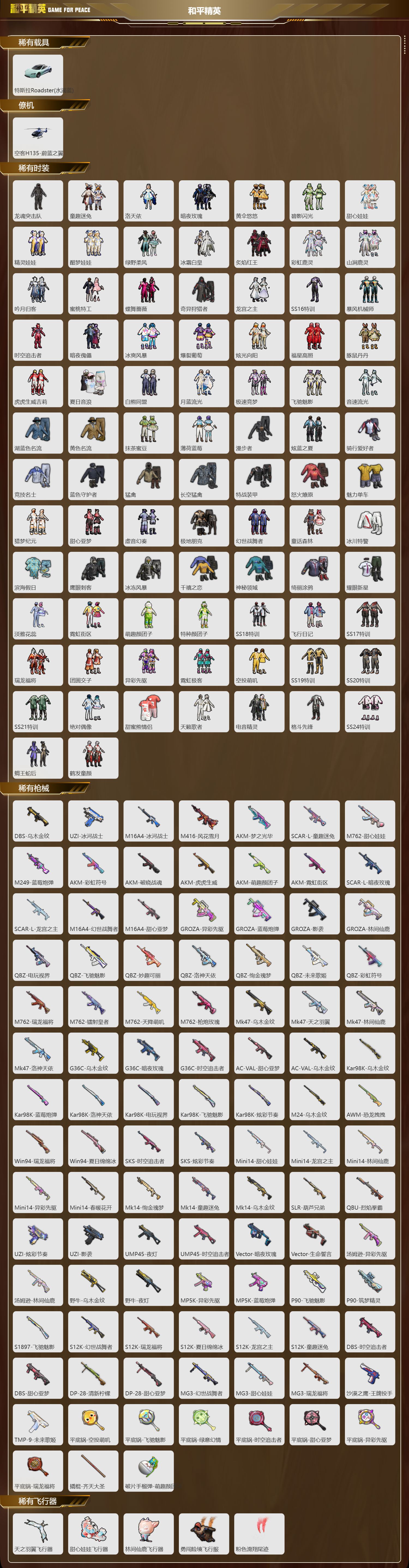 【5特效枪】AKM-梦之光华-4级,SCAR-L-童趣迷兔-5级,M416-风花雪月-5级,M762-甜心娃娃-5级,M249-蓝莓炮弹-4级,