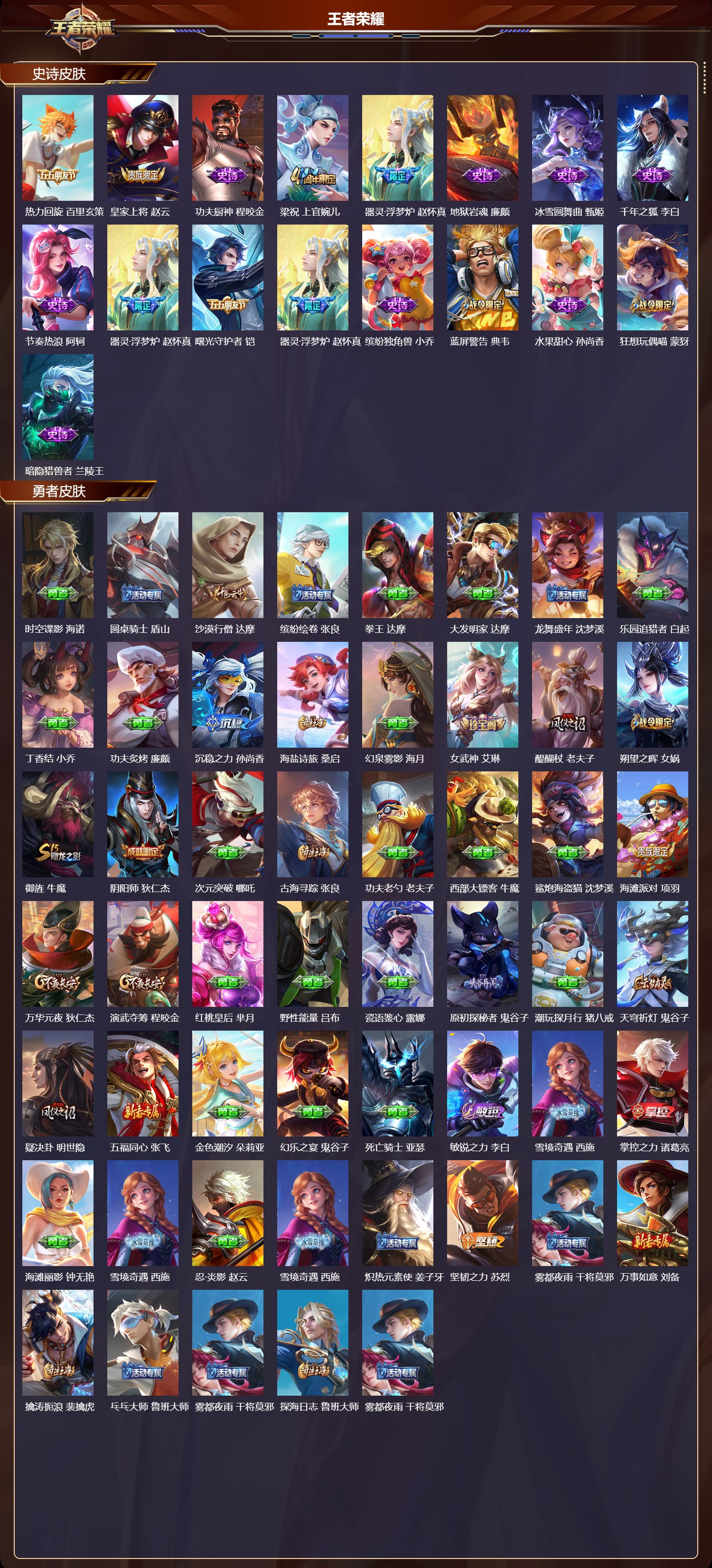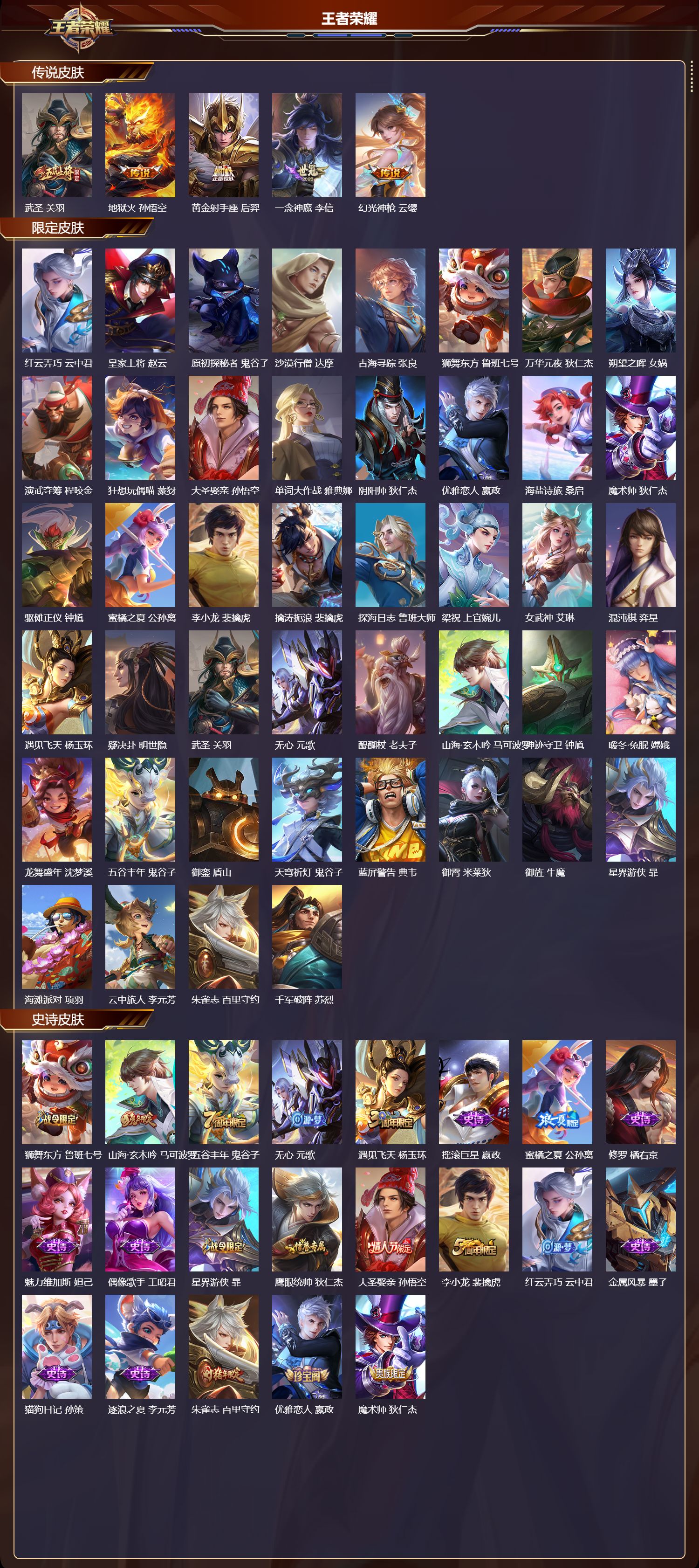 【38,史诗皮肤】,狮舞东方,鲁班七号,山海·玄木吟,马可波罗,五谷丰年,鬼谷子,无心,元歌,遇见飞天,杨玉环,摇滚巨星,嬴政,蜜橘之夏,公孙离,修罗,橘右京,魅力维加斯,妲己,偶像歌手,王昭君,星界游侠,暃,鹰眼统帅,狄仁杰,大圣娶亲,孙悟空,李小龙,裴擒虎,纤云弄巧,云中君,金属风暴,墨子,猫狗日记,孙策,逐浪之夏,李元芳,朱雀志,百里守约,优雅恋人,嬴政,魔术师,狄仁杰,热力回旋,百里玄策,皇家上将,赵云,功夫厨神,程咬金,梁祝,上官婉儿,器灵·浮梦炉,赵怀真,地狱岩魂,廉颇,冰雪圆舞曲,甄姬,千年之狐,李白,节奏热浪,阿轲,器灵·浮梦炉,赵怀真,曙光守护者,铠,器灵·浮梦炉,赵怀真,缤纷独角兽,小乔,蓝屏警告,典韦,水果甜心,孙尚香,狂想玩偶喵,蒙犽,暗隐猎兽者,兰陵王,