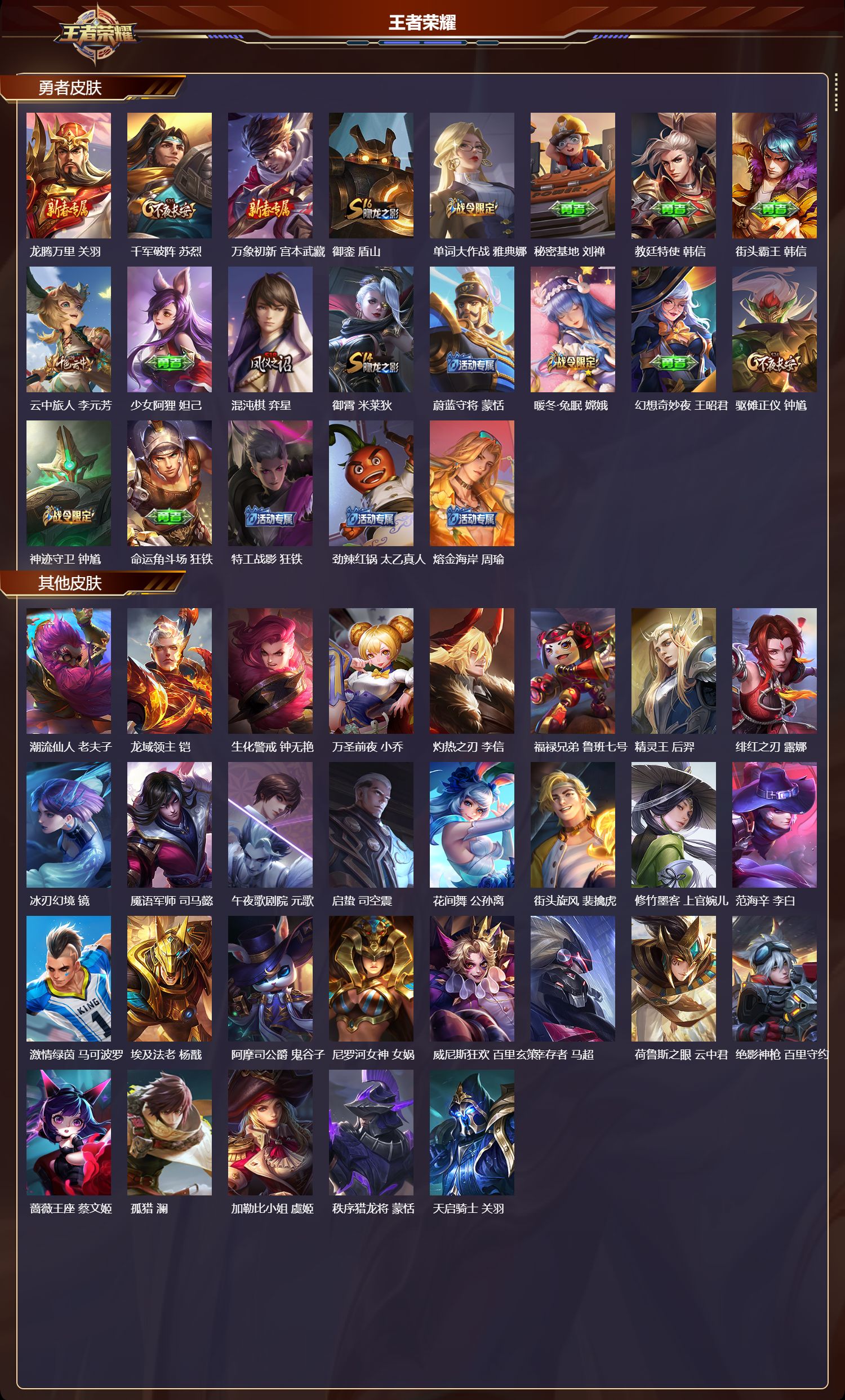 【74,勇者皮肤】,时空谍影,海诺,圆桌骑士,盾山,沙漠行僧,达摩,缤纷绘卷,张良,拳王,达摩,大发明家,达摩,龙舞盛年,沈梦溪,乐园追猎者,白起,丁香结,小乔,功夫炙烤,廉颇,沉稳之力,孙尚香,海盐诗旅,桑启,幻泉雾影,海月,女武神,艾琳,醍醐杖,老夫子,朔望之晖,女娲,御旌,牛魔,阴阳师,狄仁杰,次元突破,哪吒,古海寻踪,张良,功夫老勺,老夫子,西部大镖客,牛魔,鲨炮海盗猫,沈梦溪,海滩派对,项羽,万华元夜,狄仁杰,演武夺筹,程咬金,红桃皇后,芈月,野性能量,吕布,瓷语鉴心,露娜,原初探秘者,鬼谷子,潮玩探月行,猪八戒,天穹祈灯,鬼谷子,疑决卦,明世隐,五福同心,张飞,金色潮汐,朵莉亚,幻乐之宴,鬼谷子,死亡骑士,亚瑟,敏锐之力,李白,雪境奇遇,西施,掌控之力,诸葛亮,海滩丽影,钟无艳,雪境奇遇,西施,忍·炎影,赵云,雪境奇遇,西施,炽热元素使,姜子牙,坚韧之力,苏烈,雾都夜雨,干将莫邪,万事如意,刘备,擒涛扼浪,裴擒虎,乓乓大师,鲁班大师,雾都夜雨,干将莫邪,探海日志,鲁班大师,雾都夜雨,干将莫邪,龙腾万里,关羽,千军破阵,苏烈,万象初新,宫本武藏,御銮,盾山,单词大作战,雅典娜,秘密基地,刘禅,教廷特使,韩信,街头霸王,韩信,云中旅人,李元芳,少女阿狸,妲己,混沌棋,弈星,御霄,米莱狄,蔚蓝守将,蒙恬,暖冬·兔眠,嫦娥,幻想奇妙夜,王昭君,驱傩正仪,钟馗,神迹守卫,钟馗,命运角斗场,狂铁,特工战影,狂铁,劲辣红锅,太乙真人,熔金海岸,周瑜,