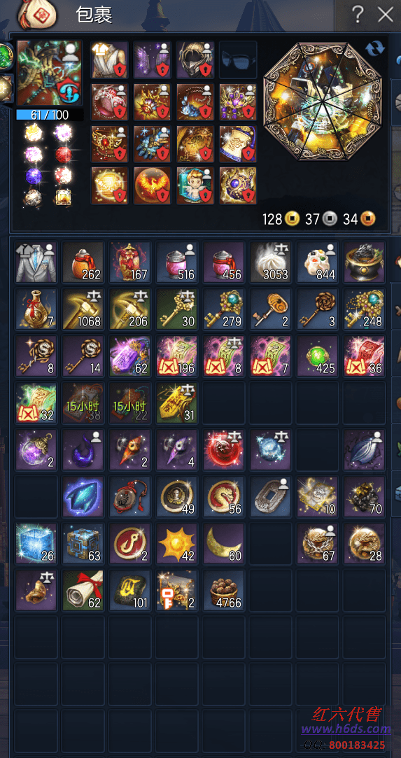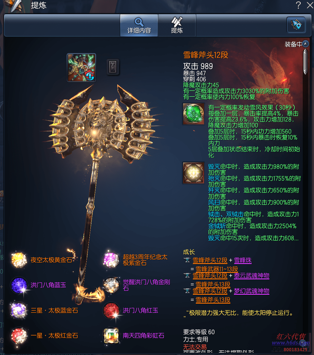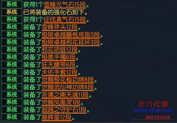 11649,无日峰力士,侠义团92段,三星太极石,雪峰元气石15段,征伐真气石15段,雪峰斧头12段,卓越蟠桃戒指3段,卓越邪花耳环3段,邪花项链12段,极凰手镯6段,狂天腰带6段,天佑手套12段,极花秘功牌8段,武仙神功牌8段,苦痛南天魂11段,觉醒凤凰灵1段,超越守护石1段,晨晖星12段,衣服128, 10000R,