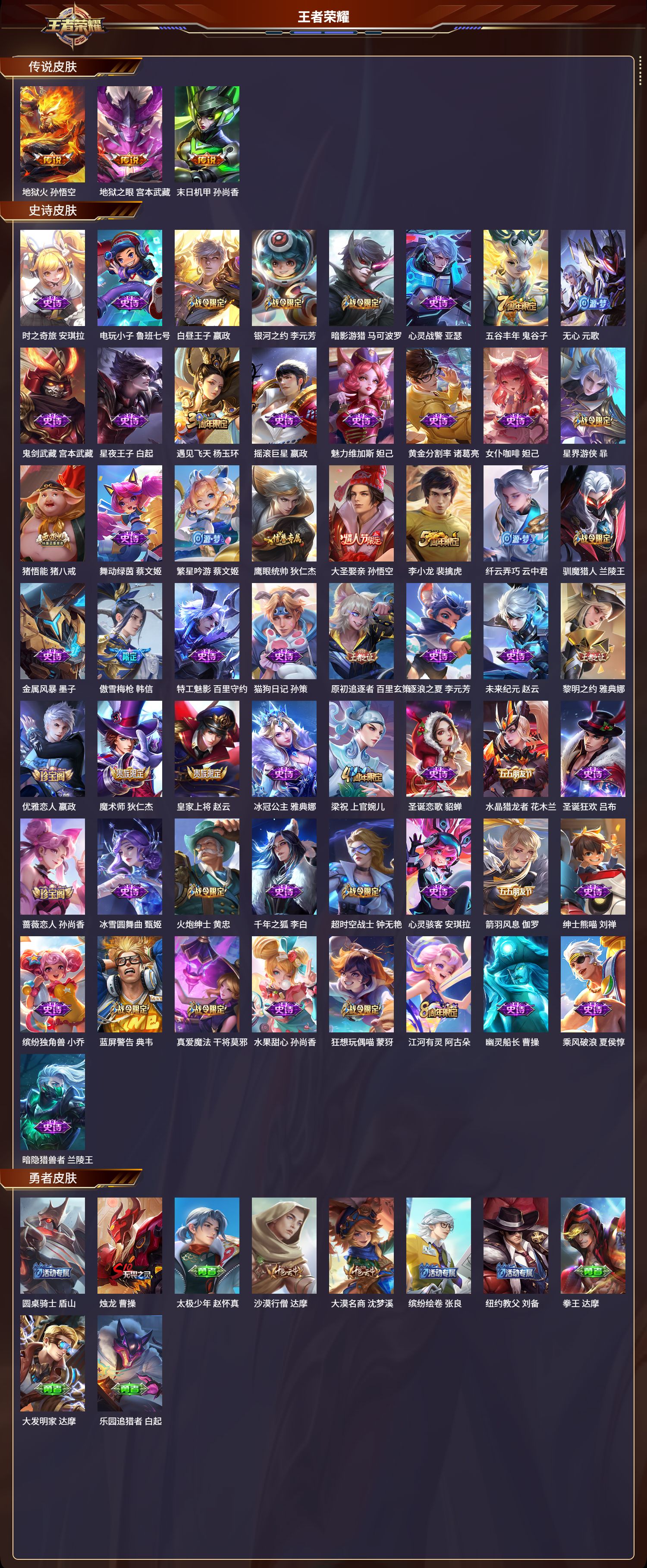 【57,史诗皮肤】时之奇旅,安琪拉,电玩小子,鲁班七号,白昼王子,嬴政,银河之约,李元芳,暗影游猎,马可波罗,心灵战警,亚瑟,五谷丰年,鬼谷子,无心,元歌,鬼剑武藏,宫本武藏,星夜王子,白起,遇见飞天,杨玉环,摇滚巨星,嬴政,魅力维加斯,妲己,黄金分割率,诸葛亮,女仆咖啡,妲己,星界游侠,暃,猪悟能,猪八戒,舞动绿茵,蔡文姬,繁星吟游,蔡文姬,鹰眼统帅,狄仁杰,大圣娶亲,孙悟空,李小龙,裴擒虎,纤云弄巧,云中君,驯魔猎人,兰陵王,金属风暴,墨子,傲雪梅枪,韩信,特工魅影,百里守约,猫狗日记,孙策,原初追逐者,百里玄策,逐浪之夏,李元芳,未来纪元,赵云,黎明之约,雅典娜,优雅恋人,嬴政,魔术师,狄仁杰,皇家上将,赵云,冰冠公主,雅典娜,梁祝,上官婉儿,圣诞恋歌,貂蝉,水晶猎龙者,花木兰,圣诞狂欢,吕布,蔷薇恋人,孙尚香,冰雪圆舞曲,甄姬,火炮绅士,黄忠,千年之狐,李白,超时空战士,钟无艳,心灵骇客,安琪拉,箭羽风息,伽罗,绅士熊喵,刘禅,缤纷独角兽,小乔,蓝屏警告,典韦,真爱魔法,干将莫邪,水果甜心,孙尚香,狂想玩偶喵,蒙犽,江河有灵,阿古朵,幽灵船长,曹操,乘风破浪,夏侯惇,暗隐猎兽者,兰陵王,