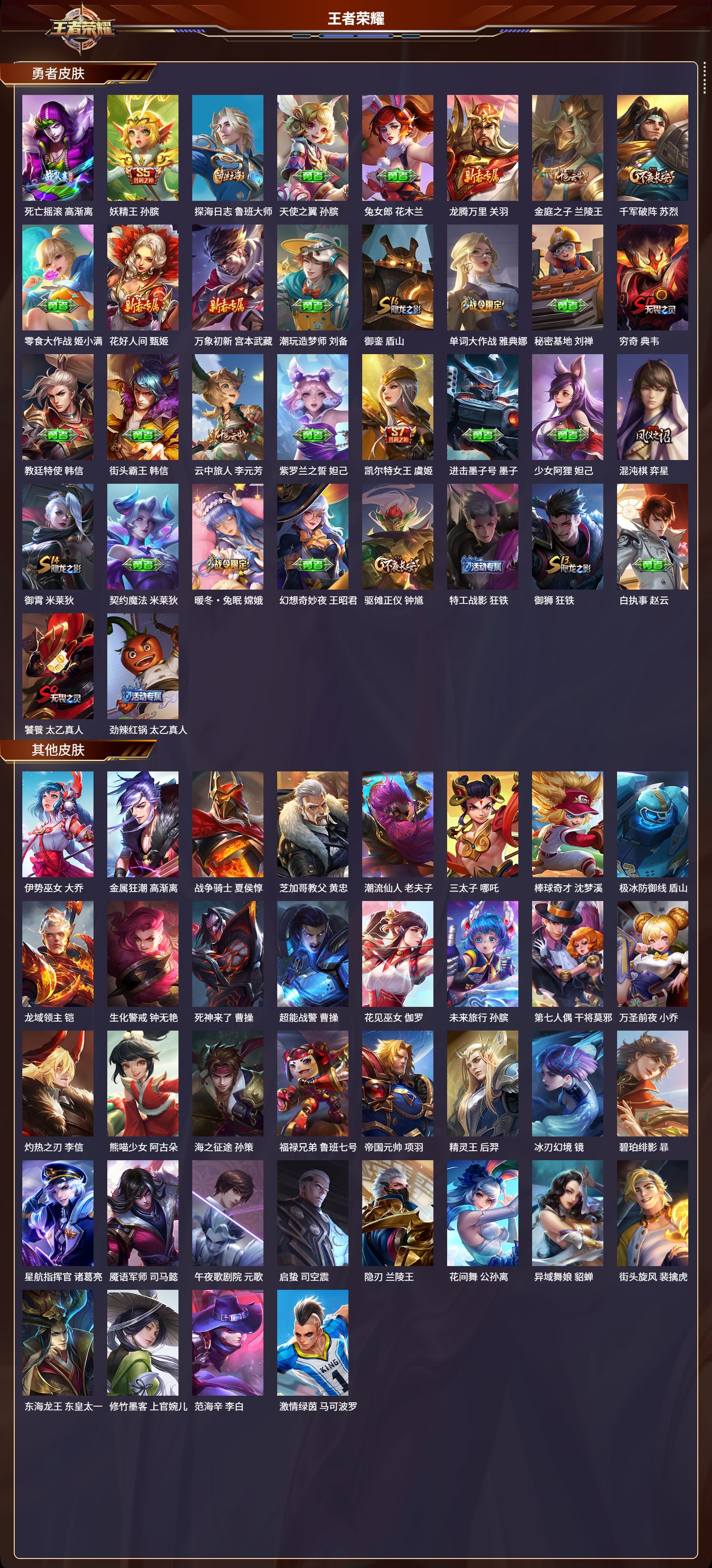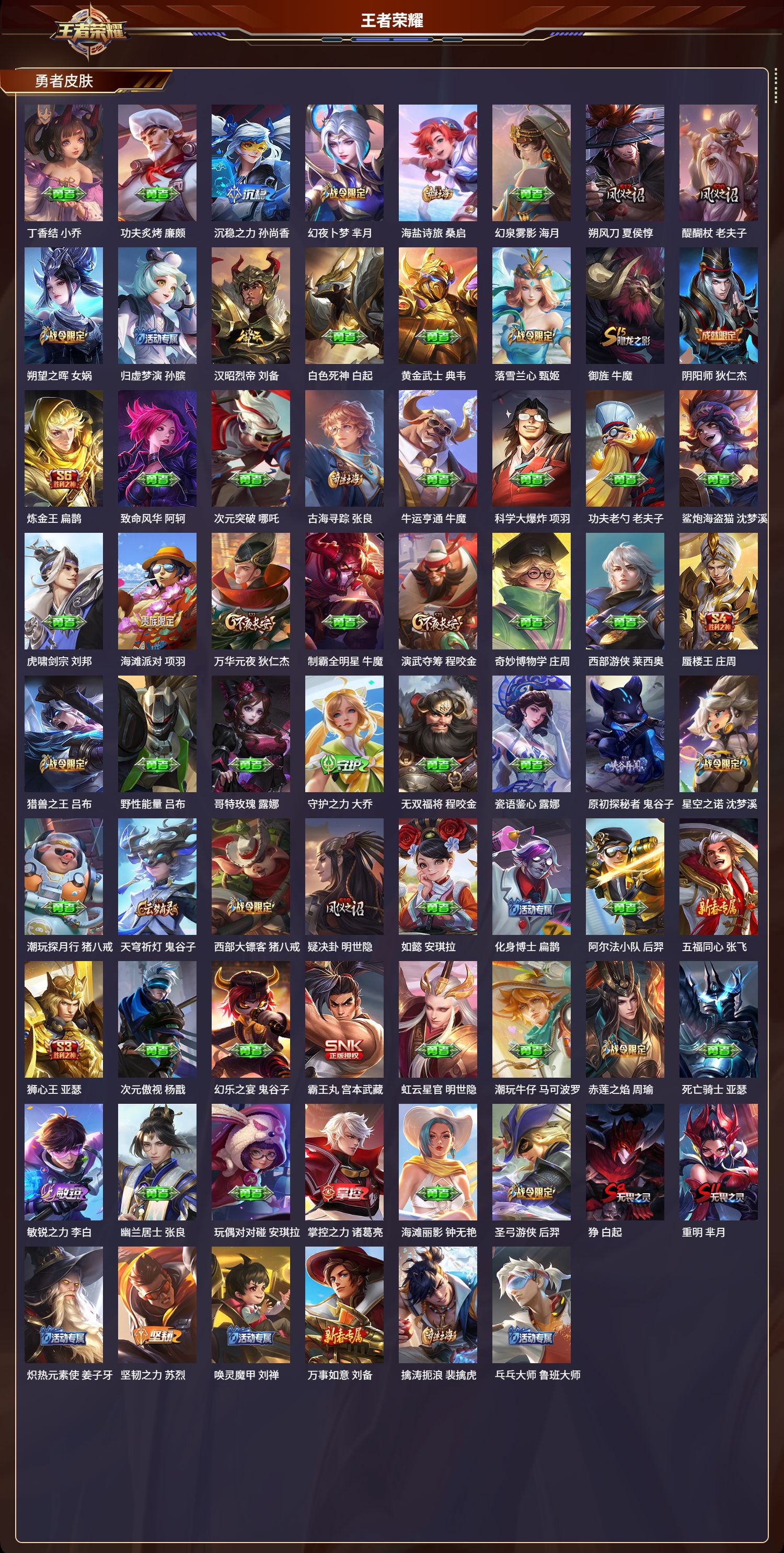 【114,勇者皮肤】圆桌骑士,盾山,烛龙,曹操,太极少年,赵怀真,沙漠行僧,达摩,大漠名商,沈梦溪,缤纷绘卷,张良,纽约教父,刘备,拳王,达摩,大发明家,达摩,乐园追猎者,白起,丁香结,小乔,功夫炙烤,廉颇,沉稳之力,孙尚香,幻夜卜梦,芈月,海盐诗旅,桑启,幻泉雾影,海月,朔风刀,夏侯惇,醍醐杖,老夫子,朔望之晖,女娲,归虚梦演,孙膑,汉昭烈帝,刘备,白色死神,白起,黄金武士,典韦,落雪兰心,甄姬,御旌,牛魔,阴阳师,狄仁杰,炼金王,扁鹊,致命风华,阿轲,次元突破,哪吒,古海寻踪,张良,牛运亨通,牛魔,科学大爆炸,项羽,功夫老勺,老夫子,鲨炮海盗猫,沈梦溪,虎啸剑宗,刘邦,海滩派对,项羽,万华元夜,狄仁杰,制霸全明星,牛魔,演武夺筹,程咬金,奇妙博物学,庄周,西部游侠,莱西奥,蜃楼王,庄周,猎兽之王,吕布,野性能量,吕布,哥特玫瑰,露娜,守护之力,大乔,无双福将,程咬金,瓷语鉴心,露娜,原初探秘者,鬼谷子,星空之诺,沈梦溪,潮玩探月行,猪八戒,天穹祈灯,鬼谷子,西部大镖客,猪八戒,疑决卦,明世隐,如懿,安琪拉,化身博士,扁鹊,阿尔法小队,后羿,五福同心,张飞,狮心王,亚瑟,次元傲视,杨戬,幻乐之宴,鬼谷子,霸王丸,宫本武藏,虹云星官,明世隐,潮玩牛仔,马可波罗,赤莲之焰,周瑜,死亡骑士,亚瑟,敏锐之力,李白,幽兰居士,张良,玩偶对对碰,安琪拉,掌控之力,诸葛亮,海滩丽影,钟无艳,圣弓游侠,后羿,狰,白起,重明,芈月,炽热元素使,姜子牙,坚韧之力,苏烈,唤灵魔甲,刘禅,万事如意,刘备,擒涛扼浪,裴擒虎,乓乓大师,鲁班大师,死亡摇滚,高渐离,妖精王,孙膑,探海日志,鲁班大师,天使之翼,孙膑,兔女郎,花木兰,龙腾万里,关羽,金庭之子,兰陵王,千军破阵,苏烈,零食大作战,姬小满,花好人间,甄姬,万象初新,宫本武藏,潮玩造梦师,刘备,御銮,盾山,单词大作战,雅典娜,秘密基地,刘禅,穷奇,典韦,教廷特使,韩信,街头霸王,韩信,云中旅人,李元芳,紫罗兰之誓,妲己,凯尔特女王,虞姬,进击墨子号,墨子,少女阿狸,妲己,混沌棋,弈星,御霄,米莱狄,契约魔法,米莱狄,暖冬·兔眠,嫦娥,幻想奇妙夜,王昭君,驱傩正仪,钟馗,特工战影,狂铁,御狮,狂铁,白执事,赵云,饕餮,太乙真人,劲辣红锅,太乙真人,