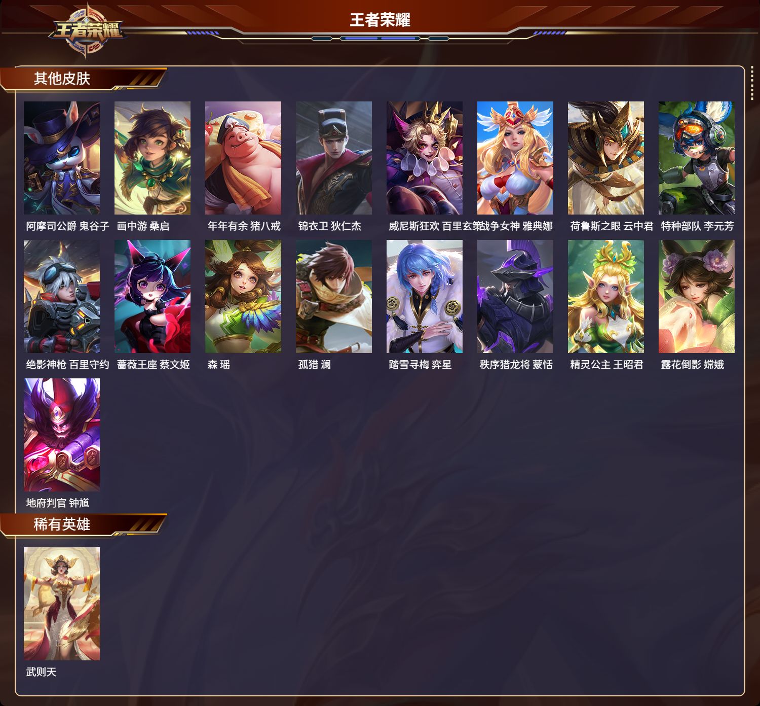 【53,其他皮肤】伊势巫女,大乔,金属狂潮,高渐离,战争骑士,夏侯惇,芝加哥教父,黄忠,潮流仙人,老夫子,三太子,哪吒,棒球奇才,沈梦溪,极冰防御线,盾山,龙域领主,铠,生化警戒,钟无艳,死神来了,曹操,超能战警,曹操,花见巫女,伽罗,未来旅行,孙膑,第七人偶,干将莫邪,万圣前夜,小乔,灼热之刃,李信,熊喵少女,阿古朵,海之征途,孙策,福禄兄弟,鲁班七号,帝国元帅,项羽,精灵王,后羿,冰刃幻境,镜,碧珀绯影,暃,星航指挥官,诸葛亮,魇语军师,司马懿,午夜歌剧院,元歌,启蛰,司空震,隐刃,兰陵王,花间舞,公孙离,异域舞娘,貂蝉,街头旋风,裴擒虎,东海龙王,东皇太一,修竹墨客,上官婉儿,范海辛,李白,激情绿茵,马可波罗,阿摩司公爵,鬼谷子,画中游,桑启,年年有余,猪八戒,锦衣卫,狄仁杰,威尼斯狂欢,百里玄策,战争女神,雅典娜,荷鲁斯之眼,云中君,特种部队,李元芳,绝影神枪,百里守约,蔷薇王座,蔡文姬,森,瑶,孤猎,澜,踏雪寻梅,弈星,秩序猎龙将,蒙恬,精灵公主,王昭君,露花倒影,嫦娥,地府判官,钟馗,